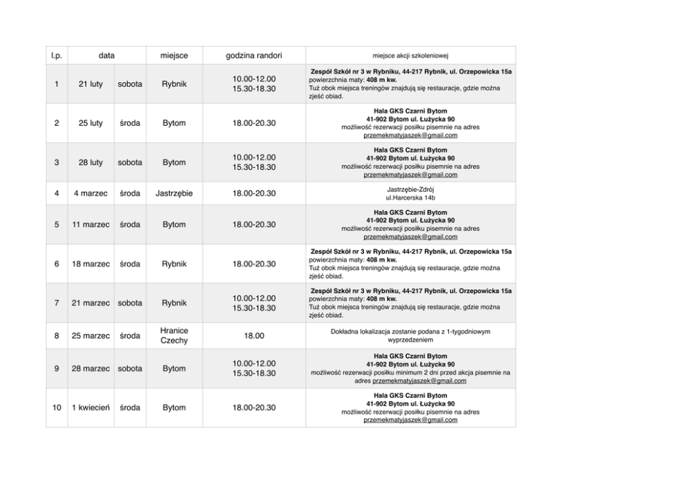 l.p. 1 2 data 21 luty 25 luty sobota środa miejsce godzina randori miejsce akcji szkoleniowej Rybnik 10.00-12.00 15.30-18.30 Zespół Szkół nr 3 w Rybniku, 44-217 Rybnik, ul. Orzepowicka 15a powierzchnia maty: 408 m kw. Tuż obok miejsca treningów znajdują się restauracje, gdzie można zjeść obiad. Bytom 18.00-20.30 Hala GKS Czarni Bytom 41-902 Bytom ul. Łużycka 90 możliwość rezerwacji posiłku pisemnie na adres [email protected] Hala GKS Czarni Bytom 41-902 Bytom ul. Łużycka 90 możliwość rezerwacji posiłku pisemnie na adres [email protected] 3 28 luty sobota Bytom 10.00-12.00 15.30-18.30 4 4 marzec środa Jastrzębie 18.00-20.30 Jastrzębie-Zdrój ul.Harcerska 14b 5 11 marzec środa Bytom 18.00-20.30 Hala GKS Czarni Bytom 41-902 Bytom ul. Łużycka 90 możliwość rezerwacji posiłku pisemnie na adres [email protected] 6 18 marzec środa Rybnik 18.00-20.30 Zespół Szkół nr 3 w Rybniku, 44-217 Rybnik, ul. Orzepowicka 15a powierzchnia maty: 408 m kw. Tuż obok miejsca treningów znajdują się restauracje, gdzie można zjeść obiad. Zespół Szkół nr 3 w Rybniku, 44-217 Rybnik, ul. Orzepowicka 15a powierzchnia maty: 408 m kw. Tuż obok miejsca treningów znajdują się restauracje, gdzie można zjeść obiad. 7 21 marzec sobota Rybnik 10.00-12.00 15.30-18.30 8 25 marzec Hranice Czechy 18.00 Dokładna lokalizacja zostanie podana z 1-tygodniowym wyprzedzeniem Bytom 10.00-12.00 15.30-18.30 Hala GKS Czarni Bytom 41-902 Bytom ul. Łużycka 90 możliwość rezerwacji posiłku minimum 2 dni przed akcja pisemnie na adres [email protected] 18.00-20.30 Hala GKS Czarni Bytom 41-902 Bytom ul. Łużycka 90 możliwość rezerwacji posiłku pisemnie na adres [email protected] 9 10 środa 28 marzec sobota 1 kwiecień środa Bytom