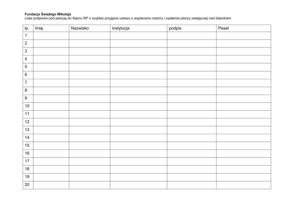 Fundacja Świętego Mikołaja Lista podpisów pod petycją do Sejmu RP o szybkie przyjęcie ustawy o wspieraniu rodziny i systemie pieczy zastępczej nad dzieckiem lp. 1 2 3 4 5 6 7 8 9 10 11 12 13 14 15 16 17 18 19 20 Imię Nazwisko instytucja podpis Pesel