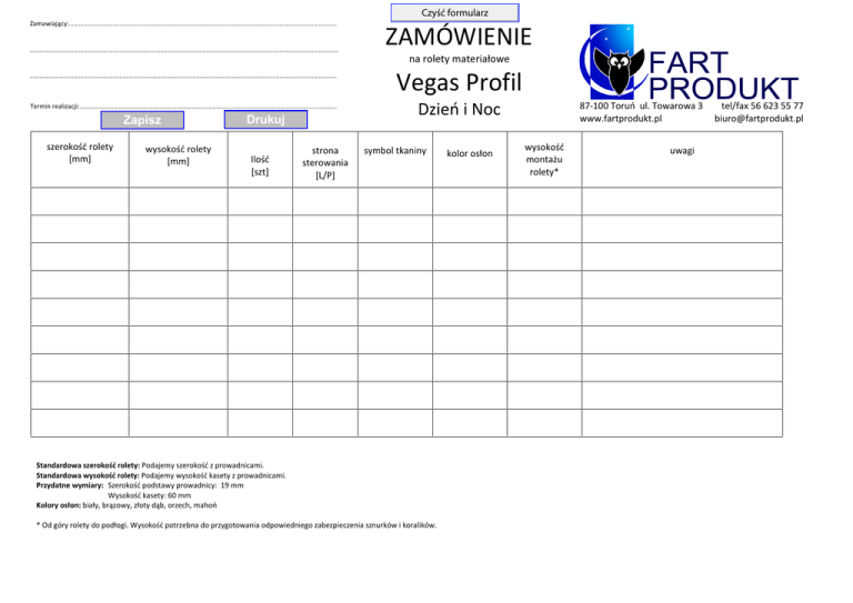 Zamawiający:……………………………………………………………………………………………………………………………………………….. ……………………………………………………………………………………………………………………………………………………………………… …………………………………………………………………………………………………………………………………………………………………….. Termin realizacji:………………………………………………………………………………………………………………………………………….. Zapisz szerokość rolety [mm] wysokość rolety [mm] Drukuj Ilość [szt] strona sterowania [L/P] ZAMÓWIENIE Czyść formularz Vegas Profil na rolety materiałowe Dzień i Noc symbol tkaniny Standardowa szerokość rolety: Podajemy szerokość z prowadnicami. Standardowa wysokość rolety: Podajemy wysokość kasety z prowadnicami. Przydatne wymiary: Szerokość podstawy prowadnicy: 19 mm Wysokość kasety: 60 mm Kolory osłon: biały, brązowy, złoty dąb, orzech, mahoń * Od góry rolety do podłogi. Wysokość potrzebna do przygotowania odpowiedniego zabezpieczenia sznurków i koralików. kolor osłon 87-100 Toruń ul. Towarowa 3 www.fartprodukt.pl wysokość montażu rolety* uwagi tel/fax 56 623 55 77 [email protected]