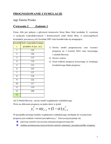 PROGNOZOWANIE I SYMULACJE mgr Żaneta Pruska Ćwiczenia 2 Zadanie 1 Firma Alfa jest jednym z głównych dostawców firmy Beta. Ilość produktu X, wyrażona w tysiącach wyprodukowanych i dostarczonych sztuk firmie Beta, w poszczególnych kwartałach, począwszy od I kwartału 2007 roku kształtowała się następująco: Kwartał Ilość wyprodukowanego t produktu X [tys. szt.] 1 125 prognozę na I kwartał 2010 roku korzystając 2 126 z modelu Browna. 3 115 2) Stwórz wykres. 4 118 3) Oceń trafność prognozy korzystając ze średniego 5 112 6 125 7 127 8 118 9 122 10 117 11 119 12 108 1) Stwórz model prognostyczny oraz wyznacz kwadratowego błędu prognozy. 13 Ad 2) Model Browna - prosty model wygładzania wykładniczego Wzór na obliczanie prognozy na jeden okres w przód yt* yt 1 (1 ) yt*1 W przypadku prostego modelu wygładzania wykładniczego niezbędne do wyznaczenia prognozy jest ustalenie wartości początkowej y1 *. Zazwyczaj przyjmuje się: pierwszą wartość rzeczywistą zmiennej prognozowanej lub średnią arytmetyczną rzeczywistych wartości zmiennej z przyjętej próbki wstępnej. 1 Następnie można dokonać prognozy według modelu Browna korzystając ze wzoru: yt* yt 1 (1 ) yt*1 2 Ad 3). Oceń trafność prognozy korzystając ze średniego kwadratowego błędu prognozy Zbudowany model Browna, z przyjętą wcześniej wartością parametru wygładzania α, nie musi być „najlepszy” do prognozowania danego szeregu czasowego. Za model „najlepszy” uznaje się model z taką wartością parametru α, dla którego błędy ex post prognoz wygasłych będą najmniejsze. Dużym ułatwieniem w celu obliczenia średniego kwadratowego błędu prognozy jest zastosowanie funkcji matematycznej SUMA.XMY.2. W celu znalezienia „najlepszego” modelu powinno się tak zmienić wartości parametru α, aby uzyskać jak najmniejszą wartość funkcji SUMA.XMY.2. Bardzo pomocny do rozwiązania tego zadania jest dodatek Solver. Okno dialogowe parametrów Solvera zostało przedstawione na poniższym rysunku. 3 Wartość „najlepszej” wartości α dla badanego szeregu czasowego wynosi 0,15. Średni kwadratowy błąd prognozy uległ zmniejszeniu do 6,04 tys. szt. 4 produkt X [tys.szt] 130 125 120 rzeczywista ilość produktu X 115 prognoza 110 105 1 2 3 4 5 6 7 8 9 10 11 12 PR O N G O ZA kwartał ZADANIE 2 Ilość przetransportowanych jednostek paletowych [szt.] przez przedsiębiorstwo XYZ realizujące usługi transportowo-spedycyjne w poszczególnych miesiącach 2009 roku wynosi: Miesiąc Ilość jednostek t paletowych [szt.] Zbuduj model prognostyczny oraz wyznacz prognozę dla 1 1254 przedsiębiorstwa XYZ na styczeń oraz luty 2010 roku 2 1405 korzystając z: 3 1595 4 1846 przyjmując: F1 = y1 , S1 = y2 – y1 5 2042 modelu funkcji liniowej, 6 2287 modelu funkcji wykładniczej, 7 2620 modelu funkcji potęgowej, 8 2620 modelu funkcji logarytmicznej. 9 2880 10 3216 11 3500 12 3800 modelu Holta, 5 Wzór na obliczenie prognozy według modelu Holta: yt* Ft 1 St 1 Do budowy liniowego modelu wygładzania wykładniczego Holta potrzebne są początkowe wartości F i S czyli F1 i S1. Jeden z możliwych wariantów to: F1 = y1 , S1 = y2 – y1 Po wyznaczeniu wartości początkowych można zastosować wzory: Ft yt 1 Ft 1 St 1 St Ft Ft 1 1 St 1 6 Prognoza: Dla modelu Holta, podobnie jak dla zbudowanego modelu Browna w poprzednim zadaniu, wykorzystujemy dodatek Solver oraz funkcję matematyczną SUMA.XMY.2 w celu znalezienia „najlepszego” modelu. Okno dialogowe parametrów Solvera zostało przedstawione na poniższym rysunku. 7 Wyniki uzyskane po zastosowaniu dodatku Solver dla wyznaczenia „najlepszego” modelu. 8 MODEL LINIOWY yt t gdzie: t – kolejna jednostka czasu α, β – estymowane parametry W celu uzyskania wartości estymowanych parametrów oraz parametru dopasowania R2 (współczynnik determinacji) można posłużyć się poleceniem: „Dodaj linię trendu”. Linię trendu dodaje się do wcześniej zbudowanego wykresu. Okno dialogowe: Wykres / Dodaj linię trendu - Typ Okno dialogowe: Wykres / Dodaj linię trendu – Opcje 9 Dzięki temu uzyskujemy wykres wraz z linią trendu / wykres poniżej. 4000 y = 228,83x + 934,7 jednostki paletowe 3500 2 R = 0,9909 3000 dane rzeczywiste 2500 Liniowy (dane rzeczywiste) 2000 1500 1000 1 2 3 4 5 6 7 8 9 10 11 12 miesiące Dodatkowo, w przypadku trendu liniowego, do oszacowania parametrów można wykorzystać funkcję: REGLINP. W wyniku zastosowania tej funkcji, uzyskuje się tablicę zawierającą następujące informacje: Współczynnik kierunkowy funkcji trendu: b Błąd oceny parametru b: s(b) Współczynnik determinacji:R2 Statystyka Fishera Regresyjna suma kwadratów odchyleń: ssreg Wyraz wolny funkcji trendu: a Błąd oceny parametru a: s(a) Standardowy błąd oceny modelu: s Liczba stopni swobody Resztowa suma kwadratów odchyleń: ssresid Okno dialogowe: funkcja REGLINP : 10 Formułę należy wprowadzić do zaznaczonego obszaru arkusza, który powinien mieć wymiar pożądanej tablicy wynikowej (2 kolumny, 5 wierszy). Po uzupełnieniu okna dialogowego należy użyć kombinacji klawiszy : Ctrl + Shift + Enter. Znając wartości parametrów wiemy, iż oszacowany model przyjmuje postać : . Na jego podstawie możliwe jest dokonanie prognoz: 11 MODEL FUNKCJI WYKŁADNICZEJ yt * e *t e – liczba Euler’a - e ~ 2,71 W celu uzyskania wartości estymowanych parametrów oraz parametru dopasowania R2 (współczynnik determinacji) można posłużyć się poleceniem: „Dodaj linię trendu”. Okno dialogowe: Wykres: 4500 0,0994x y = 1198,7e jednostki paletowe 4000 2 R = 0,9863 3500 dane rzeczywiste 3000 Wykł. (dane rzeczywiste) 2500 2000 1500 1000 1 2 3 4 5 6 7 8 9 10 11 12 miesiące Dodatkowo, w przypadku modelu wykładniczego, do oszacowania parametrów można wykorzystać funkcję: REGEXPP: 12 Znając wartości parametrów możliwe jest zbudowanie modelu prognostycznego: 13 MODEL FUNKCJI POTĘGOWEJ yt t 4000 0,4626 y = 1058,5x jednostk