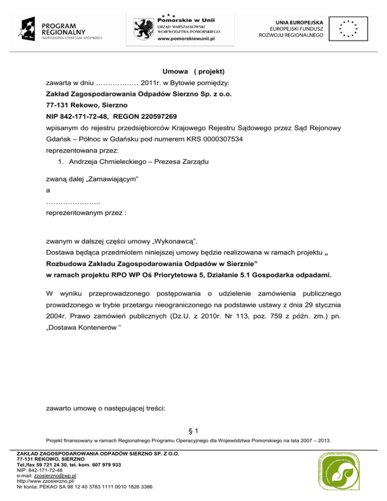 Umowa ( projekt) zawarta w dniu ……………… 2011r. w Bytowie pomiędzy: Zakład Zagospodarowania Odpadów Sierzno Sp. z o.o. 77-131 Rekowo, Sierzno NIP 842-171-72-48, REGON 220597269 wpisanym do rejestru przedsiębiorców Krajowego Rejestru Sądowego przez Sąd Rejonowy Gdańsk – Północ w Gdańsku pod numerem KRS 0000307534 reprezentowana przez: 1. Andrzeja Chmieleckiego – Prezesa Zarządu zwaną dalej „Zamawiającym” a ………………….. reprezentowanym przez : zwanym w dalszej części umowy „Wykonawcą”. Dostawa będąca przedmiotem niniejszej umowy będzie realizowana w ramach projektu „ Rozbudowa Zakładu Zagospodarowania Odpadów w Sierznie” w ramach projektu RPO WP Oś Priorytetowa 5, Działanie 5.1 Gospodarka odpadami. W wyniku przeprowadzonego postępowania o udzielenie zamówienia publicznego prowadzonego w trybie przetargu nieograniczonego na podstawie ustawy z dnia 29 stycznia 2004r. Prawo zamówień publicznych (Dz.U. z 2010r. Nr 113, poz. 759 z późn. zm.) pn. „Dostawa Kontenerów ” zawarto umowę o następującej treści: §1 Projekt finansowany w ramach Regionalnego Programu Operacyjnego dla Województwa Pomorskiego na lata 2007 – 2013. ZAKŁAD ZAGOSPODAROWANIA ODPADÓW SIERZNO SP. Z O.O. 77-131 REKOWO, SIERZNO Tel./fax 59 721 24 30, tel. kom. 607 979 933 NIP: 842-171-72-48 e-mail: [email protected] http://www.zzosierzno.pl/ Nr konta: PEKAO SA 98 12 40 3783 1111 0010 1826 3386 1.Przedmiotem niniejszej umowy jest zakup: 1) 3 (trzech) sztuk kontenerów o pojemności 32 m3 oraz 2) 3 (trzech) sztuk kontenerów o pojemności 30 m3 2. Kontenery wymienione w ust. 1 mają być fabrycznie nowe, nieuŜywane, wykonane zgodnie z opisem przedmiotu zamówienia. 3. Szczegółowy opis przedmiotu zamówienia, w tym parametry techniczne i wyposaŜenie zostały szczegółowo opisane w Specyfikacji Istotnych Warunków Zamówienia oraz w złoŜonej ofercie, które stanowią integralną część niniejszej umowy. 4. Wskazane w ust. 1 kontenery naleŜy dostarczyć do siedziby Zamawiającego. 5.Wykonawca w ramach dostawy zapewni podstawowe przeszkolenie personelu Zamawiającego w zakresie obsługi dostarczonych kontenerów. 6.Najpóźniej w dniu dostawy, naleŜy dołączyć wydaną przez producenta instrukcje obsługi w języku polskim. §2 Wykonawca zobowiązuje się do wykonania przedmiotu zamówienia zgodnie z niniejszą umową, obowiązującymi przepisami, normami oraz zasadami wiedzy technicznej. § 3 1. Przedmiot zamówienia naleŜy dostarczyć do dnia 1 lipca 2011 roku. 2. Wykonawca nie później niŜ 2 dni przed planowanym terminem dostawy zawiadomi Zamawiającego o dokładnym terminie dostawy (data i godzina). §4 1.Wykonawca udzieli Zamawiającemu gwarancji jakości na dostarczone kontenery i ich wyposaŜenie, co zostanie potwierdzone w wydanym - najpóźniej w dniu odbioru przedmiotu zamówienia - dokumencie gwarancyjnym określającym warunki gwarancji, z uwzględnieniem poniŜszych postanowień. 2.Okres gwarancji wynosi 24 miesiące, i liczony jest od daty dostawy, potwierdzonej protokołem odbioru. Projekt finansowany w ramach Regionalnego Programu Operacyjnego dla Województwa Pomorskiego na lata 2007 – 2013. ZAKŁAD ZAGOSPODAROWANIA ODPADÓW SIERZNO SP. Z O.O. 77-131 REKOWO, SIERZNO Tel./fax 59 721 24 30, tel. kom. 607 979 933 NIP: 842-171-72-48 e-mail: [email protected] http://www.zzosierzno.pl/ Nr konta: PEKAO SA 98 12 40 3783 1111 0010 1826 3386 3.W przypadku, gdy w okresie gwarancji Zamawiający stwierdzi wady lub usterki w zakupionych kontenerach obowiązany jest o tym fakcie niezwłocznie powiadomić Wykonawcę. 4.Wykonawca obowiązany jest udzielić informacji o sposobie załatwienia reklamacji, faksem lub drogą mailową w terminie 48 godzin od daty jej otrzymania. Brak odpowiedzi na reklamację oznacza jej uznanie. 5.Wykonawca moŜe nie uznać reklamacji wyłącznie w przypadku, gdy wykaŜe Ŝe stwierdzone wady powstały na skutek nieprawidłowej eksploatacji przedmiotu zamówienia przez Zamawiającego. 6.Wykonawca zobowiązany jest usunąć wady niezwłocznie, bezpłatnie w terminie uzgodnionym przez strony, w przypadkach wad szczególnie skomplikowanych nie później niŜ w terminie 14 dni od dnia uznania reklamacji. 7.Wykonawca zobowiązany jest do wymiany kontenera na nowy, wolny od wad, w przypadku dwukrotnej bezskutecznej naprawy. Wówczas termin gwarancji biegnie na nowo i liczony jest od dnia dostarczenia do siedziby Zamawiającego nowego, wolnego od wad kontenera. Zdanie drugie stosuje się odpowiednio w razie wymiany części kontenera. 8.W przypadku naprawy termin gwarancji wydłuŜony zostanie o okres, w którym Zamawiający nie mógł korzystać z kontenera, wskutek wady objętej gwarancją. Okres niemoŜności korzystania liczony będzie od dnia i godziny powiadomienia o wadzie, o którym mowa w ust. 3. 9. Naprawy w miarę moŜliwości wykonywane będą w siedzibie Zamawiającego. Ewentualne koszty transportu kontenera, wszelkich jego elementów i części zamiennych obciąŜać będą Wykonawcę. Projekt finansowany w ramach Regionalnego Programu Operacyjnego dla Województwa Pomorskiego na lata 2007 – 2013. ZAKŁAD ZAGOSPODAROWANIA ODPADÓW SIERZNO SP. Z O.O. 77-131 REKOWO, SIERZNO Tel./fax 59 721 24 30, tel. kom. 607 979 933 NIP: 842-171-72-48 e-mail: [email protected] http://www.zzosierzno.pl/ Nr konta: PEKAO SA 98 12 40 3783 1111 0010 1826 3386 §5 1.Strony ustalają wynagrodzenie ryczałtowe za realizację przedmiotu zamówienia, w kwocie netto ……………., słownie: powiększone o obowiązującą stawkę podatku VAT, wynagrodzenie w kwocie brutto wynosi…………., słownie: ….. , 2.Wynagrodzenie określone w ust. 1 płatne będzie na podstawie faktury VAT wystawionej przez Wykonawcę, w terminie 30 dni od dnia jej wystawienia. 3.Podstawą wystawienia faktury VAT będzie protokół bezusterkowego odbioru całego przedmiotu zamówienia. 4.Wynagrodzenie Wykonawcy ma charakter ryczałtowy i obejmuje wsze