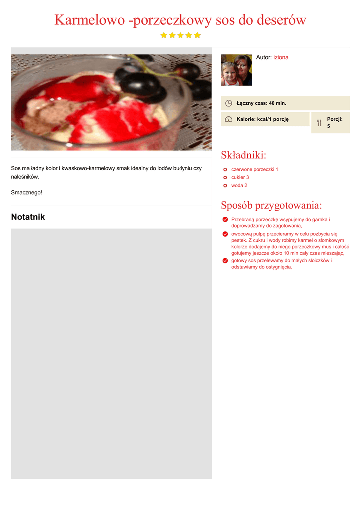 Karmelowo porzeczkowy sos do deserów Autor: iziona Łączny czas: 40 min. Kalorie: kcal/1 porcję Porcji: 5 Składniki: Sos ma ładny kolor i kwaskowokarmelowy smak idealny do lodów budyniu czy naleśników. czerwone porzeczki 1 cukier 3 woda 2 Smacznego! Sposób przygotowania: Notatnik Przebraną porzeczkę wsypujemy do garnka i doprowadzamy do zagotowania, owocową pulpę przecieramy w celu pozbycia się pestek. Z cukru i wody robimy karmel o słomkowym kolorze dodajemy do niego porzeczkowy mus i całość gotujemy jeszcze około 10 min cały czas mieszając, gotowy sos przelewamy do małych słoiczków i odstawiamy do ostygnięcia.
