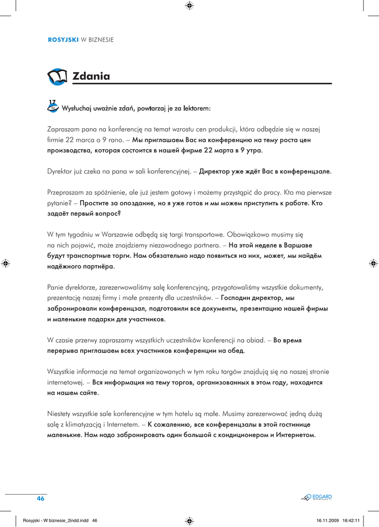 Rosyjski w biznesie 17 Zdania Wysłuchaj uważnie zdań, powtarzaj je za lektorem: Zapraszam pana na konferencję na temat wzrostu cen produkcji, która odbędzie się w naszej firmie 22 marca o 9 rano. – Мы приглашаем Вас на конференцию на тему роста цен производства, которая состоится в нашей фирме 22 марта в 9 утра. Dyrektor już czeka na pana w sali konferencyjnej. – Директор уже ждёт Вас в конференцзале. Przepraszam za spóźnienie, ale już jestem gotowy i możemy przystąpić do pracy. Kto ma pierwsze pytanie? – Простите за опоздание, но я уже готов и мы можем приступить к работе. Кто задаёт первый вопрос? W tym tygodniu w Warszawie odbędą się targi transportowe. Obowiązkowo musimy się na nich pojawić, może znajdziemy niezawodnego partnera. – На этой неделе в Варшаве будут транспортные торги. Нам обязательно надо появиться на них, может, мы найдём надёжного партнёра. Panie dyrektorze, zarezerwowaliśmy salę konferencyjną, przygotowaliśmy wszystkie dokumenty, prezentację naszej firmy i małe prezenty dla uczestników. – Господин директор, мы забронировали конференцзал, подготовили все документы, презентацию нашей фирмы и маленькие подарки для участников. W czasie przerwy zapraszamy wszystkich uczestników konferencji na obiad. – Во время перерыва приглашаем всех участников конференции на обед. Wszystkie informacje na temat organizowanych w tym roku targów znajdują się na naszej stronie internetowej. – Вся информация на тему торгов, организованных в этом году, находится на нашем сайте. Niestety wszystkie sale konferencyjne w tym hotelu są małe. Musimy zarezerwować jedną dużą salę z klimatyzacją i Internetem. – К сожалению, все конференцзалы в этой гостинице маленькие. Нам надо забронировать один большой с кондиционером и Интернетом. 46 Rosyjski - W biznesie_2indd.indd 46 16.11.2009 16:42:11 CD 1 lekcja 6 18 Dialog Wysłuchaj dialogu, powtarzaj poszczególne kwestie za lektorami: –У важаемые участники, меня зовут Владимир Владимирович. Сегодня я буду выполнять функцию ведущего бизнес-конференции в нашей фирме. Тема нашей встречи: как добиться успеха в продаже продукции компании «Одежда» за рубежом и как уберечь заработанные деньги от инфляции. Гости нашей конференции это: Пётр Иванович – главный директор нашей компании, Анна Петровна – директор по экспорту продукции, Андрей Кузьмич – директор по производству и Екатерина Валентиновна – аналитик рынка. Господин директор, скажите, пожалуйста, несколько слов о продукции Вашей компании. Drodzy uczestnicy, nazywam się Władimir Władmirowicz. Będę dzisiaj pełnić funkcję prowadzącego konferencję biznesową w naszej firmie. Tematem naszego spotkania jest: jak osiągnąć sukces w sprzedaży produktów firmy Odzież za granicą i jak ochronić pieniądze przed inflacją? Gośćmi naszej konferencji będą: Piotr Iwanowicz – główny dyrektor naszej firmy, Anna Pietrowna – dyrektor do spraw eksportu produkcji, Andriej Kuzmicz – dyrektor produkcji i Jekaterina Walentinowna – analityk rynku. Panie dyrektorze, proszę powiedzieć kilka słów na temat produkcji pańskiej firmy. –М еня зовут Пётр Иванович и я – главный директор. Самое главное в нашей компании это то, что у нас 100% польский капитал. Мы производим одежду – в последнее время мы сосредоточились на производстве детской одежды. Думаю, что рынок одежды быстро развивается. Но на эту тему выскажется Екатерина Валентиновна – аналитик рынка. Nazywam się Piotr Iwanowicz i jestem głównym dyrektorem. Najważniejsze dla naszej firmy jest to, że mamy w 100% polski kapitał. Produkujemy odzież, a w ostatnim czasie skupiliśmy się na produkcji ubrań dziecięcych. Myślę, że rynek odzieżowy szybko się rozwija. Ale na ten temat wypowie się Jekaterina Walentinowna – analityk rynku. –С пасибо большое. Да, рынок детской одежды начинает бурно расти. Большая доля рынка принадлежит западным мировым компаниям, за ними стоим мы – локальные игроки. Наши продукты соответствуют цене. Наша марка, качество влияют на выбор потребителя – это прежде всего беременные женщины, у которых разный социальный статус, возраст и сфера деятельности. Мы продаём свои товары в России, но на эту тему выскажется Анна Петровна, директор по э