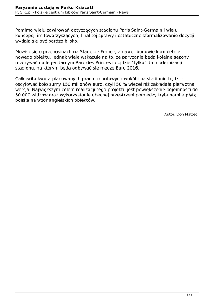Paryżanie zostają w Parku Książąt! PSGFC.pl - Polskie centrum kibiców Paris Saint-Germain - News Pomimo wielu zawirowań dotyczących stadionu Paris Saint-Germain i wielu koncepcji im towarzyszących, finał tej sprawy i ostateczne sformalizowanie decyzji wydają się być bardzo blisko. Mówiło się o przenosinach na Stade de France, a nawet budowie kompletnie nowego obiektu. Jednak wiele wskazuje na to, że paryżanie będą kolejne sezony rozgrywać na legendarnym Parc des Princes i dojdzie "tylko" do modernizacji stadionu, na którym będą odbywać się mecze Euro 2016. Całkowita kwota planowanych prac remontowych wokół i na stadionie będzie oscylować koło sumy 150 milionów euro, czyli 50 % więcej niż zakładała pierwotna wersja. Największym celem realizacji tego projektu jest powiększenie pojemności do 50 000 widzów oraz wykorzystanie obecnej przestrzeni pomiędzy trybunami a płytą boiska na wzór angielskich obiektów. Autor: Don Matteo 1/1 Powered by TCPDF (www.tcpdf.org)