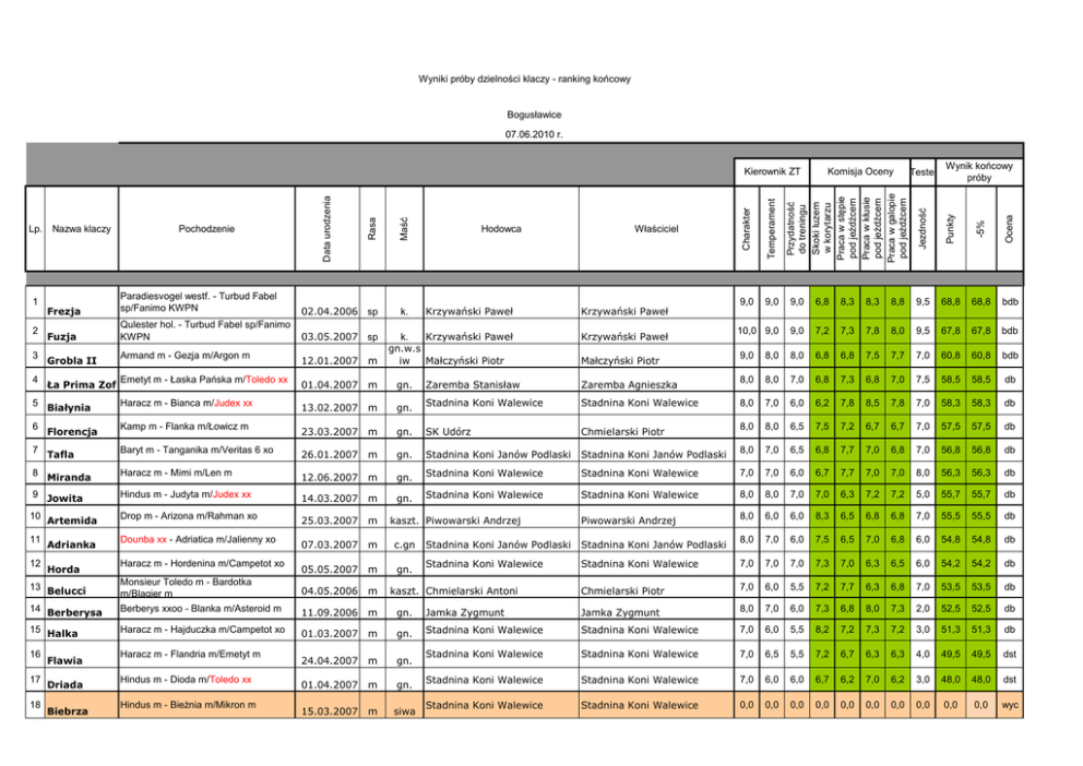 Wyniki próby dzielności klaczy - ranking końcowy Bogusławice 07.06.2010 r. Qulester hol. - Turbud Fabel sp/Fanimo KWPN 03.05.2007 sp Ocena Fuzja -5% k. Punkty sp Wynik końcowy próby Jezdność 02.04.2006 Hodowca Przydatność do treningu Skoki luzem w korytarzu Praca w stępie pod jeźdźcem Praca w kłusie pod jeźdźcem Praca w galopie pod jeźdźcem Paradiesvogel westf. - Turbud Fabel sp/Fanimo KWPN Pochodzenie Tester Temperament Frezja Nazwa klaczy Komisja Oceny Charakter 2 Maść 1 Rasa Lp. Data urodzenia Kierownik ZT 9,0 9,0 9,0 6,8 8,3 8,3 8,8 9,5 68,8 68,8 bdb 10,0 9,0 9,0 7,2 7,3 7,8 8,0 9,5 67,8 67,8 bdb Małczyński Piotr 9,0 8,0 8,0 6,8 6,8 7,5 7,7 7,0 60,8 60,8 bdb Właściciel Krzywański Paweł Krzywański Paweł Krzywański Paweł k. gn.w.s iw Małczyński Piotr Krzywański Paweł 3 Grobla II Armand m - Gezja m/Argon m 12.01.2007 m 4 Ła Prima Zof Emetyt m - Łaska Pańska m/Toledo xx 01.04.2007 m gn. Zaremba Stanisław Zaremba Agnieszka 8,0 8,0 7,0 6,8 7,3 6,8 7,0 7,5 58,5 58,5 db 5 Białynia Haracz m - Bianca m/Judex xx 13.02.2007 m gn. Stadnina Koni Walewice Stadnina Koni Walewice 8,0 7,0 6,0 6,2 7,8 8,5 7,8 7,0 58,3 58,3 db 6 Florencja Kamp m - Flanka m/Łowicz m 23.03.2007 m gn. SK Udórz Chmielarski Piotr 8,0 8,0 6,5 7,5 7,2 6,7 6,7 7,0 57,5 57,5 db 7 Tafla Baryt m - Tanganika m/Veritas 6 xo 26.01.2007 m gn. Stadnina Koni Janów Podlaski Stadnina Koni Janów Podlaski 8,0 7,0 6,5 6,8 7,7 7,0 6,8 7,0 56,8 56,8 db 8 Miranda Haracz m - Mimi m/Len m 12.06.2007 m gn. Stadnina Koni Walewice Stadnina Koni Walewice 7,0 7,0 6,0 6,7 7,7 7,0 7,0 8,0 56,3 56,3 db 9 Jowita Hindus m - Judyta m/Judex xx 14.03.2007 m gn. Stadnina Koni Walewice Stadnina Koni Walewice 8,0 8,0 7,0 7,0 6,3 7,2 7,2 5,0 55,7 55,7 db 10 Artemida Drop m - Arizona m/Rahman xo 25.03.2007 m Piwowarski Andrzej 8,0 6,0 6,0 8,3 6,5 6,8 6,8 7,0 55,5 55,5 db 11 Adrianka Dounba xx - Adriatica m/Jalienny xo 07.03.2007 m c.gn Stadnina Koni Janów Podlaski Stadnina Koni Janów Podlaski 8,0 7,0 6,0 7,5 6,5 7,0 6,8 6,0 54,8 54,8 db gn. Stadnina Koni Walewice Stadnina Koni Walewice 7,0 7,0 7,0 7,3 7,0 6,3 6,5 6,0 54,2 54,2 db Chmielarski Piotr 7,0 6,0 5,5 7,2 7,7 6,3 6,8 7,0 53,5 53,5 db 12 Horda Haracz m - Hordenina m/Campetot xo kaszt. Piwowarski Andrzej 05.05.2007 m 04.05.2006 m 14 Berberysa Monsieur Toledo m - Bardotka m/Blagier m Berberys xxoo - Blanka m/Asteroid m 11.09.2006 m gn. Jamka Zygmunt Jamka Zygmunt 8,0 7,0 6,0 7,3 6,8 8,0 7,3 2,0 52,5 52,5 db 15 Halka Haracz m - Hajduczka m/Campetot xo 01.03.2007 m gn. Stadnina Koni Walewice Stadnina Koni Walewice 7,0 6,0 5,5 8,2 7,2 7,3 7,2 3,0 51,3 51,3 db 16 Haracz m - Flandria m/Emetyt m 24.04.2007 m gn. Stadnina Koni Walewice Stadnina Koni Walewice 7,0 6,5 5,5 7,2 6,7 6,3 6,3 4,0 49,5 49,5 dst 01.04.2007 m gn. Stadnina Koni Walewice Stadnina Koni Walewice 7,0 6,0 6,0 6,7 6,2 7,0 6,2 3,0 48,0 48,0 dst 15.03.2007 m siwa Stadnina Koni Walewice Stadnina Koni Walewice 0,0 0,0 0,0 0,0 0,0 0,0 0,0 0,0 0,0 0,0 wyc 13 Belucci 17 18 Flawia Driada Biebrza Hindus m - Dioda m/Toledo xx Hindus m - Bieżnia m/Mikron m kaszt. Chmielarski Antoni