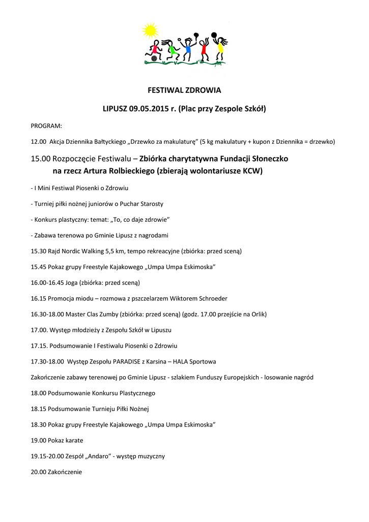 FESTIWAL ZDROWIA LIPUSZ 09.05.2015 r. (Plac przy Zespole Szkół) PROGRAM: 12.00 Akcja Dziennika Bałtyckiego „Drzewko za makulaturę” (5 kg makulatury + kupon z Dziennika = drzewko) 15.00 Rozpoczęcie Festiwalu – Zbiórka charytatywna Fundacji Słoneczko na rzecz Artura Rolbieckiego (zbierają wolontariusze KCW) - I Mini Festiwal Piosenki o Zdrowiu - Turniej piłki nożnej juniorów o Puchar Starosty - Konkurs plastyczny: temat: „To, co daje zdrowie” - Zabawa terenowa po Gminie Lipusz z nagrodami 15.30 Rajd Nordic Walking 5,5 km, tempo rekreacyjne (zbiórka: przed sceną) 15.45 Pokaz grupy Freestyle Kajakowego „Umpa Umpa Eskimoska” 16.00-16.45 Joga (zbiórka: przed sceną) 16.15 Promocja miodu – rozmowa z pszczelarzem Wiktorem Schroeder 16.30-18.00 Master Clas Zumby (zbiórka: przed sceną) (godz. 17.00 przejście na Orlik) 17.00. Występ młodzieży z Zespołu Szkół w Lipuszu 17.15. Podsumowanie I Festiwalu Piosenki o Zdrowiu 17.30-18.00 Występ Zespołu PARADISE z Karsina – HALA Sportowa Zakończenie zabawy terenowej po Gminie Lipusz - szlakiem Funduszy Europejskich - losowanie nagród 18.00 Podsumowanie Konkursu Plastycznego 18.15 Podsumowanie Turnieju Piłki Nożnej 18.30 Pokaz grupy Freestyle Kajakowego „Umpa Umpa Eskimoska” 19.00 Pokaz karate 19.15-20.00 Zespół „Andaro” - występ muzyczny 20.00 Zakończenie Wykłady towarzyszące: (sala wykładowa w Zespole Szkół w Lipuszu) 15.30 - „Skuteczne metody profilaktyki i zachowania zdrowia” - wykładowca Senior Menager Forever Living Products mgr antropolog Wiesław Micorek 16.00 - „Ciesz się zdrowiem i żyj w zgodzie z naturą” - wykładowca Senior Menager Forever Living Products mgr antropolog Wiesław Micorek 16.30 - „Bezpieczna żywność - od Pola do Stołu” – wykładowca pani kierownik Higieny Żywienia i Żywności Elżbieta Spiczak – Brzezińska- Powiatowa Stacja Epidemiologiczna 17.00 - „Najczęściej popełniane błędy pielęgnacyjne spowalniające rozwój psychoruchowy niemowląt” - wykładowca Agata Zioło – fizjoterapeuta „ Dobry start” 17.30 - „Wady postawy – skoliozy” - wykładowca Bartosz Chomiuk – fizjoterapeuta „Dobry start”