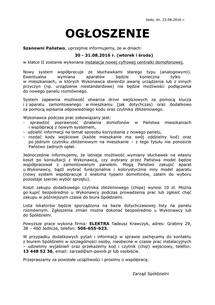 Jasło, dn. 23.08.2016 r. OGŁOSZENIE Szanowni Państwo, uprzejmie informujemy, że w dniach: 30 - 31.08.2016 r. (wtorek i środa) w klatce II zostanie wykonana instalacja nowej cyfrowej centralki domofonowej. Nowy system współpracuje ze słuchawkami starego typu (analogowymi). Ewentualna wymiana aparatów będzie konieczna tylko w mieszkaniach, w których Wykonawca stwierdzi awarię urządzenia lub z innych przyczyn (np. urządzenie niestandardowe) nie będzie możliwości podłączenia do nowego panelu rozmównego. System zapewnia możliwość otwarcia drzwi wejściowych za pomocą klucza i z aparatu zamontowanego w mieszkaniu (jak dotychczas) oraz dodatkowo za pomocą wpisania odpowiedniego kodu oraz czytnika zbliżeniowego. Wykonawca podczas prac zobowiązany jest: - sprawdzić poprawność działania domofonów w Państwa mieszkaniach i współpracę z nowym systemem, - udzielić informacji na temat sposobu korzystania z nowego panelu, - rozdać kody wejściowe (każde mieszkanie ma swój oddzielny kod) oraz po jednym czytniku zbliżeniowym na mieszkanie – z tego tytułu nie ponosicie Państwo żadnych opłat. Jednocześnie informujemy, że istnieje możliwość wymiany słuchawek na własny koszt po konsultacji z Wykonawcą, czy wybrany przez Państwa model będzie współpracował z zamontowanym panelem. Mogą Państwo zakupić aparat u Wykonawcy, bądź wybrać funkcjonalnie i kolorystycznie inny model aparatu (nowy system współpracuje z wieloma typami domofonów, zatem do wyboru pozostaje szeroki wybór sprzętu). Koszt zakupu dodatkowego czytnika zbliżeniowego (chipa) wynosi 10 zł. Można go kupić bezpośrednio u Wykonawcy podczas prowadzenia prac lub zgłosić chęć zakupu w późniejszym czasie do biura Spółdzielni. Lista lokatorów będzie sporządzona na bazie dotychczasowej listy na panelu rozmównym. Zgłoszenia zmian można dokonać bezpośrednio u Wykonawcy lub do Spółdzielni. Powyższe prace wykona firma: ELEKTRA Tadeusz Krawczyk, adres: Grabiny 29, 38 – 460 Jedlicze, telefon: 506-655-623. W przypadku dodatkowych pytań i informacji w sprawie zachęcamy do kontaktu z biurem Spółdzielni w szczególności osoby, nieobecne w czasie prac instalacyjnych – udzielimy wyjaśnień oraz przekażemy kod i czytnik (chip) wejściowy, telefon: 13 448 52 36, email: [email protected] lub osobiście. Przepraszamy za powstałe uciążliwości i prosimy o współpracę. Zarząd Spółdzielni