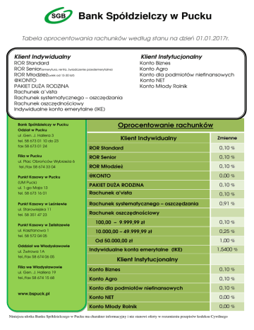 Bank Spółdzielczy w Pucku Tabela oprocentowania rachunków według stanu na dzie 01.01.2017r. Klient Indywidualny Klient Instytucjonalny ROR Standard ROR Senior(emerytura, renta, wiadczenie przedemerytalne) ROR Młodzie (wiek od 13-30 lat) @KONTO PAKIET DU A RODZINA Rachunek a’vista Rachunek systematycznego – oszcz dzania Rachunek oszcz dno ciowy Indywidualne konto emerytalne (IKE) Konto Biznes Konto Agro Konto dla podmiotów niefinansowych Konto NET Konto Młody Rolnik Oprocentowanie rachunków Bank Spółdzielczy w Pucku Odział w Pucku ul .Gen. J. Hallera 3 Klient Indywidualny tel. 58 673 01 10 do 23 Zmienne fax 58 673 01 24 ROR Standard 0,10 % Filia w Pucku ROR Senior 0,10 % tel./fax 58 674 33 04 ROR Młodzie 0,10 % Punkt Kasowy w Pucku @KONTO 0,00 % PAKIET DU A RODZINA 0,10 % tel. 58 673 16 01 Rachunek a’vista 0,10 % Punkt Kasowy w Le niewie Rachunek systematycznego – oszcz dzania 0,91 % ul. Plac Obro ców Wybrze a 6 (UM Puck) ul. 1-go Maja 13 ul. Starowiejska 11 tel. 58 351 47 23 Punkt Kasowy w elistrzewie ul. Kasztanowa 1 tel. 58 572 04 05 Oddział we Władysławowie ul. wirowa 1A Rachunek oszcz dno ciowy 100,00 – 9.999,99 zł 0,10 % 10.000,00 – 49.999,99 zł 0,25 % Od 50.000,00 zł 1,00 % Indywidualne konta emerytalne (IKE) tel./fax 58 674 06 05 Filia we Władysławowie ul. Gen. J. Hallera 19 tel./fax 58 674 15 68 www.bspuck.pl 1,5400 % Klient Instytucjonalny Konto Biznes 0,10 % Konto Agro 0,10 % Konto dla podmiotów niefinansowych 0,10 % Konto NET 0,00 % Konto Młody Rolnik 0,00 % Niniejsza ulotka Banku Spółdzielczego w Pucku ma charakter informacyjny i nie stanowi oferty w rozumieniu przepisów kodeksu Cywilnego Bank Spółdzielczy w Pucku Tabela oprocentowania depozytów depozytów według stanu na dzie 01.01.2017r. Bank Spółdzielczy w Pucku Odział w Pucku Lokaty terminowe Oprocentowanie obowi zuje od 01-01-2017r. 01 ul .Gen. J. Hallera 3 tel. 58 673 01 10 do 23 Zmienne WIBID 1M Stałe 1-- miesi czna 0,55 % 0,76 % 0,60 % 2-- miesi czna 0,60 % 0,81 % 0,65 % 3 - miesi czna 0,65 % 0,86 % 0,75 % 4--5 - miesi czna 0,70 % - 6 - miesi czna 0,85 % 1,06 % 9 - miesi czna 1,05 % - 10 - miesi czna 1,15 % - 12 - miesi czna 1,30 % 1,46 % 24 24-miesi czna 1,35 % 1,51 % fax 58 673 01 24 Filia w Pucku ul. Plac Obro ców Wybrze a 6 tel./fax 58 674 33 04 Punkt Kasowy w Pucku (UM Puck) ul. 1-go Maja 13 tel. 58 673 16 01 Punkt Kasowy w Le niewie ul. Starowiejska 11 tel. 58 351 47 23 Punkt Kasowy w elistrzewie ul. Kasztanowa 1 tel. 58 572 04 05 36 36-48-60-miesi czna 1,35 % - Oddział we Władysławowie ul. wirowa 1A tel./fax 58 674 06 05 Filia we Władysławowie ul. Gen. J. Hallera 19 Lokaty terminowe zakładane przez bankowo elektroniczn tel./fax 58 674 15 68 Zmienne - - 14 - dniowa eBank 0,60 % - - 1-- miesi czna eBank 0,90 % - - 3 - miesi czna eBank 1,10 % - - www.bspuck.pl Niniejsza ulotka Banku Spółdzielczego w Pucku ma charakter informacyjny i nie stanowi oferty w rozumieniu przepisów kodeksu Cywilnego