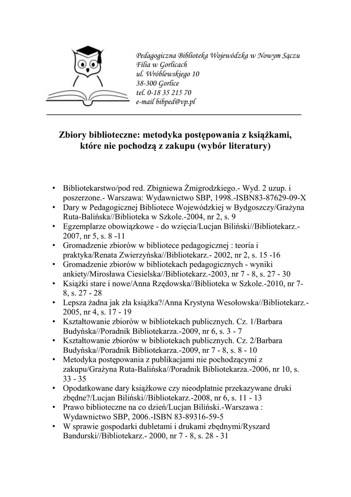 Pedagogiczna Biblioteka Wojewódzka w Nowym Sączu Filia w Gorlicach ul. Wróblewskiego 10 38-300 Gorlice tel. 0-18 35 215 70 e-mail [email protected] Zbiory biblioteczne: metodyka postępowania z książkami, które nie pochodzą z zakupu (wybór literatury) • Bibliotekarstwo/pod red. Zbigniewa Żmigrodzkiego.- Wyd. 2 uzup. i poszerzone.- Warszawa: Wydawnictwo SBP, 1998.-ISBN83-87629-09-X • Dary w Pedagogicznej Bibliotece Wojewódzkiej w Bydgoszczy/Grażyna Ruta-Balińska//Biblioteka w Szkole.-2004, nr 2, s. 9 • Egzemplarze obowiązkowe - do wzięcia/Lucjan Biliński//Bibliotekarz.2007, nr 5, s. 8 -11 • Gromadzenie zbiorów w bibliotece pedagogicznej : teoria i praktyka/Renata Zwierzyńska//Bibliotekarz.- 2002, nr 2, s. 15 -16 • Gromadzenie zbiorów w bibliotekach pedagogicznych - wyniki ankiety/Mirosława Ciesielska//Bibliotekarz.-2003, nr 7 - 8, s. 27 - 30 • Książki stare i nowe/Anna Rzędowska//Biblioteka w Szkole.-2010, nr 78, s. 27 - 28 • Lepsza żadna jak zła książka?/Anna Krystyna Wesołowska//Bibliotekarz.2005, nr 4, s. 17 - 19 • Kształtowanie zbiorów w bibliotekach publicznych. Cz. 1/Barbara Budyńska//Poradnik Bibliotekarza.-2009, nr 6, s. 3 - 7 • Kształtowanie zbiorów w bibliotekach publicznych. Cz. 2/Barbara Budyńska//Poradnik Bibliotekarza.-2009, nr 7 - 8, s. 8 - 10 • Metodyka postępowania z publikacjami nie pochodzącymi z zakupu/Grażyna Ruta-Balińska//Poradnik Bibliotekarza.-2006, nr 10, s. 33 - 35 • Opodatkowane dary książkowe czy nieodpłatnie przekazywane druki zbędne?/Lucjan Biliński//Bibliotekarz.-2008, nr 6, s. 11 - 13 • Prawo biblioteczne na co dzień/Lucjan Biliński.-Warszawa : Wydawnictwo SBP, 2006.-ISBN 83-89316-59-5 • W sprawie gospodarki dubletami i drukami zbędnymi/Ryszard Bandurski//Bibliotekarz.- 2000, nr 7 - 8, s. 28 - 31