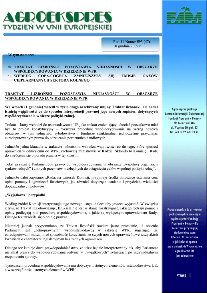 Rok 14 Numer 593 (47) 10 grudnia 2009 r. W tym numerze: Ö TRAKTAT LIZBOŃSKI POZOSTAWIA NIEJASNOŚCI W OBSZARZE WSPÓŁDECYDOWANIA W DZIEDZINIE WPR Ö WEDŁUG COPA-COGECA ZMNIEJSZYŁY SIĘ EMISJE GAZÓW CIEPLARNIANYCH SEKTORA ROLNEGO TRAKTAT LIZBOŃSKI POZOSTAWIA WSPÓŁDECYDOWANIA W DZIEDZINIE WPR NIEJASNOŚCI W OBSZARZE We wtorek (1 grudnia) wszedł w życie długo oczekiwany unijny Traktat lizboński, ale nadal istnieją wątpliwości co do sposobu interpretacji prawnej jego nowych zapisów, dotyczących współdecydowania w sferze polityki rolnej. Traktat – który wchodzi do ustawodawstwa UE jako traktat zmieniający, chociaż początkowo miał być to projekt konstytucyjny – rozszerza procedurę współdecydowania na szereg nowych obszarów, w tym rolnictwo, rybołówstwo i fundusze strukturalne, jednocześnie przyznając eurodeputowanym prawo do odrzucania porozumień handlowych. Jednakże jedna klauzula w traktacie lizbońskim wzbudza wątpliwości co do tego, które spośród uprawnień w odniesieniu do WPR, zachowają ministrowie w Radzie. Skłoniło to Komisję i Radę do zwrócenia się o poradę prawną w tej kwestii. Tekst przyznaje Parlamentowi prawo do współdecydowania w obszarze „wspólnej organizacji rynków rolnych” i „innych przepisów niezbędnych do osiągnięcia celów wspólnej polityki rolnej”. Jednakże dalej zapisano: „Rada, na wniosek Komisji, przyjmuje środki dotyczące ustalania cen, opłat, pomocy i ograniczeń ilościowych, jak również dotyczące ustalania i przydziału wielkości dopuszczalnych połowów”. „Wyjątkowe” przypadki Według źródeł Komisji interpretację tego nowego ustępu należałoby jeszcze wyjaśnić. W związku z tym, że Traktat już obowiązuje, Bruksela nie jest w stanie rozstrzygnąć, jakiego rodzaju pomoc i opłaty podlegają pod procedurę współdecydowania, a jakie są wyłącznym uprawnieniem Rady. Dlatego też zwróciła się o opinię prawną. Niemniej jednak przypomniano, że Traktat lizboński zawiera jasne przesłanie, iż obecnie Parlament jest „pełnoprawnym” współustawodawcą w zakresie WPR, sugerując, że eurodeputowani muszą mieć sposobność korzystania ze swych nowych uprawnień „we wszystkich kwestiach o charakterze legislacyjnym bez żadnych ograniczeń”. Dlatego też istnieje duże prawdopodobieństwo, że tekst będzie interpretowany tak, aby Parlament nie miał prawa do współdecydowania jedynie w „wyjątkowych” sytuacjach po indywidualnym rozpatrzeniu sprawy. Tymczasem procedura współdecydowania ma dotyczyć „istotnych elementów ustawodawstwa UE, a w szczególności istotnych elementów WPR”. STRONA 1 Komitety nabierają większego znaczenia Wyjaśniając w tym tygodniu dziennikarzom zmiany wprowadzone na mocy Traktatu lizbońskiego, brytyjski eurodeputowany z ugrupowania liberałów, specjalista w sprawach konstytucji, Andrew Duff powiedział, że pełne prawa w odniesieniu do WPR prawdopodobnie przyczynią się do zasadniczej zmiany składu i charakteru obecnych oraz przyszłych parlamentarnych komisji rolnych. Dotychczas były one zdominowane przez rolników lub bezpośrednich przedstawicieli ich interesów. - [Komisje] przyciągną teraz inne osoby, które chcą mieć duży wpływ na podejmowanie decyzji – oświadczył, przewidując, że powinna poprawić się jakość prac komisji. Na podstawie Traktatu lizbońskiego wzrosnąć ma również pozycja komisji ds. handlu międzynarodowego, ponieważ polityka handlowa należy do wyłącznej kompetencji Unii. Eurodeputowani będą mieli taki sam głos jak Rada w kwestii polityki handlowej – wymagana będzie zgoda obydwu instytucji (na ogół większością kwalifikowaną w Radzie) w celu ratyfikacji nowych układów handlowych takich, jak przyszłe porozumienie w ramach Rundy Doha. Niemniej jednak Komisja Europejska zachowuje wyłączne prawo do negocjacji na forum WTO w imieniu całego bloku państw, lecz obecnie jej mandat zależy w takim samym stopniu od stanowiska Parlamentu jak Rady. Poza zdobyciem prawa veta wobec porozumienia z Doha eurodeputowani będą po raz pierwszy współustawodawcami w zakresie innych aspektów polityki handlowej takich, jak środki antydumpingowe. Debaty Rady bardziej otwarte Inna kluczowa zmiana wprowadzona na mocy Traktatu Lizbońskiego przewiduje, że dyskusje w „sprawach legislacyjnych” staną się publicznymi debatami, dzięki czemu stanowiska państw członkowskich będą bacznie obserwowane. Niemniej jednak ministrowie będą mogli prowadzić za zamkniętymi drzwiami obrady „nie dotyczące spraw legislacyjnych”. Jak podają źródła Rady, debaty w sprawie przyszłości WPR – odbywające się przed składaniem konkretnych wniosków legislacyjnych – będą nadal mogły być prowadzon bez podawania ich do wiadomości publicznej. W Traktacie dodano jeszcze jeden poziom „odpowiedzialności” zawarty w przepisie przyznającym parlamentom krajowym osiem tygodni na sprawdzenie, czy wszystkie nowe wnioski Komisji są „zgodne z zasadą pomocniczości”. Pozwoli im to na sygnalizowanie pojawienia się ustawodawstwa wychodzącego poza kompetencje UE. Hiszpański socjalistyczny eurodeputowany Romón Jáuregui powiedział reporterom, że nowe procedury nie powinny być stosowane w całej swej rozciągłości przez parlamenty krajowe, które muszą zaakceptować zasadę cedowania suwerenności w niektórych obszarach, aby móc osiągnąć cele polityki europejskiej. Równe uprawnienia w odniesieniu do budżetu UE Dotychczas ministrowie z Rady mieli ostatnie zdanie w sprawie finansowania WPR, która wchodziła do „obowiązkowych” wydatków unijnego budżetu. Obecnie Traktat lizboński uzależnia decyzje dotyczące całego budżetu od opinii obydwu instytucji: Rady i Parlamentu. STRONA 2 Daje to obydwu instytucjom równą pozycję we wszystkich obszarach i jednocześnie znosi uprzednie „ostatnie zdanie” Parlamentu w sprawie nieobowiązkowych wydatków. Wed