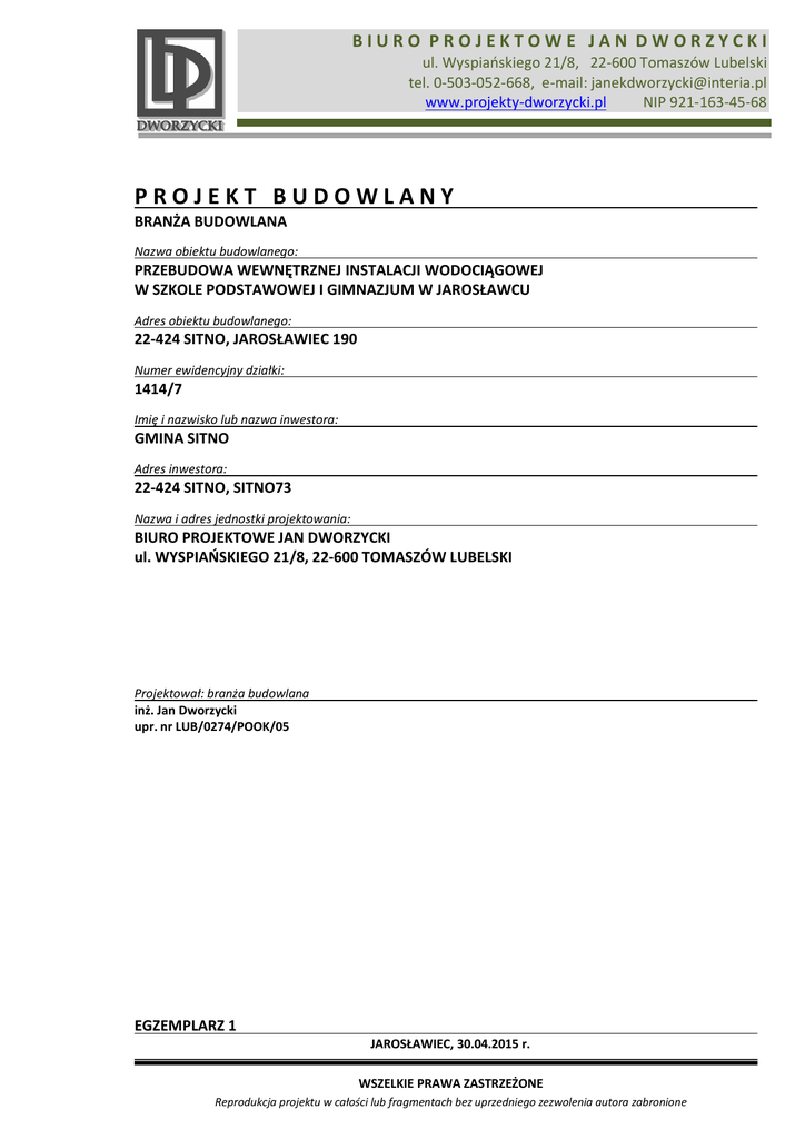 BIURO PROJEKTOWE JAN DWORZYCKI ul. Wyspiańskiego 21/8, 22-600 Tomaszów Lubelski tel. 0-503-052-668, e-mail: [email protected] www.projekty-dworzycki.pl NIP 921-163-45-68 PROJEKT BUDOWLANY BRANŻA BUDOWLANA Nazwa obiektu budowlanego: PRZEBUDOWA WEWNĘTRZNEJ INSTALACJI WODOCIĄGOWEJ W SZKOLE PODSTAWOWEJ I GIMNAZJUM W JAROSŁAWCU Adres obiektu budowlanego: 22-424 SITNO, JAROSŁAWIEC 190 Numer ewidencyjny działki: 1414/7 Imię i nazwisko lub nazwa inwestora: GMINA SITNO Adres inwestora: 22-424 SITNO, SITNO73 Nazwa i adres jednostki projektowania: BIURO PROJEKTOWE JAN DWORZYCKI ul. WYSPIAŃSKIEGO 21/8, 22-600 TOMASZÓW LUBELSKI Projektował: branża budowlana inż. Jan Dworzycki upr. nr LUB/0274/POOK/05 EGZEMPLARZ 1 JAROSŁAWIEC, 30.04.2015 r. WSZELKIE PRAWA ZASTRZEŻONE Reprodukcja projektu w całości lub fragmentach bez uprzedniego zezwolenia autora zabronione Zawartość opracowania : 1. Strona tytułowa. 2. Zawartość opracowania. 3. Opis techniczny. 3.1. Podstawa opracowania. 3.2. Przedmiot opracowania. 3.3. Stan istniejący wydzielonego pomieszczenia pompowni. 3.4. Projektowane elementy pomieszczenia pompowni wody na cele p.poż.. 3.5. Warunki ochrony przeciwpożarowej projektowanego pomieszczenia pompowni. 3.6. Projektowana charakterystyka energetyczna. 3.7. Uwagi końcowe. 4. Część graficzna: A01 Rzut parteru – pomieszczenie pompowni wody na cele p.poż.. skala 1:50 3. OPIS TECHNICZNY 3.1. Podstawa opracowania : zlecenie Zamawiającego, uzgodnienia z Zamawiającym, mapa sytuacyjna w skali 1 : 500, decyzja Komendanta Miejskiego Państwowej Straży Pożarnej w Zamościu z dnia 31 grudnia 2014 roku, z czynności kontrolno-rozpoznawczych z dnia 18 listopada 2014 r. przeprowadzonych w budynku Szkoły Podstawowej i Gimnazjum w Jarosławcu i zaleceń pokontrolnych. aktualne przepisy prawa w sprawie warunków technicznych, jakim powinny odpowiadać budynki i ich usytuowanie oraz w sprawie zakresu i formy projektu budowlanego. 3.2. Przedmiot opracowania : Przedmiotem opracowania jest projekt budowlany przebudowy wewnętrznej instalacji wodociągowej w budynku Szkoły Podstawowej i Gimnazjum w Jarosławcu, robót budowlanych związanych z wydzieleniem pomieszczenia pompowni wody na cele przeciwpożarowe, na działce nr ewidencyjny 1414/7, gmina Sitno. Opracowanie wykonywane jest na podstawie decyzji Komendanta Miejskiego Państwowej Straży Pożarnej w Zamościu z dnia 31 grudnia 2014 roku, z czynności kontrolnorozpoznawczych z dnia 18 listopada 2014 r. przeprowadzonych w budynku Szkoły Podstawowej i Gimnazjum w Jarosławcu i zaleceń pokontrolnych. 3.3. Stan istniejący wydzielonego pomieszczenia pompowni : Projektowane pomieszczenie pompowni wody na cele przeciwpożarowe zlokalizowano pod schodami, gdzie kiedyś znajdowało się wyjście z budynku (obecnie brak wyjścia, zamurowane). W miejscu planowanego pomieszczenia znajduje się umywalka, która przewidziana jest do demontażu i drzwi do biblioteki, które należy zdemontować i zamurować otwór. Ponadto należy zdemontować drzwi do schowka pod schodami. Istniejące posadzki z płytek terakotowych. Na ścianach tynki cementowo-wapienne malowane farbami olejnymi. Istniejąca instalacja elektryczna oświetleniowa. 3.4. Projektowane elementy pomieszczenia pompowni wody na cele p.poż.: 3.4.1. Ściana działowa wydzielająca pomieszczenie pompowni murowana z bloczków betonu komórkowego odmiany M600, grubości 12 cm, na zaprawie cementowo-wapiennej klasy M3 (MPa). 3.4.2. Zamurowania wykonać z bloczków betonu komórkowego odmiany M600, na zaprawie cementowo-wapiennej klasy M3 (MPa). 3.4.3. Nadproże w ściance działowej murowane typu kleina. 3.4.4. Zdemontować istniejące drzwi do biblioteki i schowka pod schodami. Zdemontować istniejącą umywalkę. 3.4.5. Ściany otynkowane cementowo-wapienne, malowane farbami olejnymi. 3.4.6. Obudowa kanału wentylacyjnego z płyt gipsowo-kartonowych Fireboard o grubości 2x 25mm, o odporności ogniowej EI120, system Knauf. 3.4.7. Wykonać kanał nawiewny do projektowanego pomieszczenia. 3.4.8. Zawilgocone tynki skuć, osuszyć ścianę i wykonać nowe tynki cementowo-wapienne. 3.4.9. Drzwi do projektowanego pomieszczenia o odporności ogniowej EI60. 3.4.10. W pomieszczeniu zainstalować grzejnik, wg branży sanitarnej. 3.5. Warunki ochrony przeciwpożarowej projektowanego pomieszczenia pompowni. Projektowana ścianka wydzielająca pomieszczenie pompowni o odporności ogniowej EI120. Istniejące ściany spełniają wymagania odporności ogniowej EI120. Istniejący strop pompowni spełnia wymagania odporności ogniowej REI120. Obudowa kanału wentylacyjnego z płyt gipsowo-kartonowych Fireboard o grubości 2x 25mm, o odporności ogniowej EI120, system Knauf. Drzwi do pompowni o odporności ogniowej EI60. Przepusty pożarowe instalacji projektowanych i istniejących wykonać o odporności ogniowej EI120. 3.6. Projektowana charakterystyka energetyczna budynku. Projektowane zmiany nie wpływają na charakterystykę energetyczną budynku. 3.7. Uwagi końcowe. Stosowane materiały do budowy obiektu winny posiadać odpowiednie aprobaty techniczne i dopuszczenia do stosowania w budownictwie. Przy wykonywaniu robót należy stosować wyroby dopuszczone do obrotu i stosowania w budownictwie, za które uważa się wyroby, dla których wydano certyfikat na znak bezpieczeństwa lub deklarację zgodności z Polską Normą lub aprobatę techniczną (Prawo Budowlane art. 10). Ustawa z dnia 16 kwietnia 2004 r. o wyrobach budowlanych (Dz. U. Nr 92, poz. 881) określa zasady wprowadzania do obrotu wyrobów budowlanych, zasady kontroli wyrobów budowlanych wprowadzonych do obrotu oraz zasady działania organów administracji publicznej w tej dziedzinie. Rozporządzenie Ministra Infrastruktury z dnia 11.08.2004 r. w sprawie sposobów deklarowania zgodności wyrobów budowlanych oraz sposobu znakowania ich znakiem budowlanym (Dz. U. nr 198/2004 poz. 2041) wydane na podstawie ww ustawy określa m. in. sposób 