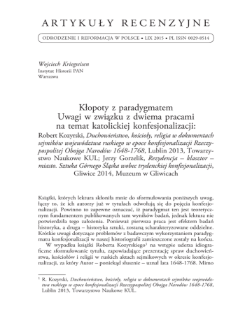 ARTYKUŁY RECENZYJNE ODRODZENIE I REFORMACJA W POLSCE ■ LIX 2015 ■ PL ISSN 0029-8514 Wojciech Kriegseisen Instytut Historii PAN Warszawa Kłopoty z paradygmatem Uwagi w związku z dwiema pracami na temat katolickiej konfesjonalizacji: Robert Kozyrski, Duchowieństwo, kościoły, religia w dokumentach sejmików województwa ruskiego w epoce konfesjonalizacji Rzeczypospolitej Obojga Narodów 1648-1768, Lublin 2013, Towarzystwo Naukowe KUL; Jerzy Gorzelik, Rezydencja – klasztor – miasto. Sztuka Górnego Śląska wobec trydenckiej konfesjonalizacji, Gliwice 2014, Muzeum w Gliwicach Książki, których lektura skłoniła mnie do sformułowania poniższych uwag, łączy to, że ich autorzy już w tytułach odwołują się do pojęcia konfesjonalizacji. Powinno to zapewne oznaczać, iż paradygmat ten jest teoretycznym fundamentem publikowanych tam wyników badań, jednak lektura nie potwierdziła tego założenia. Ponieważ pierwsza praca jest efektem badań historyka, a druga – historyka sztuki, zostaną scharakteryzowane oddzielne. Krótkie uwagi dotyczące problemów z badawczym wykorzystaniem paradygmatu konfesjonalizacji w naszej historiografii zamieszczone zostały na końcu. W wypadku książki Roberta Kozyrskiego1 na wstępie uderza idiograficzne sformułowanie tytułu, zapowiadające prezentację spraw duchowieństwa, kościołów i religii w ruskich aktach sejmikowych w okresie konfesjonalizacji, za który Autor – poniekąd słusznie – uznał lata 1648-1768. Mimo 1 R. Kozyrski, Duchowieństwo, kościoły, religia w dokumentach sejmików województwa ruskiego w epoce konfesjonalizacji Rzeczypospolitej Obojga Narodów 1648-1768, Lublin 2013, Towarzystwo Naukowe KUL. 260 Wojciech Kriegseisen to można było oczekiwać, że w tak obszernej pracy (512 stron) znajdziemy nie tylko przedstawienie materiału źródłowego, ale także analizę problematyki w kontekście procesów tytułowej konfesjonalizacji. Rozprawa skonstruowana została tematycznie. W obszernym Wstępie (s. 5-27) Autor przedstawił pole badawcze – ziemie województwa ruskiego, następnie omówił stan badań nad problematyką wyznaniową, koncentrując się na temacie spóźnionej katolickiej konfesjonalizacji w drugiej połowie XVII i pierwszej XVIII w., a wreszcie zajął się prezentacją badań nad samorządem szlacheckim, przede wszystkim ruskim. Następnie przeszedł do charakterystyki materiału źródłowego (jego trzon to akta sejmikowe opublikowane drukiem w serii Akta grodzkie i ziemskie z czasów Rzeczypospolitej Polskiej z Archiwum tak zwanego bernardyńskiego we Lwowie). W zakończeniu Wstępu znajdujemy charakterystykę zawartości książki, a w niej autoocenę z informacją o celach, które postawił sobie Autor: „Praca niniejsza prawdopodobnie stanowi pierwszą w historiografii polskiej próbę kompleksowego przedstawienia relacji łączących sejmikującą szlachtę z duchowieństwem i Kościołami różnych wyznań” (s. 12). R. Kozyrski omawia następnie konkretne zjawiska, nie formułuje jednak katalogu pytań badawczych. Czytelnik pozostaje nadal w przekonaniu, że Autor przeprowadzi analizę stosunków pomiędzy instytucjami kościelnymi a samorządem województwa ruskiego w kontekście procesów konfesjonalizacyjnych. Rozdział I zatytułowany jest Relacje sejmików województwa ruskiego z hierarchami duchownymi. Problematyka ta zasadniczo dobrze koresponduje z tematem rozprawy, choć pierwszy podrozdział pt. Stolica Apostolska i jej przedstawiciele w Rzeczypospolitej Obojga Narodów pozostaje z nim w luźnym związku. Autor charakteryzuje tu genezę, cele i zasady funkcjonowania dyplomacji papieskiej, w pierwszych zdaniach sięgając aż do wieku IV n.e. Na szczęście dalej ograniczył się do pokazania, w jaki sposób nuncjatura papieska funkcjonowała w Rzeczypospolitej. Ponieważ w aktach sejmikowych R. Kozyrski znalazł tylko kilka informacji dotyczących stanowiska szlachty ruskiej wobec polityki Rzymu, powstaje wrażenie nikłego zainteresowania nuncjuszów sytuacją na Rusi, co dla drugiej połowy XVII w. wydaje się zaskakujące. Wyjaśnienie jest banalnie proste: Autor nie przeprowadził kwerendy w aktach zespołu Nunziatura di Polonia w Archivio Segreto Vaticano. Przy tak postawionym temacie można by to nawet zrozumieć, trudno jednak pojąć, dlaczego przed przystąpieniem do pisania o aktywności nuncjuszów w Polsce nie zadał sobie trudu zapoznania się z dostępnymi w Warszawie kopiami ich relacji dla rzymskich sekretarzy stanu. Kolejny, obszerny (s. 43-80) podrozdział zatytułowany Arcybiskupi i biskupi w służbie państwa, Kościołów i społeczności lokalnej jest lepiej udokumentowany, bo w aktach sejmikowych zostało wiele śladów aktywności hierarchów lokalnych, przede wszystkim katolickich. Autor sumiennie relacjonuje te sprawy, jednak ponad potrzebę rozbudowuje tzw. tło, gdzie informuje o wszelkich, niekiedy nawet luźno z głównym wątkiem powiązanych Kłopoty z paradygmatem 261 szczegółach. Co gorsza, ma skłonność do bezkrytycznego traktowania źródeł. Na przykład uznaje postanowienia sejmikowe z lat 1706-1708 i 1733-1736 za wiarygodny głos szlacheckiej opinii, nie próbując nawet ocenić, do jakiego stopnia kształtowały go wpływy magnaterii. Pisząc o popieraniu przez sejmik wiszeński starań różnych hierarchów o awanse i stanowiska, zdaje się uważać, że szlachta ruska działała w tych sprawach z własnej inicjatywy, a nie – jak to było od dawna przyjęte – odpowiadała na prośby zainteresowanych. Nawet wtedy, gdy formułuje interesującą opinię, to pozostawia ją bez komentarza, nie mówiąc już o analizie. Na s. 67 znajdujemy np. stwierdzenie, że w drugiej połowie XVIII w. osłabły „bliskie i częste dotąd kontakty województwa ruskiego z hierarchami duchownymi”. Warto byłoby może pokusić się o odpowiedź na pytanie, czy miało to trwały charakter i co mogło wpłynąć na to ochłodzenie stosun