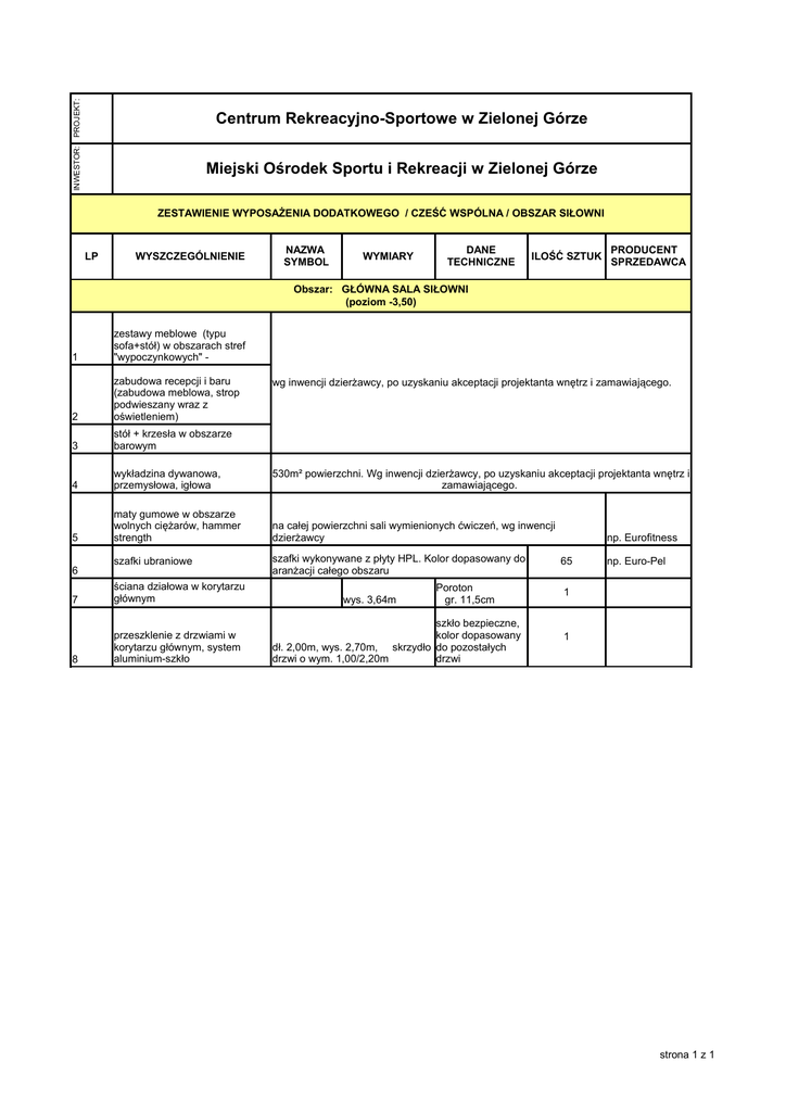 PROJEKT: Centrum Rekreacyjno-Sportowe w Zielonej Górze INWESTOR: Miejski Ośrodek Sportu i Rekreacji w Zielonej Górze ZESTAWIENIE WYPOSAŻENIA DODATKOWEGO / CZEŚĆ WSPÓLNA / OBSZAR SIŁOWNI LP WYSZCZEGÓLNIENIE NAZWA SYMBOL WYMIARY DANE TECHNICZNE ILOŚĆ SZTUK PRODUCENT SPRZEDAWCA Obszar: GŁÓWNA SALA SIŁOWNI (poziom -3,50) 1 zestawy meblowe (typu sofa+stół) w obszarach stref "wypoczynkowych" - 2 zabudowa recepcji i baru (zabudowa meblowa, strop podwieszany wraz z oświetleniem) 3 stół + krzesła w obszarze barowym 4 wykładzina dywanowa, przemysłowa, igłowa 530m² powierzchni. Wg inwencji dzierżawcy, po uzyskaniu akceptacji projektanta wnętrz i zamawiającego. 5 maty gumowe w obszarze wolnych ciężarów, hammer strength na całej powierzchni sali wymienionych ćwiczeń, wg inwencji dzierżawcy 6 szafki ubraniowe 7 ściana działowa w korytarzu głównym 8 przeszklenie z drzwiami w korytarzu głównym, system aluminium-szkło wg inwencji dzierżawcy, po uzyskaniu akceptacji projektanta wnętrz i zamawiającego. szafki wykonywane z płyty HPL. Kolor dopasowany do aranżacji całego obszaru wys. 3,64m Poroton gr. 11,5cm szkło bezpieczne, kolor dopasowany dł. 2,00m, wys. 2,70m, skrzydło do pozostałych drzwi o wym. 1,00/2,20m drzwi np. Eurofitness 65 np. Euro-Pel 1 1 strona 1 z 1