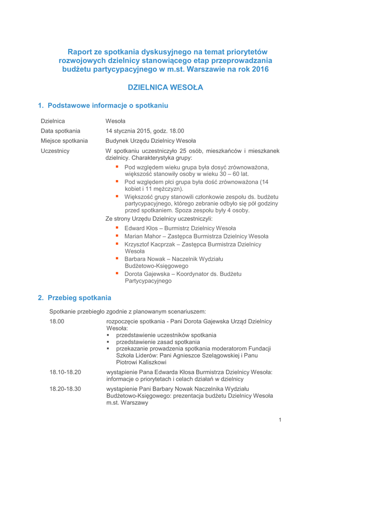 Raport ze spotkania dyskusyjnego na temat priorytetów rozwojowych dzielnicy stanowiącego etap przeprowadzania budżetu partycypacyjnego w m.st. Warszawie na rok 2016 DZIELNICA WESOŁA 1. Podstawowe informacje o spotkaniu Dzielnica Wesoła Data spotkania 14 stycznia 2015, godz. 18.00 Miejsce spotkania Budynek Urzędu Dzielnicy Wesoła Uczestnicy W spotkaniu uczestniczyło 25 osób, mieszkańców i mieszkanek dzielnicy. Charakterystyka grupy: Pod względem wieku grupa była dosyć zrównoważona, większość stanowiły osoby w wieku 30 – 60 lat. Pod względem płci grupa była dość zrównoważona (14 kobiet i 11 mężczyzn). Większość grupy stanowili członkowie zespołu ds. budżetu partycypacyjnego, którego zebranie odbyło się pół godziny przed spotkaniem. Spoza zespołu były 4 osoby. Ze strony Urzędu Dzielnicy uczestniczyli: Edward Kłos – Burmistrz Dzielnicy Wesoła Marian Mahor – Zastępca Burmistrza Dzielnicy Wesoła Krzysztof Kacprzak – Zastępca Burmistrza Dzielnicy Wesoła Barbara Nowak – Naczelnik Wydziału Budżetowo-Księgowego Dorota Gajewska – Koordynator ds. Budżetu Partycypacyjnego 2. Przebieg spotkania Spotkanie przebiegło zgodnie z planowanym scenariuszem: 18.00 rozpoczęcie spotkania - Pani Dorota Gajewska Urząd Dzielnicy Wesoła: przedstawienie uczestników spotkania przedstawienie zasad spotkania przekazanie prowadzenia spotkania moderatorom Fundacji Szkoła Liderów: Pani Agnieszce Szelągowskiej i Panu Piotrowi Kaliszkowi 18.10-18.20 wystąpienie Pana Edwarda Kłosa Burmistrza Dzielnicy Wesoła: informacje o priorytetach i celach działań w dzielnicy 18.20-18.30 wystąpienie Pani Barbary Nowak Naczelnika Wydziału Budżetowo-Księgowego: prezentacja budżetu Dzielnicy Wesoła m.st. Warszawy 1 18.30-18.40 wystąpienie Pana Mariana Mahora Zastępcy Burmistrza Dzielnicy Wesoła: budżet partycypacyjny (założenia, cele, zasady) różnice pomiędzy zeszłoroczną i obecną edycją budżetu partycypacyjnego 18.40-18.50 wystąpienie Pana Krzysztofa Kacprzaka Zastępcy Burmistrza Dzielnicy Wesoła: inwestycje planowane w dzielnicy 18.50-19.00 wystąpienie Pana Mariana Mahora Zastępcy Burmistrza Dzielnicy Wesoła: działania w zakresie oświaty, kultury, sportu i spraw społecznych 19.00-19.05 Pani Dorota Gajewska Urząd Dzielnicy Wesoła harmonogram działań drugiej edycji budżetu partycypacyjnego na rok 2016: inne możliwe sposoby zgłaszania pomysłów na zadania do realizacji ze środków publicznych – inicjatywa lokalna 19.05-20.00 blok dyskusyjny prowadzony przez moderatorów z Fundacji Szkoła Liderów 20.00-20.10 moderator Fundacji Szkoła Liderów: podsumowanie spotkania i przeprowadzenie ankiety ewaluacyjnej, zamknięcie spotkania 3. Priorytety, cele i inwestycje planowane w dzielnicy – prezentacja przedstawicieli władz dzielnicy Pan Edward Kłos, Burmistrz Dzielnicy wskazywał jako istotne cele rozbudowę wspólnej przestrzeni miejskiej, a w szczególności mieszkań komunalnych i terenów rekreacyjnych, ze szczególnym uwzględnieniem przestrzeni dla młodzieży. Pani Barbara Nowak, Naczelnik Wydziału Budżetowo-Księgowego omówiła budżet dzielnicy oraz sposób jego tworzenia. Pan Marian Mahor, Zastępca Burmistrza omówił pokrótce zasady rządzące budżetem partycypacyjnym (jego organizację w dzielnicy). Pan Krzysztof Kacprzak, Zastępca Burmistrza wymienił inwestycje planowane w najbliższym czasie, w tym: drogi (13 dróg, 2,3 km), przedszkole ze żłobkiem, miniżłobek, dwa budynki mieszkalne, termomodernizacja Ośrodka Kultury, inwestycje związane z realizacją budżetu partycypacyjnego na 2015 r (m.in. trasa rolkowa). Pan Marian Mahor, Zastępca Burmistrza omówił działania w oświacie, kulturze i sporcie, realizowane m.in. w oparciu o działania organizacji pozarządowych, finansowane w ramach otwartych konkursów ofert, a także ogólno miejskie (zima/lato w mieście, Warszawski Projekt Edukacji Kulturalnej). 4. Kluczowe obszary rozwoju dzielnicy – moderowana uczestników spotkania, bez udziału władz Dzielnicy Wesoła dyskusja W pierwszej fazie dyskusji uczestnicy zgłaszali różnorodne postulaty (zarówno ogólnych kierunków działań jak i szczegółowych projektów), które następnie zostały przez nich pogrupowane w kilka głównych obszarów najważniejszych dla rozwoju dzielnicy. 2 Na koniec spotkania każdy z uczestników mógł wskazać czy uważa każdy z przedyskutowanych obszarów rozwojowych za priorytetowy, czy nie zaliczyłby go do priorytetów rozwoju dzielnicy. Wyodrębniono następujące obszary działań jako priorytetowe dla dzielnicy: Poprawa jakości życia + sport (11 osób uznało ten obszar za priorytetowy, nikt nie zakwestionował priorytetowego znaczenia tego obszaru) Według uczestników spotkania Dzielnica Wesoła nie ma poważnych problemów infrastrukturalnych. Głównym problemem jest to, że ze względu na rozproszenie poszczególnych części Wesołej oraz traktowanie jej przez większość mieszkańców jako miejsca wyłącznie do spania, zbyt mała jest oferta pozwalająca wspólnie spędzać czas i integrować społeczność. W kategorii tej znalazło się wiele różnych działań, które trudno ująć w inny, bardziej precyzyjny priorytet. Wszystkie mają tę cechę, że oprócz swej właściwej funkcji sprzyjają integracji mieszkańców. Hasłem nadrzędnym tego priorytetu może być „zmienić Wesołą z noclegowni na letnisko” (niektóre osoby wskazywały jednak, że Wesoła już jest letniskiem). Inne zaproponowane działania to: Sformatowane: Punktory i numeracja ujęcie wody oligoceńskiej, targowisko ze świeżymi warzywami i pchlim targiem, dom dziennego pobytu dla seniorów, wybieg dla psów, trasy biegowe, zagospodarować lasy. Komunikacja i bezpieczeństwo ruchu drogowego (9 osób uznało ten obszar za priorytetowy, nikt nie zakwestionował priorytetowego znaczenia tego obszaru) Wesoła, według uczestników spotkania, jest specyficzną dzielnic