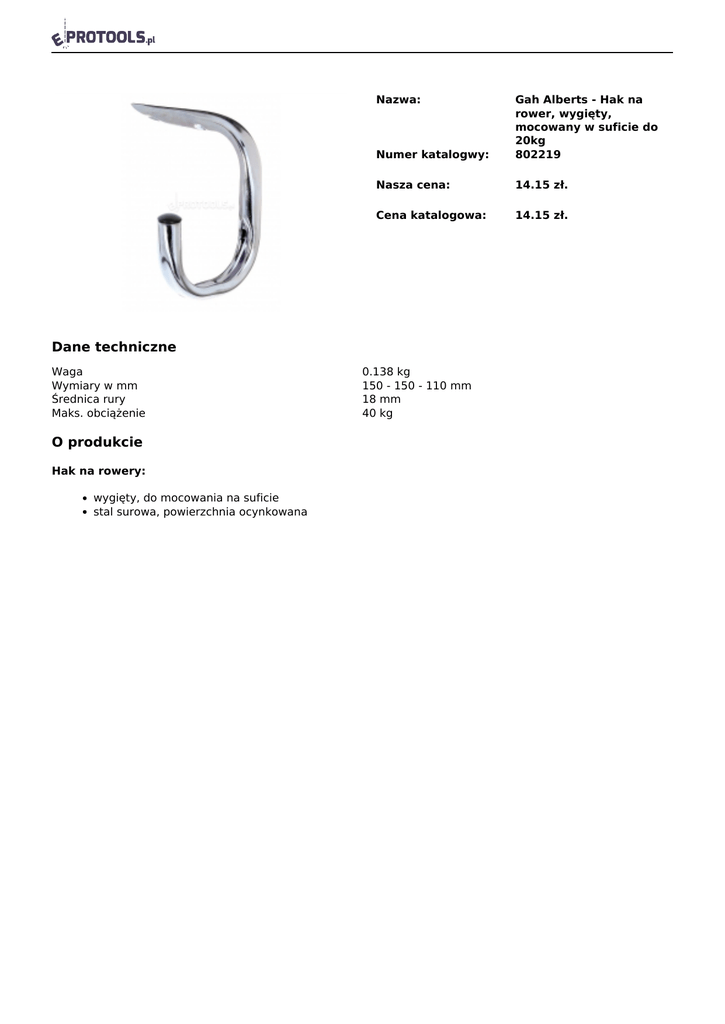 Nazwa: Numer katalogwy: Gah Alberts - Hak na rower, wygięty, mocowany w suficie do 20kg 802219 Nasza cena: 14.15 zł. Cena katalogowa: 14.15 zł. Dane techniczne Waga Wymiary w mm Średnica rury Maks. obciążenie O produkcie Hak na rowery: wygięty, do mocowania na suficie stal surowa, powierzchnia ocynkowana Powered by TCPDF (www.tcpdf.org) 0.138 kg 150 - 150 - 110 mm 18 mm 40 kg