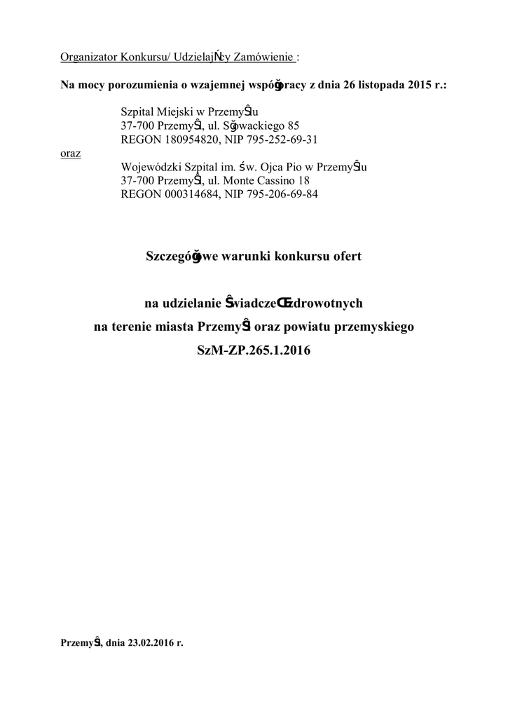 Organizator Konkursu/ Udzielający Zamówienie : Na mocy porozumienia o wzajemnej współpracy z dnia 26 listopada 2015 r.: Szpital Miejski w Przemyślu 37-700 Przemyśl, ul. Słowackiego 85 REGON 180954820, NIP 795-252-69-31 oraz Wojewódzki Szpital im. Św. Ojca Pio w Przemyślu 37-700 Przemyśl, ul. Monte Cassino 18 REGON 000314684, NIP 795-206-69-84 Szczegółowe warunki konkursu ofert na udzielanie świadczeń zdrowotnych na terenie miasta Przemyśl oraz powiatu przemyskiego SzM-ZP.265.1.2016 Przemyśl, dnia 23.02.2016 r. Rozdział 1. Przedmiot postępowania w sprawie zawarcia umowy o udzielanie świadczeń zdrowotnych 1. Przedmiotem postępowania poprzedzającym zawarcie umowy na udzielanie świadczeń zdrowotnych jest udzielanie świadczeń zdrowotnych przez podmioty dysponujące fachowymi kwalifikacjami w następującym zakresie: Cz. 1 – Udzielanie świadczeń zdrowotnych podczas normalnej ordynacji (w przedziale czasowym od 7.00-14.35, 7.15-14.50, 7.25-15.00 w zależności od profilu oddziału) i w godzinach ustalonych u Udzielającego Zamówienie na pełnienie dyżurów: 1) w Oddziale Anestezjologii i Intensywnej Terapii wymagania: II stopień specjalizacji z zakresu anestezjologii i intensywnej terapii 2) w Oddziale Chorób Wewnętrznych z Pododdziałem Kardiologicznym wymagania: II stopień specjalizacji z zakresu chorób wewnętrznych 3) w Oddziale Neurologii i Poradni Neurologicznej wymagania: II stopień specjalizacji z zakresu z zakresu neurologii 4) w Zakładzie Diagnostyki Laboratoryjnej wymagania: diagnosta laboratoryjny 5) w Zakładzie Diagnostyki Obrazowej wymagania: II lub I stopień specjalizacji z zakresu radiodiagnostyki lekarskiej 6) w Izbie Przyjęć wymagania: II lub I stopień specjalizacji z zakresu chorób wewnętrznych 7) Szpitalnym Oddziale Ratunkowym (ambulatorium internistyczne, ortopedyczne, chirurgiczne) wymagania: II lub I stopień specjalizacji, tytuł specjalisty, lub w trakcie specjalizacji, 8) w Oddziale Neonatologicznym z Pododdziałem Patologii Noworodka wymagania: specjalista neonatolog Cz. 2 – Udzielanie świadczeń zdrowotnych w godzinach ustalonych przez Udzielającego Zamówienie na pełnienie dyżuru: 1) w Oddziale Anestezjologii i Intensywnej Terapii 2) w Oddziale Chirurgicznym Ogólnym 3) w Oddziale Chorób Wewnętrznych z Pododdziałem Kardiologicznym 4) w Oddziale Neurologii i Oddziale Psychosomatycznym 5) w Zakładzie Diagnostyki Obrazowej 6) w Oddziale Otorynolaryngologicznym 7) w Oddziale Chirurgii Urazowo-Ortopedycznej 8) w Izbie Przyjęć 9) w Oddziale Chirurgicznym dla Dzieci 10) w Oddziale Obserwacyjno-Zakaźnym 11) w Oddziale Onkologicznym z Pododdziałem Dziennej Chemioterapii (godziny udzielania świadczeń–dni powszednie od poniedziałku do piątku 15.00-22.00 i soboty 12.00-19.00) 12) w Oddziale Ginekologiczno-Położniczym 13) w Oddziale Neonatologiczny z Pododdziałem Patologii Noworodka 14) w Oddziale Chirurgii Naczyniowej z Blokiem operacyjnym i pracownią Angiografii 15) w Oddziale Okulistycznym 16) w Oddziale Otolaryngologicznym Wymagania: lekarz posiadający II lub I stopień specjalizacji, tytuł specjalisty lub w trakcie specjalizacji zgodnie z profilem oddziału 2 Cz. 3 – Udzielanie świadczeń zdrowotnych w Poradniach: 1) Gastrologicznej 2) Endokrynologicznej 3) Pulmonologicznej 4) Chirurgii Urazowo-Ortopedycznej 5) Ginekologicznej Wymagania: II stopień specjalizacji zgodnie z profilem poradni 6) Okulistycznej 7) Dermatologicznej 8) Zdrowia Psychicznego 9) Otorynolaryngologicznej 10) Kardiologicznej 11) Podstawowej Opiece Zdrowotnej (w tym w Poradni Pediatrycznej) 12)Onkologicznej (specjalista onkolog kliniczny, chirurg onkolog) 13)Chirurgii Onkologicznej (specjalista chirurg onkolog) 14)Chorób Zakaźnych 15)Urologicznej 16)Gastroenterologicznej dla Dorosłych 17)Chirurgii Dzieci 18)Foniatrycznej 19)Rehabilitacyjnej 20)Gruźlicy i Chorób Płuc 21)Ortopedycznej dla Dorosłych 22) Ortopedycznej dla Dzieci 23)Chorób Piersi 24)Chirurgii Naczyniowej Wymagania: lekarz posiadający II lub I stopień specjalizacji, tytuł specjalisty lub w trakcie specjalizacji zgodnie z profilem poradni i wymogami NFZ) Cz. 4. Udzielanie świadczeń zdrowotnych w Zakładzie Diagnostyki Obrazowej (technicy RTG) wymagania: tytuł technika elektroradiologii lub licencjata w zakresie elektroradiologii Cz.5. Udzielanie świadczeń zdrowotnych w Oddziale Okulistycznym i konsultacji dla Poradni Medycyny Pracy wymagania: lekarz posiadający II stopień lub tytuł specjalisty z zakresu okulistyki 2. Wspólny Słownik Zamówień (CPV): Główny przedmiot: 85.12.11.00-4 – ogólne usługi lekarskie Rozdział 2. Kryteria oceny ofert 1. Porównanie ofert w toku postępowania w sprawie zawarcia umowy o udzielenie świadczeń zdrowotnych obejmować będzie: a) ciągłość, kompleksowość, dostępność, jakość udzielanych świadczeń, kwalifikacje personelu, b) ceny i liczby oferowanych świadczeń zdrowotnych oraz kalkulacje kosztów. 2. Kryteria oceny ofert są jawne i nie podlegają zmianie w toku postępowania. 3 3. Udzielający Zamówienia nie wyraża zgody na składanie ofert częściowych na poszczególne części będące przedmiotem postępowania w sprawie zawarcia umowy o udzielanie świadczeń opieki zdrowotnej. Należy złożyć ofertę na całość przedmiotu postępowania w sprawie zawarcia umowy o udzielanie świadczeń opieki zdrowotnej obejmującą części od 1 do 5. Rozdział 3. Warunki wymagane od świadczeniodawców 1. Na udzielanie świadczeń zdrowotnych w oddziałach szpitala, wymagane są kwalifikacje zgodne z Rozporządzeniem Ministra Zdrowia z dnia 22 listopada 2013 r. w sprawie świadczeń gwarantowanych z zakresu lecznictwa szpitalnego (Dz.U. 2013 poz.1520) w zakresie odpowiednim do specjalności medycznej oddziału a na udzielanie świadczeń zdrowotnych w poradniach specjalistycznych wymagane są kwalifikacje zgodne z Rozporządzeniem Ministra Zdrowia z dnia 6 listopada 2013 r. w sprawie świadczeń gwar