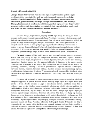 Orędzie z 25 października 2016 „Drogie dzieci! Dziś wzywam was: módlcie się o pokój! Porzućcie egoizm i żyjcie orędziami, które wam daję. Bez nich nie możecie zmienić waszego życia. Żyjąc modlitwą, będziecie mieć pokój. Żyjąc pokojem - odczujecie potrzebę dawania świadectwa, ponieważ odkryjecie Boga, którego teraz odczuwacie jako dalekiego. Dlatego, kochane dzieci, módlcie się, módlcie się, módlcie się i pozwólcie Bogu wejść w wasze serca. Powróćcie do postu i do spowiedzi, abyście zwyciężyli zło w was i wokół was. Dziękuję wam, że odpowiedzieliście na moje wezwanie”. Rozważanie Królowo Pokoju, wzywasz nas, abyśmy modlili się o pokój. Bo pokój jest darem – owocem męki, śmierci i zmartwychwstania Pana. Pokój jest owocem zwycięstwa Jezusa nad śmiercią, grzechem i szatanem. Zmartwychwstały Pan, gdy stanął pośród uczniów, udzielił im pokoju ukazując zarazem drogę do pokoju – przebite ręce i bok. Matko, przychodzisz w naszych czasach z nieba na ziemię objawiając się jako Królowa Pokoju. Mówisz nam o pokoju w sercu, z Bogiem i ludźmi. O własnych siłach nie osiągniemy pokoju. Ale możemy go wymodlić. Wzywasz nas: módlcie się o pokój! Mówisz też: porzućcie egoizm, żyjcie orędziami, pozwólcie Bogu wejść w wasze serca, powróćcie do postu i do spowiedzi. Porzućcie egoizm. Ja! Dla mnie! Jeszcze tego nie mam! A to co mam, mogę utracić. Wokół inni ludzi, którzy też dążą do zdobywania, do sławy, znaczenia. Egoizm! Nawet w domu każdy może dążyć, aby postawić na swoim. Egoizm płacze, bo jest nie dość kochany, zauważony. Egoizm cierpi, bo tyle niesprawiedliwości i dlaczego to ja muszę znosić, dlaczego mnie to spotyka, a nie innych. Żyć egoistycznie, to też złościć się na innych, na problemy, cierpienie, choroby i wszelkie przeciwności. Egoizm owocuje niepokojem, nerwami, histerią, płaczem, tupaniem nóżką… Egoizm owocuje nawet przemocą, agresją, przekleństwem i niszczeniem drugiego. W egoizmie człowiek słucha siebie, objada się sobą, nakręca się w zgorzknieniu, obmowach, obojętności i znieczulicy. Serce staje się twarde jak kamień. Pamiętam jak na oazach w ramach programu rekolekcyjnego prowadziłem młodzież na upatrzoną polanę w górach. Biło tam źródło. Wszyscy mogli się do woli napić. Woda była czysta i dobra. Źródło czerpało z głębi i nieustannie dawało. Źródlane serce biło i obdarowywało czystą, źródlaną wodą. A później schodząc do wioski zatrzymywaliśmy się nad bajorkiem. Woda w nim była mętna, cuchnąca, rosły w nim chwasty i pływały ropuchy. Zachęcałem wszystkich, aby się napili, ale nikt nie chciał. Brzegi tego bajorka były jak ramiona egoistycznego człowieka. Trzymam dla siebie. Nie dam. Nie będę się męczył. Trwam na swojej kanapie (w nawiązaniu do myśli papieża Franciszka) – to lansowana dziś koncepcja życia. Życia egoistycznego, wygodnego. Owocuje ona rozwodami, kryzysem życia rodzinnego. Wychowuje klientów antykoncepcji, wolnych związków, zwolenników aborcji, eutanazji. Oddala od Boga. Powoduje odczucie, że Bóg jest daleko. Odczucie! Bo Bóg w rzeczywistości jest bardzo blisko każdego. Ale wskutek postawy egoizmu, braku modlitwy, uwikłania w grzechu człowiek doświadcza subiektywnego wrażenia i odczuć, iż Bóg jest daleko. Matka Boża użyła słów: którego teraz odczuwacie jako dalekiego. Królowa Pokoju zatroskana o nasze szczęście woła: Porzućcie egoizm i żyjcie orędziami, które wam daję. Jej orędzia tchną ewangelicznym światłem. W nich znajdujemy ewangeliczną koncepcję życia ludzkiego. Życie orędziami jest czerpaniem z głębokości serca Bożego, aby żyć miłością i pokojem. Człowiek żyjący orędziami czerpie życie i daje życie. Czerpie miłość i obdarza miłością. Czerpie dobroć i daje dobroć. Wtedy są miłujące się małżeństwa i rodziny. Wtedy też każde dziecko jest przyjęte z miłością, a człowiek chory i podeszły wiekiem jest pielęgnowany. Czytajmy orędzia, bo w nich jest Ewangelia podana sercem Matki. Matki, która widzi co się dzisiaj dzieje z jej dziećmi i pragnie nas uratować. Bez nich (orędzi) nie możecie zmienić waszego życia. A w orędziach najwięcej jest o modlitwie. Modlitwą pijemy ze źródła. Codziennie trzeba pić, aby nie umrzeć duchowo z pragnienia. Aby nie udusić się egoizmem, niepokojem, ateizmem praktycznym, materializmem… oddaleniem od Boga – Źródła życia. Nasza Mama z nieba mówi często, aby się modlić sercem, abyśmy byli modlitwą, a w tym najnowszym orędziu mówi, abyśmy żyli modlitwą. Żyjąc modlitwą, będziecie mieć pokój. Żyjąc pokojem - odczujecie potrzebę dawania świadectwa. Potrzebę dawania – a to już jest miłość, wyjście z siebie ku drugim. Służenie innym, troska o innych. Dlatego, kochane dzieci, módlcie się, módlcie się, módlcie się i pozwólcie Bogu wejść w wasze serca. Modlitwa, to wyjście z siebie ku Bogu. Pragnienie aby On był naszym Panem, Królem i Zbawicielem. Pozwólcie! W egoizmie – nie pozwalamy. Żyjąc modlitwą i ewangelicznymi orędziami naszej Matki otwieramy się na pragnienie Boga. A On pragnie wejść w nasze serca. Odpowiadamy na czułą miłość Boga naszą miłością. Ale to już nie jest nasza miłość. Bowiem moja i twoja decyzja pozwalam, chcę, pragnę pozwala Bogu czynić w nas cud nowego człowieka. Bóg w człowieczym sercu popycha do oczyszczającej pokuty i postu. Popycha do spowiedzi. A w spowiedzi jest źródło miłości miłosiernej – śmierć egoizmu i zwycięstwo Chrystusa w nas i wokół nas. Dar pokoju! Królowo Pokoju. Dziękujemy za Twoją miłość i troskę. o. Eugeniusz Śpiołek Sch.P. Zapraszamy do naszego Ogniska w Suchcicach (pow. Ostrołęka) na rekolekcje, wieczerniki i dni skupienia oraz indywidualne rekolekcje. Także zorganizowane grupy. Serdecznie zapraszamy, także całe ro