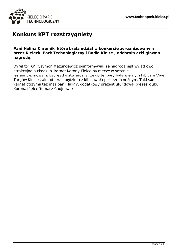 www.technopark.kielce.pl Konkurs KPT rozstrzygnięty Pani Halina Chromik, która brała udział w konkursie zorganizowanym przez Kielecki Park Technologiczny i Radio Kielce , odebrała dziś główną nagrodę. Dyrektor KPT Szymon Mazurkiewicz poinformował, że nagroda jest wyjątkowo atrakcyjna a chodzi o karnet Korony Kielce na mecze w sezonie jesienno-zimowym. Laureatka stwierdziła, że do tej pory była wiernym kibicem Vive Targów Kielce , ale od teraz będzie też kibicowała piłkarzom nożnym. Taki sam karnet otrzyma też mąż pani Haliny, dodatkowy prezent ufundował prezes klubu Korona Kielce Tomasz Chojnowski strona 1 / 1 Powered by TCPDF (www.tcpdf.org)