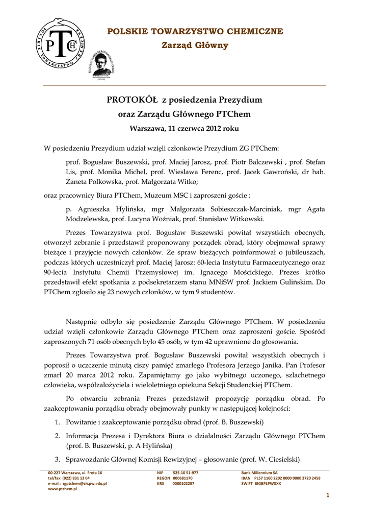 POLSKIE TOWARZYSTWO CHEMICZNE Zarząd Główny PROTOKÓŁ z posiedzenia Prezydium oraz Zarządu Głównego PTChem Warszawa, 11 czerwca 2012 roku W posiedzeniu Prezydium udział wzięli członkowie Prezydium ZG PTChem: prof. Bogusław Buszewski, prof. Maciej Jarosz, prof. Piotr Bałczewski , prof. Stefan Lis, prof. Monika Michel, prof. Wiesława Ferenc, prof. Jacek Gawroński, dr hab. Żaneta Polkowska, prof. Małgorzata Witko; oraz pracownicy Biura PTChem, Muzeum MSC i zaproszeni goście : p. Agnieszka Hylińska, mgr Małgorzata Sobieszczak-Marciniak, mgr Agata Modzelewska, prof. Lucyna Woźniak, prof. Stanisław Witkowski. Prezes Towarzystwa prof. Bogusław Buszewski powitał wszystkich obecnych, otworzył zebranie i przedstawił proponowany porządek obrad, który obejmował sprawy bieżące i przyjęcie nowych członków. Ze spraw bieżących poinformował o jubileuszach, podczas których uczestniczył prof. Maciej Jarosz: 60-lecia Instytutu Farmaceutycznego oraz 90-lecia Instytutu Chemii Przemysłowej im. Ignacego Mościckiego. Prezes krótko przedstawił efekt spotkania z podsekretarzem stanu MNiSW prof. Jackiem Gulińskim. Do PTChem zgłosiło się 23 nowych członków, w tym 9 studentów. Następnie odbyło się posiedzenie Zarządu Głównego PTChem. W posiedzeniu udział wzięli członkowie Zarządu Głównego PTChem oraz zaproszeni goście. Spośród zaproszonych 71 osób obecnych było 45 osób, w tym 42 uprawnione do głosowania. Prezes Towarzystwa prof. Bogusław Buszewski powitał wszystkich obecnych i poprosił o uczczenie minutą ciszy pamięć zmarłego Profesora Jerzego Janika. Pan Profesor zmarł 20 marca 2012 roku. Zapamiętamy go jako wybitnego uczonego, szlachetnego człowieka, współzałożyciela i wieloletniego opiekuna Sekcji Studenckiej PTChem. Po otwarciu zebrania Prezes przedstawił propozycję porządku obrad. Po zaakceptowaniu porządku obrady obejmowały punkty w następującej kolejności: 1. Powitanie i zaakceptowanie porządku obrad (prof. B. Buszewski) 2. Informacja Prezesa i Dyrektora Biura o działalności Zarządu Głównego PTChem (prof. B. Buszewski, p. A Hylińska) 3. Sprawozdanie Głównej Komisji Rewizyjnej – głosowanie (prof. W. Ciesielski) 00-227 Warszawa, ul. Freta 16 tel/fax: (022) 831 13 04 e-mail: [email protected] www.ptchem.pl NIP 525-10 51-977 REGON 000681170 KRS 0000102287 Bank Millennium SA IBAN PL57 1160 2202 0000 0000 2720 2458 SWIFT BIGBPLPWXXX 1 4. Informacja o wyborach władz PTChem na kadencję 2013-1015 (prof. M. Biziuk) 5. Informacje o przyznanych nagrodach PTChem w 2012 roku – głosowanie (prof. J. Gawroński) 6. Informacja o Zjeździe PTChem i SITPChem w Białymstoku 16-20 września 2012 roku (dr hab. S. Witkowski) 7. Sprawozdanie Głównego Komitetu Olimpiady Chemicznej (prof. J. Szydłowski) 8. Regulaminy PTChem – dyskusja i przyjęcie (dr hab. M. Michel) 9. Sprawy wniesione przez członków Zarządu Głównego PTChem (dr hab. M. Michel) 10. Przyjęcie nowych członków (dr hab. M. Michel) 11. Wolne wnioski Ad 2. Informacja Prezesa i Dyrektora Biura o działalności Zarządu Głównego PTChem Prezes PTChem prof. Bogusław Buszewski przedstawił zebranym sytuację Towarzystwa: PTChem najmuje budynek na podstawie umowy z ZGM w Warszawie i opłaca określony w umowie czynsz. W budynku przeprowadzane są niezbędne prace mające na celu utrzymanie budynku. ZGN planuje w 2013 roku przeprowadzić kapitalny remont. Zebrani zostali poinformowani o możliwości przejęcia przez PTChem pomieszczeń na parterze budynku. Przygotowana została propozycja zagospodarowania sal dla Towarzystwa oraz Muzeum MSC. Członkowie Zarządu Głównego będą informowani o postępach działań. Cały czas trwają odpowiednie działania zmierzające do ustanowienia przez Sejm i Senat RP roku 2013 Rokiem Jana Czochralskiego. W ramach tych działań ściśle współpracują ze sobą Politechnika Warszawska, Polskie Towarzystwo Chemiczne i Fizyczne, Marszałek Województwa Kujawsko-Pomorskiego, Rada Miasta Kcyni. W lipcu powinna ukazać się książka biograficzna o Janie Czochralskim autorstwa dr. Pawła Tomaszewskiego. Przedstawiciel Prezydium PTChem będzie uczestniczył podczas kolejnego Zjazdu Dziekanów Wydziałów Chemicznych w Krynicy Zdroju. Przedstawiona zostanie działalność Towarzystwa i propozycje szerszej współpracy z nowowybranymi dziekanami. Zaprezentowany został Almanach PTChem – pozycja zawierająca wszystkie najważniejsze informacje o Towarzystwie, historii, władzach, Oddziałach i Sekcjach Naukowych, medalistach i nagrodzonych, o Muzeum Marii Skłodowskiej-Curie. Pozycja będzie do nabycia w Sklepie Promocyjnym PTChem oraz podczas Zjazdu Naukowego w Białymstoku. Nadal drukowane są karty członkowskie dla tych, którzy regularnie opłacają składki członkowskie. O przywilejach związanych z posiadaniem karty mówi Pakiet minimum dostępny w każdym wydaniu Orbitala i na stronie domowej www.ptchem.pl. 00-227 Warszawa, ul. Freta 16 tel/fax: (022) 831 13 04 e-mail: [email protected] www.ptchem.pl NIP 525-10 51-977 REGON 000681170 KRS 0000102287 Bank Millennium SA IBAN PL57 1160 2202 0000 0000 2720 2458 SWIFT BIGBPLPWXXX 2 W kwietniu i maju odbyły się spotkania Rad Wydawniczych ChemPubSoc Europe, Springer, PCCP i współwłaścicieli czasopism. Polskie Towarzystwo Chemiczne reprezentowali profesorowie Maciej Jarosz i Piotr Bałczewski. Ad 3. Sprawozdanie Głównej Komisji Rewizyjnej Przewodniczący Głównej Komisji Rewizyjnej prof. Witold Ciesielski przedstawił protokół z kontroli działalności Polskiego Towarzystwa Chemicznego w okresie od 1 stycznia 2011 do 31 grudnia 2011 na podstawie otrzymanej dokumentacji finansowej oraz sprawozdania merytorycznego z działalności PTChem za rok 2011. Kontrolę przeprowadzono w obecności Dyrektora Biura Pani Agnieszki Hylińskiej. Główna Komisja Rewizyjna PTChem stwierdza, że Prezydium ZG oraz Biuro PTChem podczas trwania mijającej kadencji należycie wykonywały swo