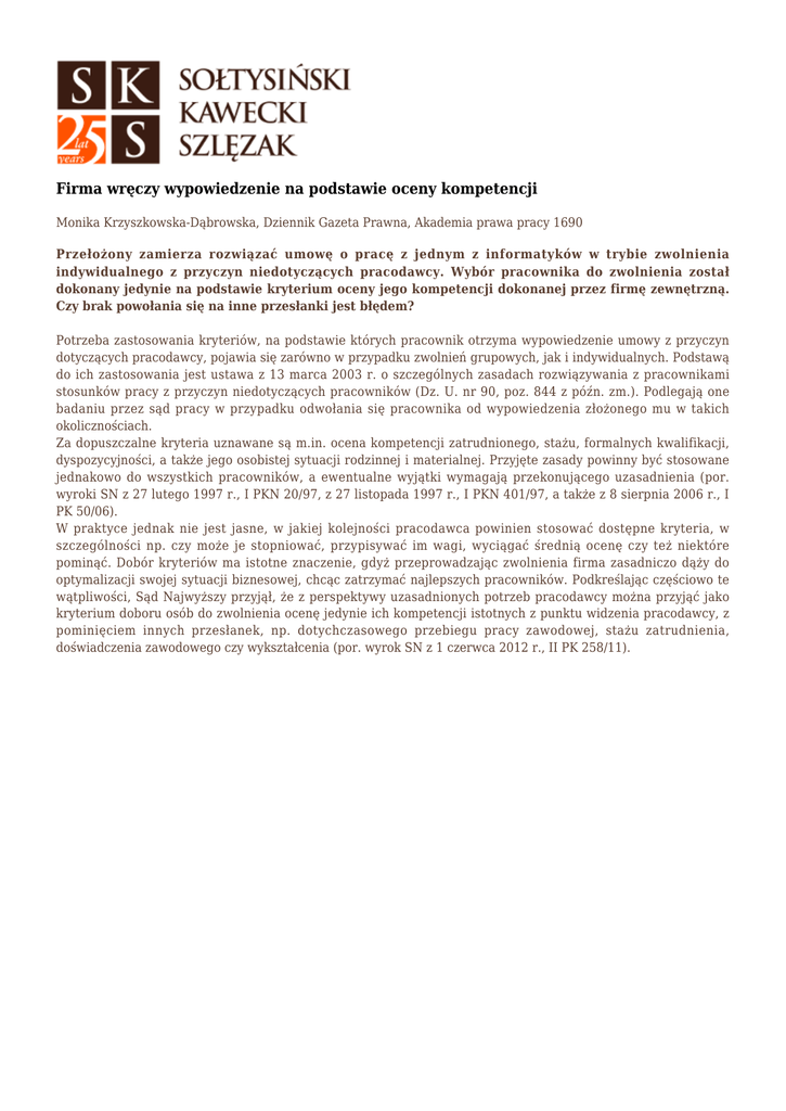 Firma wręczy wypowiedzenie na podstawie oceny kompetencji Monika Krzyszkowska-Dąbrowska, Dziennik Gazeta Prawna, Akademia prawa pracy 1690 Przełożony zamierza rozwiązać umowę o pracę z jednym z informatyków w trybie zwolnienia indywidualnego z przyczyn niedotyczących pracodawcy. Wybór pracownika do zwolnienia został dokonany jedynie na podstawie kryterium oceny jego kompetencji dokonanej przez firmę zewnętrzną. Czy brak powołania się na inne przesłanki jest błędem? Potrzeba zastosowania kryteriów, na podstawie których pracownik otrzyma wypowiedzenie umowy z przyczyn dotyczących pracodawcy, pojawia się zarówno w przypadku zwolnień grupowych, jak i indywidualnych. Podstawą do ich zastosowania jest ustawa z 13 marca 2003 r. o szczególnych zasadach rozwiązywania z pracownikami stosunków pracy z przyczyn niedotyczących pracowników (Dz. U. nr 90, poz. 844 z późn. zm.). Podlegają one badaniu przez sąd pracy w przypadku odwołania się pracownika od wypowiedzenia złożonego mu w takich okolicznościach. Za dopuszczalne kryteria uznawane są m.in. ocena kompetencji zatrudnionego, stażu, formalnych kwalifikacji, dyspozycyjności, a także jego osobistej sytuacji rodzinnej i materialnej. Przyjęte zasady powinny być stosowane jednakowo do wszystkich pracowników, a ewentualne wyjątki wymagają przekonującego uzasadnienia (por. wyroki SN z 27 lutego 1997 r., I PKN 20/97, z 27 listopada 1997 r., I PKN 401/97, a także z 8 sierpnia 2006 r., I PK 50/06). W praktyce jednak nie jest jasne, w jakiej kolejności pracodawca powinien stosować dostępne kryteria, w szczególności np. czy może je stopniować, przypisywać im wagi, wyciągać średnią ocenę czy też niektóre pominąć. Dobór kryteriów ma istotne znaczenie, gdyż przeprowadzając zwolnienia firma zasadniczo dąży do optymalizacji swojej sytuacji biznesowej, chcąc zatrzymać najlepszych pracowników. Podkreślając częściowo te wątpliwości, Sąd Najwyższy przyjął, że z perspektywy uzasadnionych potrzeb pracodawcy można przyjąć jako kryterium doboru osób do zwolnienia ocenę jedynie ich kompetencji istotnych z punktu widzenia pracodawcy, z pominięciem innych przesłanek, np. dotychczasowego przebiegu pracy zawodowej, stażu zatrudnienia, doświadczenia zawodowego czy wykształcenia (por. wyrok SN z 1 czerwca 2012 r., II PK 258/11).
