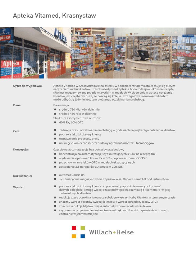 Apteka Vitamed, Krasnystaw Sytuacja wyjściowa: Apteka Vitamed w Krasnymstawie na osiedlu w pobliżu centrum miasta cechuje się dużym natężeniem ruchu klientów. Szeroki asortyment apteki z 6000 rodzajów leków na receptę (Rx) jest magazynowany przede wszystkim w regałach. W ciągu dnia w aptece natężenie klientów jest często tak duże, że tworzą się kolejki i szczegółowa rozmowa z klientem może odbyć się jedynie kosztem dłuższego oczekiwania na obsługę. Dane: Frekwencja: średnio 750 klientów dziennie średnio 450 recept dziennie Struktura asortymentowa obrotów: 40% Rx, 60% OTC Cele: Koncepcja: Rozwiązanie: Wynik: redukcja czasu oczekiwania na obsługę w godzinach największego natężenia klientów poprawa jakości obsługi klienta usprawnienie procesów pracy uniknięcie konieczności przebudowy apteki lub montażu taśmociągów Częściowa automatyzacja bez potrzeby przebudowy koncentracja na automatyzację szybko rotujących leków na receptę (Rx) wydawanie opakowań leków Rx w 85% poprzez automat CONSIS przechowywanie leków OTC w regałach ekspozycyjnych zastąpienie 2,5 m regałów automatem CONSIS automat Consis B4 systematyczne magazynowanie zapasów w szufladach Fama GX pod automatem poprawa jakości obsługi klienta >> pracownicy apteki nie muszą pokonywać dużych odległości i mogą więcej czasu poświęcić na rozmowę z klientem >> więcej zadowolonych klientów redukcja czasu oczekiwania oznacza obsługę większej liczby klientów w tym samym czasie znaczny wzrost obrotów (więcej klientów + wzrost sprzedaży leków OTC) znaczna redukcja błędów dzięki automatycznemu wydawaniu leków szybsze magazynowanie dostaw towaru dzięki możliwości napełniania automatu centralnie w jednym miejscu Każde stanowisko kasowe ma przyporządkowany jeden z 4 pojemników na wydane leki Automatyczny magazyn Automat napełniany jest z tyłu. Zapasy towaru są magazynowane z optymalnym wykorzystaniem miejsca w szufladach aptecznych FAMA pod automatem. Automat Szuflady Fama GX (wbudowane pod automatem) Powierzchnia apteki: Łącznie: 260 m² Ekspedycja: 70 m² Miejsce ustawienia automatu CONSIS: bezpośrednio za stanowiskami kasowymi Regały ekspozcyjne Zaplecze Powierzchnia ustawienia automatu: 4,7 m² Miejsca wydania: 4 miejsca wydania bezpośrednio przy automacie 1 miejsce wydania z przenośnikiem ślizgowym na zaplecze Ekspedycja Technika transportu: Pojemniki bezpośrednio na automacie + prosty przenośnik ślizgowy (odpada konieczność montażu taśmociągów) Miejsca obsługi klienta Wejście Wdrożenie: Październik 2008 r. «Wprowadzenie automatu CONSIS znacznie podniosło wydajność pracy w naszej aptece. Tym samym wzrosła również jakość świadczonych przez nas usług. Dzięki usprawnieniu sprzedaży zyskaliśmy wielu nowych pacjentów, co przełożyło się na zwiększenie ilości zakupów, zwłaszcza produktów OTC. Już w pierwszych miesiącach po zainstalowaniu automatu obroty zwiększyły się średnio o 11%, wyeliminowane zostały błędy w wydawaniu leków. Pacjenci są zadowoleni, gdyż dzięki pracy z automatem CONSIS, personel jest w stanie poświęcić im więcej czasu na indywidualną poradę.» mgr farm. Edyta Kowalska, kierownik apteki Same Dobre Apteki • Apteka Vitamed • ul. Okrzei 25 • 22-300 Krasnystaw • Tel. (82) 576 18 85 • www.samedobreapteki.pl www.willach-heise.pl