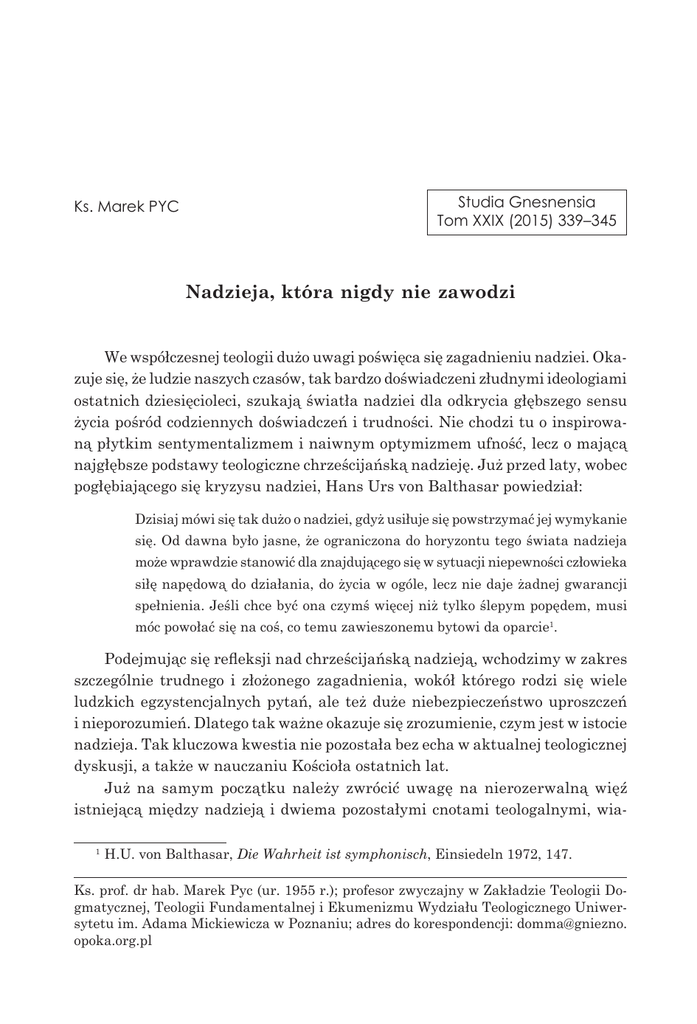 Ks. Marek PYC Studia Gnesnensia Tom XXIX (2015) 339–345 Nadzieja, która nigdy nie zawodzi We współczesnej teologii dużo uwagi poświęca się zagadnieniu nadziei. Okazuje się, że ludzie naszych czasów, tak bardzo doświadczeni złudnymi ideologiami ostatnich dziesięcioleci, szukają światła nadziei dla odkrycia głębszego sensu życia pośród codziennych doświadczeń i trudności. Nie chodzi tu o inspirowaną płytkim sentymentalizmem i naiwnym optymizmem ufność, lecz o mającą najgłębsze podstawy teologiczne chrześcijańską nadzieję. Już przed laty, wobec pogłębiającego się kryzysu nadziei, Hans Urs von Balthasar powiedział: Dzisiaj mówi się tak dużo o nadziei, gdyż usiłuje się powstrzymać jej wymykanie się. Od dawna było jasne, że ograniczona do horyzontu tego świata nadzieja może wprawdzie stanowić dla znajdującego się w sytuacji niepewności człowieka siłę napędową do działania, do życia w ogóle, lecz nie daje żadnej gwarancji spełnienia. Jeśli chce być ona czymś więcej niż tylko ślepym popędem, musi móc powołać się na coś, co temu zawieszonemu bytowi da oparcie1. Podejmując się refleksji nad chrześcijańską nadzieją, wchodzimy w zakres szczególnie trudnego i złożonego zagadnienia, wokół którego rodzi się wiele ludzkich egzystencjalnych pytań, ale też duże niebezpieczeństwo uproszczeń i nieporozumień. Dlatego tak ważne okazuje się zrozumienie, czym jest w istocie nadzieja. Tak kluczowa kwestia nie pozostała bez echa w aktualnej teologicznej dyskusji, a także w nauczaniu Kościoła ostatnich lat. Już na samym początku należy zwrócić uwagę na nierozerwalną więź istniejącą między nadzieją i dwiema pozostałymi cnotami teologalnymi, wiaH.U. von Balthasar, Die Wahrheit ist symphonisch, Einsiedeln 1972, 147. 1 Ks. prof. dr hab. Marek Pyc (ur. 1955 r.); profesor zwyczajny w Zakładzie Teologii Dogmatycznej, Teologii Fundamentalnej i Ekumenizmu Wydziału Teologicznego Uniwersytetu im. Adama Mickiewicza w Poznaniu; adres do korespondencji: domma@gniezno. opoka.org.pl 340 Ks. Marek PYC rą i miłością. Charakterystycznym rysem nadziei jest jej ukierunkowanie ku przyszłości. Podczas gdy wiara i miłość koncentrują się na tym, co jest, nadzieja kieruje się ku temu, co nastanie, zarówno w czasie, jak i w wieczności. Gdy więc pytamy o korzeń chrześcijańskiego życia, jest nim zawsze wiara. Kiedy zwraca się uwagę na jego istotę, jest nią nade wszystko miłość. Gdy natomiast patrzy się na orientację chrześcijańskiej egzystencji, punkt ciężkości spoczywa na nadziei, która nadaje jej dynamizmu. 1.Wertykalny wymiar nadziei Chrześcijańską nadzieję cechuje w pierwszym rzędzie wertykalność. Znaczy to, że jest ona skierowana ku górze, ku Bogu, jest więc nadzieją pokładaną w Bogu. Tak rozumiana nadzieja jest czystym darem Bożej łaski, przewyższającym wszelkie ludzkie pragnienie i wyprzedzającym jakąkolwiek ludzką inicjatywę. Ludzka nadzieja winna być złożona nade wszystko w Bogu. Tak rozumiana nadzieja nigdy nie zawodzi. Jej przedmiotem jest zbawienie, a więc wieczne życie w jedności z Bogiem, we wspólnocie zbawionych. Człowiek, który zgrzeszył mówiąc Bogu „nie”, doświadczał dramatu oddalenia od Boga i niemożności powrotu do Niego o własnych siłach. Bóg jednak, kontynuując swój odwieczny zbawczy zamysł, wyszedł ku nam, grzesznikom, wlewając w nasze serca nową nadzieję, kiedy to Syn Boży stał się człowiekiem dla naszego zbawienia. W Nim zstąpiła w naszą ziemską teraźniejszość „pełnia łaski i prawdy” (J 1,14). To On napełnił ziemię swoją obecnością, stając się człowiekiem na nasze podobieństwo. Solidaryzując się z nami, przeżył nasze ludzkie życie, a biorąc na siebie nasze grzechy, umarł za nas na krzyżu w skrajnym opuszczeniu. Dokonał dzieła naszego odkupienia jako cierpiący i oddający za nas swe życie arcykapłan Nowego Przymierza. Chrześcijańska nadzieja ma zatem swoją cenę. Ową wielką ceną, za którą zostaliśmy nabyci, jest krzyż Jezusa Chrystusa, naszego Odkupiciela. Jest ona okupiona Jego męką, posuniętą aż po śmierć na krzyżu. Ten, który był umarły, ukazuje wobec świata swoje przebite serce jako świadectwo miłości: „Umiłowawszy swoich, którzy byli na świecie, do końca ich umiłował” (J 13,1). Nadzieja wierzących znajduje swe definitywne uzasadnienie w zmartwychwstaniu Chrystusa. On zmartwychwstał, otwierając przed nami ostateczną perspektywę chrześcijańskiej nadziei. Od nadziei pogańskiej odróżnia ją to, że opiera się ona nie na mitach, lecz na historycznym wydarzeniu. Jej fundamentem jest zmartwychwstanie Chrystusa, które już się dokonało, i to odróżnia ją Nadzieja, która nigdy nie zawodzi 341 z kolei od nadziei żydowskiej, jako że oczekiwany Mesjasz już przyszedł. Mocą śmierci i zmartwychwstania Chrystusa zostaliśmy usprawiedliwieni, zanim jeszcze tego byliśmy świadomi (2 Kor 5,14; Rz 5,10). Dlatego też nadzieja ta nigdy nie zawodzi. Chrześcijańska nadzieja jest odpowiedzią na miłość Boga, który pierwszy nas umiłował, gdyśmy byli jeszcze grzesznikami. Zmartwychwstanie Jezusa Chrystusa, wcielonego Syna Bożego, nadaje chrześcijańskiej nadziei dynamizmu. Eschatologiczna rzeczywistość, ku której zmierzamy, nie jest bowiem czystą przyszłością, lecz w Chrystusie zmartwychwstałym staje się już teraz obecna pośrodku czasu świata. To, na co człowiek wierzący ma nadzieję, jest już spełnioną rzeczywistością, choć na razie jeszcze ukrytą w Bogu. Zostaje on pochwycony i wzięty w posiadanie przez zmartwychwstałego Pana, co uskrzydla Jego chrześcijańską nadzieję. Otrzymuje ona tym samym swoją prężność, dynamizm i przynaglenie, by dać odpowiedź niebu, podobnie jak niebo zwróciło się ku ziemi. Teologalna nadzieja niesie nieustannie w ludzkie dzieje świeżość i nowość. Stanowi ona d