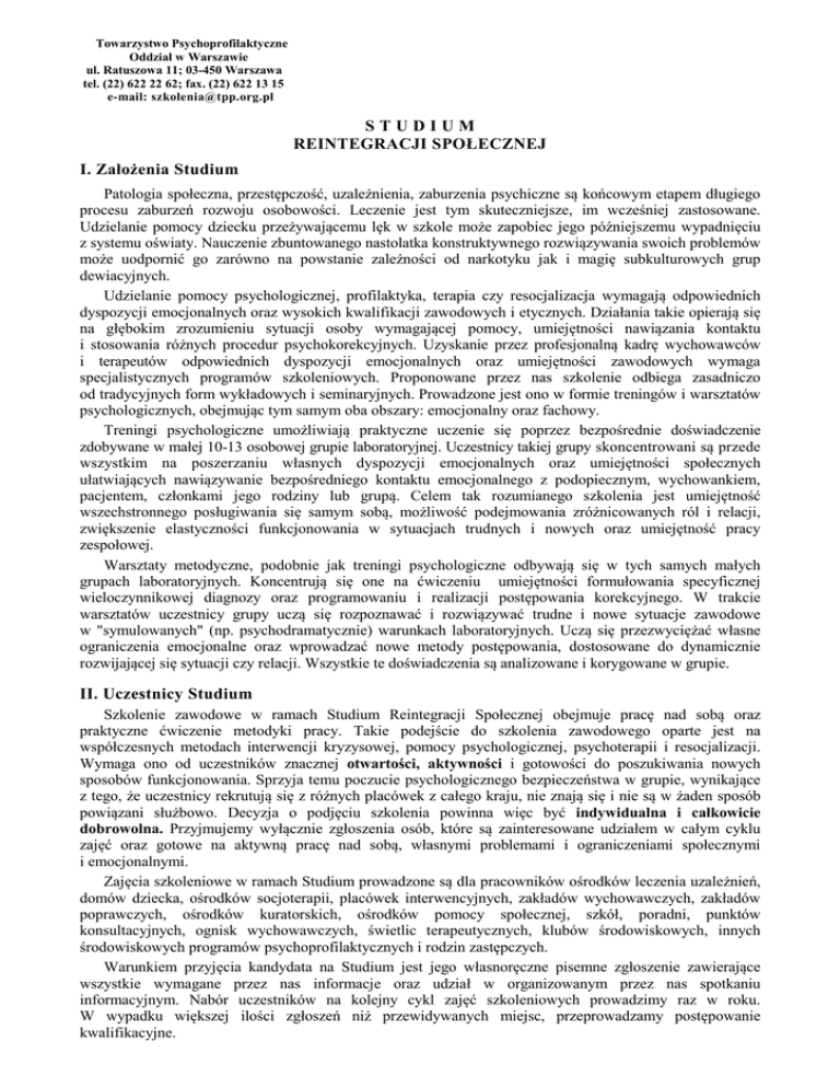 Towarzystwo Psychoprofilaktyczne Oddział w Warszawie ul. Ratuszowa 11; 03-450 Warszawa tel. (22) 622 22 62; fax. (22) 622 13 15 e-mail: [email protected] STUDIUM REINTEGRACJI SPOŁECZNEJ I. Założenia Studium Patologia społeczna, przestępczość, uzależnienia, zaburzenia psychiczne są końcowym etapem długiego procesu zaburzeń rozwoju osobowości. Leczenie jest tym skuteczniejsze, im wcześniej zastosowane. Udzielanie pomocy dziecku przeżywającemu lęk w szkole może zapobiec jego późniejszemu wypadnięciu z systemu oświaty. Nauczenie zbuntowanego nastolatka konstruktywnego rozwiązywania swoich problemów może uodpornić go zarówno na powstanie zależności od narkotyku jak i magię subkulturowych grup dewiacyjnych. Udzielanie pomocy psychologicznej, profilaktyka, terapia czy resocjalizacja wymagają odpowiednich dyspozycji emocjonalnych oraz wysokich kwalifikacji zawodowych i etycznych. Działania takie opierają się na głębokim zrozumieniu sytuacji osoby wymagającej pomocy, umiejętności nawiązania kontaktu i stosowania różnych procedur psychokorekcyjnych. Uzyskanie przez profesjonalną kadrę wychowawców i terapeutów odpowiednich dyspozycji emocjonalnych oraz umiejętności zawodowych wymaga specjalistycznych programów szkoleniowych. Proponowane przez nas szkolenie odbiega zasadniczo od tradycyjnych form wykładowych i seminaryjnych. Prowadzone jest ono w formie treningów i warsztatów psychologicznych, obejmując tym samym oba obszary: emocjonalny oraz fachowy. Treningi psychologiczne umożliwiają praktyczne uczenie się poprzez bezpośrednie doświadczenie zdobywane w małej 10-13 osobowej grupie laboratoryjnej. Uczestnicy takiej grupy skoncentrowani są przede wszystkim na poszerzaniu własnych dyspozycji emocjonalnych oraz umiejętności społecznych ułatwiających nawiązywanie bezpośredniego kontaktu emocjonalnego z podopiecznym, wychowankiem, pacjentem, członkami jego rodziny lub grupą. Celem tak rozumianego szkolenia jest umiejętność wszechstronnego posługiwania się samym sobą, możliwość podejmowania zróżnicowanych ról i relacji, zwiększenie elastyczności funkcjonowania w sytuacjach trudnych i nowych oraz umiejętność pracy zespołowej. Warsztaty metodyczne, podobnie jak treningi psychologiczne odbywają się w tych samych małych grupach laboratoryjnych. Koncentrują się one na ćwiczeniu umiejętności formułowania specyficznej wieloczynnikowej diagnozy oraz programowaniu i realizacji postępowania korekcyjnego. W trakcie warsztatów uczestnicy grupy uczą się rozpoznawać i rozwiązywać trudne i nowe sytuacje zawodowe w "symulowanych" (np. psychodramatycznie) warunkach laboratoryjnych. Uczą się przezwyciężać własne ograniczenia emocjonalne oraz wprowadzać nowe metody postępowania, dostosowane do dynamicznie rozwijającej się sytuacji czy relacji. Wszystkie te doświadczenia są analizowane i korygowane w grupie. II. Uczestnicy Studium Szkolenie zawodowe w ramach Studium Reintegracji Społecznej obejmuje pracę nad sobą oraz praktyczne ćwiczenie metodyki pracy. Takie podejście do szkolenia zawodowego oparte jest na współczesnych metodach interwencji kryzysowej, pomocy psychologicznej, psychoterapii i resocjalizacji. Wymaga ono od uczestników znacznej otwartości, aktywności i gotowości do poszukiwania nowych sposobów funkcjonowania. Sprzyja temu poczucie psychologicznego bezpieczeństwa w grupie, wynikające z tego, że uczestnicy rekrutują się z różnych placówek z całego kraju, nie znają się i nie są w żaden sposób powiązani służbowo. Decyzja o podjęciu szkolenia powinna więc być indywidualna i całkowicie dobrowolna. Przyjmujemy wyłącznie zgłoszenia osób, które są zainteresowane udziałem w całym cyklu zajęć oraz gotowe na aktywną pracę nad sobą, własnymi problemami i ograniczeniami społecznymi i emocjonalnymi. Zajęcia szkoleniowe w ramach Studium prowadzone są dla pracowników ośrodków leczenia uzależnień, domów dziecka, ośrodków socjoterapii, placówek interwencyjnych, zakładów wychowawczych, zakładów poprawczych, ośrodków kuratorskich, ośrodków pomocy społecznej, szkół, poradni, punktów konsultacyjnych, ognisk wychowawczych, świetlic terapeutycznych, klubów środowiskowych, innych środowiskowych programów psychoprofilaktycznych i rodzin zastępczych. Warunkiem przyjęcia kandydata na Studium jest jego własnoręczne pisemne zgłoszenie zawierające wszystkie wymagane przez nas informacje oraz udział w organizowanym przez nas spotkaniu informacyjnym. Nabór uczestników na kolejny cykl zajęć szkoleniowych prowadzimy raz w roku. W wypadku większej ilości zgłoszeń niż przewidywanych miejsc, przeprowadzamy postępowanie kwalifikacyjne. III. Zespół prowadzący szkolenie Jesteśmy zespołem terapeutów i wychowawców. Prowadzimy różne programy środowiskowe obejmujące resocjalizację, wychowanie korekcyjne, pomoc psychologiczną, leczenie uzależnień oraz rehabilitację psychiatryczną. Specyfiką prowadzonych przez nas programów jest praca środowiskowa, praca z rodziną, podejście systemowe oraz nastawienie na aktywizację potencjalnych możliwości odbiorcy. Zespół nasz od 40-tu lat prowadzi różne formy szkolenia zawodowego pracowników służby zdrowia, edukacji, pomocy społecznej i resocjalizacji. W organizowanych przez nas treningach i warsztatach wzięło dotychczas udział ponad 6000 osób (nauczycieli, pedagogów, psychologów, wychowawców, instruktorów terapii, kuratorów, pracowników socjalnych itp.). W ostatnich latach w naszym Studium szkoliły się m.in. zespoły Zakładu Poprawczego z Białegostoku, Świetlic Towarzystwa „Szansa” z Białegostoku, grup usamodzielnienia Domu Dziecka w Komarnie, asystentów rodzinnych MOPR w Piekarach Śląskich i w Zabrzu, wielu ośrodków „Monaru” Zajęcia treningowe i warsztatowe w ramach Studium prowadzone są przez pracowników i współpracowników naszego Towarzystwa,