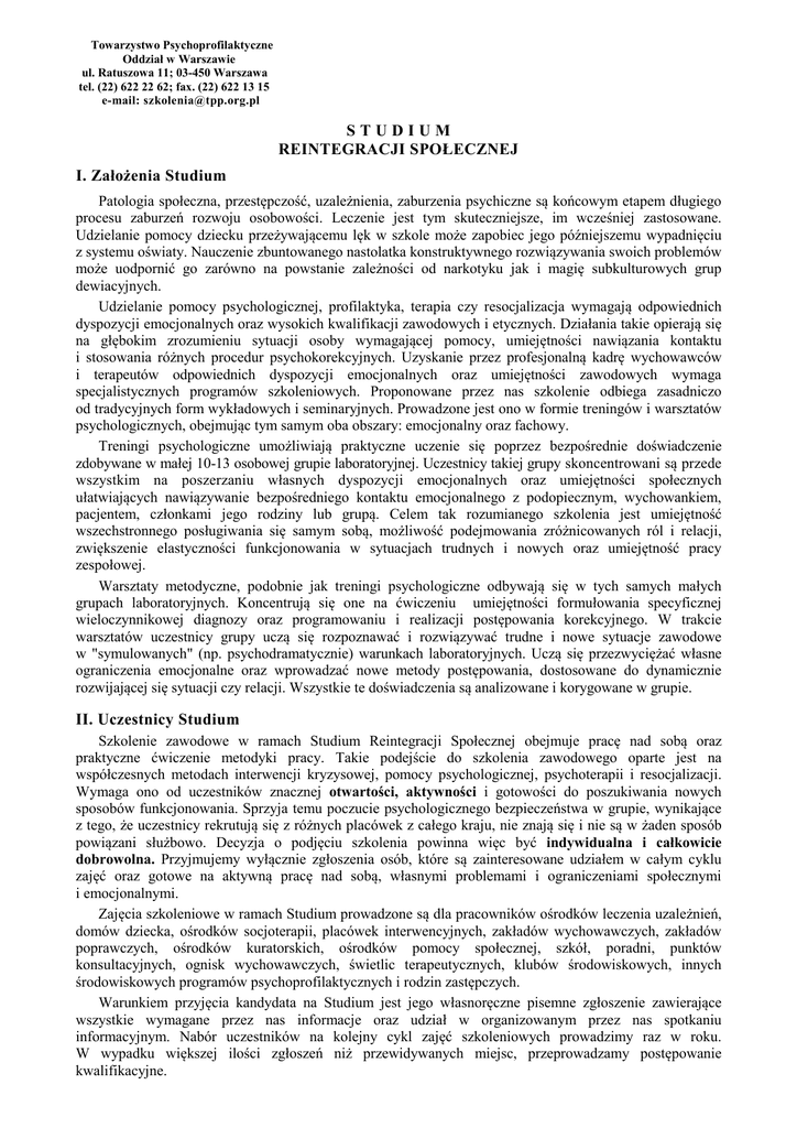 STUDIUM REINTEGRACJI SPOŁECZNEJ I. Założenia Studium II
