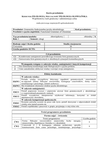 Karta przedmiotu KIERUNEK FILOLOGIA, SPECJALNOŚĆ FILOLOGIA SŁOWIAŃSKA Wspólnotowy ruch graniczny i administracja celna studia pierwszego stopnia/profil ogólnoakademicki Przedmiot: Gramatyka funkcjonalna języka ukraińskiego Przedmiot w języku angielskim: Functional Grammar of Ukrainian Kod przedmiotu: obowiązkowy Typ przedmiotu/modułu: Rok: I Semestr: drugi Rodzaje zajęć i liczba godzin: Ćwiczenia Liczba punktów ECTS: obieralny X Studia stacjonarne 30 2 Cel przedmiotu C1 C2 Kształtowanie umiejętności prawidłowego tworzenia form gramatycznych. Zastosowania form gramatycznych w określonych sytuacjach komunikacyjnych. Wymagania wstępne w zakresie wiedzy, umiejętności i innych kompetencji 1 2 Zna elementarną terminologię nauk filologicznych w języku polskim. Umie samodzielnie zdobywać wiedzę i rozwijać swoje umiejętności. Efekty kształcenia W zakresie wiedzy: Posiada wiedzę szczegółową dotyczącą zagadnień gramatycznych, omawianych EKW1 na zajęciach (formy fleksyjne rzeczownika, koniugacje czasowników, formy czasu teraźniejszego i przeszłego, zaimek osobowy). EKW2 Ma świadomość złożoności struktur języka ukraińskiego. W zakresie umiejętności: EKU1 EKU2 Potrafi poprawnie tworzyć i poprawnie używać form gramatycznych j. ukraińskiego w wypowiedziach pisemnych i ustnych. Potrafi wyszukiwać, interpretować użytkować informacje, korzystać ze źródeł internetowych i słowników. W zakresie kompetencji społecznych: EKK1 EKK2 Rozumie potrzebę uczenia się przez całe życie, potrafi skorzystać z odpowiednich źródeł wiedzy oraz metod uczenia się. Potrafi współdziałać i pracować w grupie, przyjmując w niej różne role. Treści programowe przedmiotu Forma zajęć – ćwiczenia Treści programowe ĆW1 ĆW2 Formy fleksyjne rzeczowników mianownika liczby mnogiej, miejscownika, dopełniacza i biernika w j. ukraińskim Czasownik (I i II koniugacja, odmiana archaiczna), sposoby konstruowania form czasu przeszłego, teraźniejszego, przyszłego Liczba godzin 6 8 ĆW3 ĆW4 ĆW5 prostego) Sposoby wyrażania miejsca, czasu, przyczyny, celu, prośby, zaproszenia, niemożliwości, zgody, odmowy Fleksja zaimka osobowego Liczebniki (główne i porządkowe, pojedyncze i złożone, użycie praktyczne) Suma godzin: 8 4 4 30 Metody i środki dydaktyczne M1 M2 Ćwiczenia audytoryjne: praca w grupach, indywidualna. Testy. Sposoby oceniania Ocenianie kształtujące F1 Prace cząstkowe w formie pisemnej i ustnej. P1 Ocena semestralna jest wypadkową ocen cząstkowych i oceny z zaliczeniowego kolokwium podsumowującego. Ocenianie podsumowujące Obciążenie pracą studenta Średnia liczba godzinna realizowanie Forma aktywności aktywności Godziny kontaktowe z wykładowcą, realizowane w formie zajęć dydaktycznych Godziny kontaktowe z wykładowcą, realizowane w formie konsultacji Przygotowanie się do zajęć, praca domowa Przygotowanie do kolokwium zaliczeniowego Suma godzin: Sumaryczna liczba punktów ECTS dlaprzedmiotu 30 1 20 2 53 2 Literatura podstawowa i uzupełniająca Literatura podstawowa 1 Б. Зінкевич-Томанек, Граматика сучасної української мови, Kraków 2007. 2 В. Василенко, Украінська мова. Поглиблений практичний курс, T.1, T.2, Poznań, 2001. В.М. Вінницька, Н.Г. Плющ, Українська мова: Практичний курс граматики для студентів-іноземців, Київ 1997. 3 Macierz efektów kształcenia Sposoby oceniania Stopień w jakim efekty kształcenia związane są z przedmiotem Odniesienie danego efektu do efektów specjalnościowych Stopień w jakim efekty kształcenia związane są z przedmiotem Metody i środki dydaktyczne K_W09 Treści programowe EKW2 K_W04 Cele przedmiotu EKW1 Odniesienie danego efektu kształcenia do efektów zdefiniowanych dla całego programu (PEK) Efekt kształcenia +++ C1, C2 ĆW 1-5 1,2 F1, P1 +++ C1, C2 ĆW 1-5 1,2 F1, P1 +++ C1, C2 ĆW 1-5 1,2 F1, P1 K_U08 EKU1 K_U09 EKU2 K_U07 +++ C1, C2 ĆW 1-5 1,2 F1, P1 EKK1 K_K01 +++ C1, C2 ĆW 1-5 1,2 F1, P1 EKK2 K_K02 +++ C1, C2 ĆW 1-5 1,2 F1, P1 Formy oceny - szczegóły Na ocenę 2 (ndst) Na ocenę 3 (dst) Na ocenę 3+ (dst+) Na ocenę 4 (db) Nie posiada elementarnej wiedzy dotyczącej zagadnień tematycznych omawianych na zajęciach, nie potrafi wykorzystać jej w sytuacjach komunikacyjnych. Nie ma świadomości złożoności struktur języka ukraińskiego i jego znaczenia w komunikacji międzyludzkiej, nie zna elementarnej leksyki języka ukraińskiego, nie umie zastosować jej w procesie komunikacyjnym. Student wykorzystuje struktury gramatyczne w języku ukraińskim na tyle błędnie, że nie jest możliwa komunikacja. Nie potrafi wyszukiwać, analizować, interpretować, dobierać selekcjonować informacji użytkowych wykorzystaniem różnych źródeł. Nie wykazuje zainteresowania tematem i nie rozumie potrzeby ciągłego uczenia się. Nie pracuje w grupie, nie uczestniczy w zajęciach. Posiada elementarną wiedzę dotyczącą zagadnień tematycznych omawianych na zajęciach, potrafi częściowo wykorzystać poznane zagadnienia w sytuacji komunikacyjnej. Ma niewielką świadomość złożoności struktur języka ukraińskiego i jego znaczenia w komunikacji międzyludzkiej, zna elementarną leksykę języka ukraińskiego, stosuje je w procesie komunikacyjnym, popełniając liczne błędy. Student słabo porozumiewa się w języku ukraińskim, jego wypowiedzi zawierają liczne błędy gramatyczne. Potrafi wyszukiwać, dobierać selekcjonować informacje użytkowe wykorzystaniem różnych źródeł w podstawowym zakresie. W niewielkim stopniu wykazuje zainteresowanie tematem i potrzebę ciągłego uczenia się. Słabo współpracuje w grupie, uczestniczy w większości zaplanowanych zajęć. Posiada elementarną wiedzę dotyczącą zagadnień tematycznych omawianych na zajęciach, potrafi wykorzystać poz