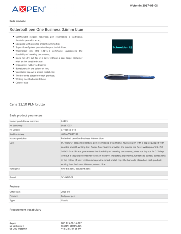 Wołomin 2017-03-08 Karta produktu: Rollerball pen One Business 0.6mm blue SCHNEIDER elegant rollerball pen resembling a traditional fountain pen with a cap; Equipped with an ultra smooth writing tip; Super-flow-System provides the precise ink flow; Waterproof ink, ISO 14145-2 certificate, guarantees the durability of marking documents; Does not dry out for 2-3 days without a cap; large container with an ink level indicator; Ergonomic, rubberised barrel; Barrel parts in the colour of ink; Ventilated cap wit a smart, metal clip; The bar code placed on each product; Writing line thickness: 0.6mm Colour: blue Cena 12,10 PLN brutto Basic product parameters Numer produktu w systemie 24463 Nr dostawcy SR183003 Nr Celcen 17-01836-343 Kod kreskowy 4004675098597 Nazwa produktu Rollerball pen One Business 0.6mm blue Opis SCHNEIDER elegant rollerball pen resembling a traditional fountain pen with a cap;; equipped with an ultra smooth writing tip;; Super-flow-System provides the precise ink flow;; waterproof ink, ISO 14145-2 certificate, guarantees the durability of marking documents;; does not dry out for 2-3 days without a cap; large container with an ink level indicator;; ergonomic, rubberised barrel;; barrel parts in the colour of ink;; ventilated cap wit a smart, metal clip;; the bar code placed on each product;; writing line thickness: 0.6mm; colour: blue Kategoria Fine tip pens, ballpoint pens Brand SCHNEIDER Feature Offer from 2015-04 Product Ballpoint pen Type Classic Procurement vocabulary Axpen ul. Laskowa 4 05-200 Wołomin NIP: 125-00-16-787 REGON: 010346305 +48 (22) 787 55 99 Wołomin 2017-03-08 Karta katalogowa produktu cd. Rollerball pen One Business 0.6mm blue CPV 30192121-5 Długopisy kulkowe Dimensions Thickness line (mm) 0,6 Certifications Hit Hit New product Standard Colour Colour Blue Pozostałe zdjęcia produktu Serdecznie zapraszamy do współpracy Axpen zespół. Axpen ul. Laskowa 4 05-200 Wołomin NIP: 125-00-16-787 REGON: 010346305 +48 (22) 787 55 99
