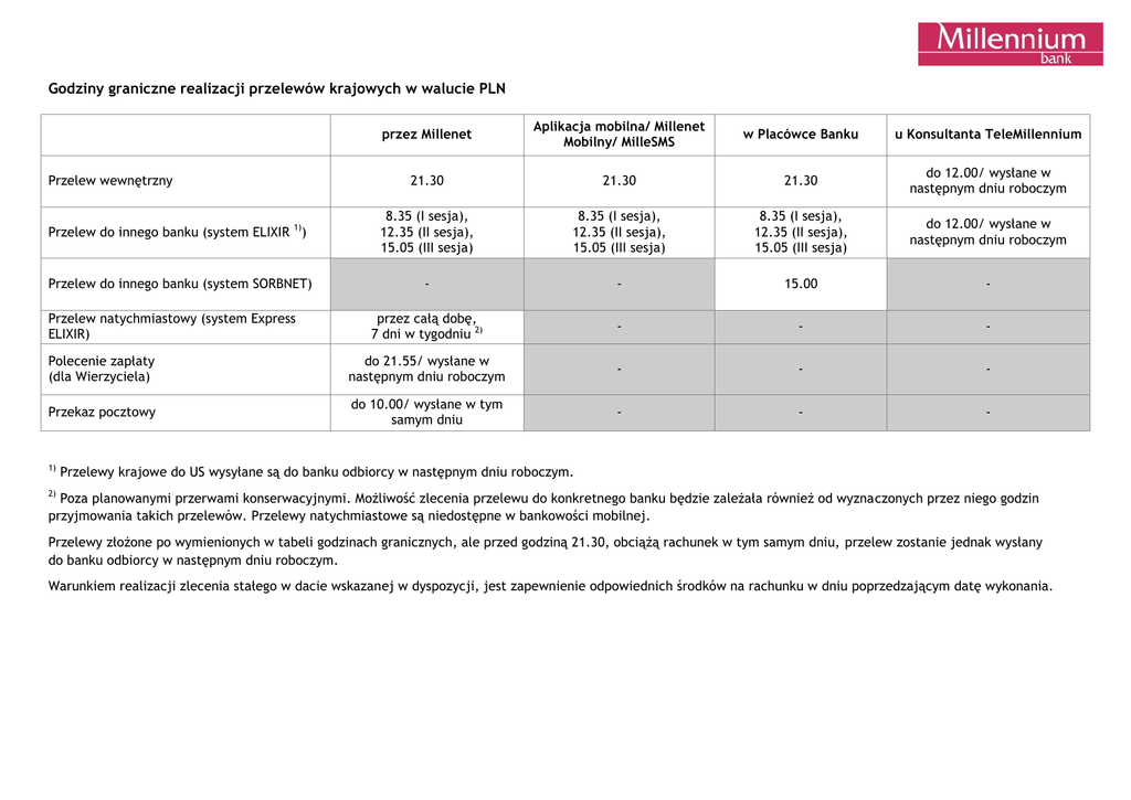 Godziny graniczne realizacji przelewów krajowych w walucie PLN przez Millenet Aplikacja mobilna/ Millenet Mobilny/ MilleSMS w Placówce Banku u Konsultanta TeleMillennium 21.30 21.30 21.30 do 12.00/ wysłane w następnym dniu roboczym Przelew do innego banku (system ELIXIR 1)) 8.35 (I sesja), 12.35 (II sesja), 15.05 (III sesja) 8.35 (I sesja), 12.35 (II sesja), 15.05 (III sesja) 8.35 (I sesja), 12.35 (II sesja), 15.05 (III sesja) do 12.00/ wysłane w następnym dniu roboczym Przelew do innego banku (system SORBNET) - - 15.00 - przez całą dobę, 7 dni w tygodniu 2) - - - Polecenie zapłaty (dla Wierzyciela) do 21.55/ wysłane w następnym dniu roboczym - - - Przekaz pocztowy do 10.00/ wysłane w tym samym dniu - - - Przelew wewnętrzny Przelew natychmiastowy (system Express ELIXIR) 1) Przelewy krajowe do US wysyłane są do banku odbiorcy w następnym dniu roboczym. 2) Poza planowanymi przerwami konserwacyjnymi. Możliwość zlecenia przelewu do konkretnego banku będzie zależała również od wyznaczonych przez niego godzin przyjmowania takich przelewów. Przelewy natychmiastowe są niedostępne w bankowości mobilnej. Przelewy złożone po wymienionych w tabeli godzinach granicznych, ale przed godziną 21.30, obciążą rachunek w tym samym dniu, przelew zostanie jednak wysłany do banku odbiorcy w następnym dniu roboczym. Warunkiem realizacji zlecenia stałego w dacie wskazanej w dyspozycji, jest zapewnienie odpowiednich środków na rachunku w dniu poprzedzającym datę wykonania.