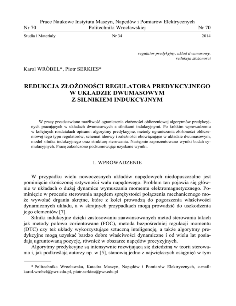 Prace Naukowe Instytutu Maszyn, Napędów i Pomiarów Elektrycznych Nr 70 Politechniki Wrocławskiej Nr 70 Studia i Materiały Nr 34 2014 regulator predykyjny, układ dwumasowy, redukcja złożoności Karol WRÓBEL*, Piotr SERKIES* REDUKCJA ZŁOŻONOŚCI REGULATORA PREDYKCYJNEGO W UKŁADZIE DWUMASOWYM Z SILNIKIEM INDUKCYJNYM W pracy przedstawiono możliwość ograniczenia złożoności obliczeniowej algorytmów predykcyjnych pracujących w układach dwumasowych z silnikami indukcyjnymi. Po krótkim wprowadzeniu w kolejnych rozdziałach opisano: algorytmy predykcyjne, metody ograniczania złożoności obliczeniowej tego typu regulatorów, schemat ideowy i zależności obowiązujące w układzie dwumasowym, model silnika indukcyjnego oraz strukturę sterowania. Następnie zaprezentowano wyniki badań symulacyjnych. Pracę zakończono podsumowując uzyskane wyniki. 1. WPROWADZENIE W przypadku wielu nowoczesnych układów napędowych niedopuszczalne jest pominięcie skończonej sztywności wału napędowego. Problem ten pojawia się głównie w układach o dużej dynamice wymuszania momentu elektromagnetycznego. Pominięcie w procesie sterowania napędem sprężystości połączenia mechanicznego może wywołać drgania skrętne, które z kolei prowadzą do pogorszenia właściwości dynamicznych układu, a w skrajnych przypadkach mogą prowadzić do uszkodzenia jego elementów [7]. Silniki indukcyjne dzięki zastosowaniu zaawansowanych metod sterowania takich jak metody polowo zorientowane (FOC), metoda bezpośredniej regulacji momentu (DTC) czy też układy wykorzystujące sztuczną inteligencję, a także algorytmy predykcyjne mogą uzyskać bardzo dobre właściwości dynamiczne i od wielu lat posiadają ugruntowaną pozycję, również w obszarze napędów precyzyjnych. Algorytmy predykcyjne są intensywnie rozwijającą się dziedziną w teorii sterowania i, jak podkreślają autorzy np. w [5], stanowią jedno z największych osiągnięć w tym __________ * Politechnika Wrocławska, Katedra Maszyn, Napędów i Pomiarów Elektrycznych, e-mail: [email protected], [email protected] 207 zakresie. Jedną z najbardziej intensywnie rozwijających się grup tego typu algorytmów są algorytmy wykorzystujące model w dyskretnej przestrzeni stanu (MPC). Podstawową zaletą algorytmów predykcyjnych jest możliwość uwzględnienia ograniczeń zmiennych stanu na etapie projektowania funkcji celu regulatora. Jednak jednym z głównych problemów związanych ze stosowaniem tego typu algorytmów jest stosunkowo duża złożoność obliczeniowa. Ogranicza ona możliwość stosowania algorytmów predykcyjnych do układów o stosunkowo dużych stałych czasowych. Celem niniejszego artykułu jest przedstawienie możliwości ograniczenia złożoności obliczeniowej algorytmów predykcyjnych zastosowanych do sterowania układem dwumasowym. 2. ALGORYTMY PREDYKCYJNE W rozpatrywanym układzie przyjęto przypadek sterowania predykcyjnego, wykorzystującego model w dyskretnej przestrzeni stanu (1). Funkcja kryterialna wykorzystywana przez regulator ma postać (2a) i uwzględnia założone ograniczenia (2b). x(k + 1) = Ax(k ) + Bu (k ) y (k ) = Cx(k ) (1) gdzie: x(k), u(k), y(k) to odpowiednio wektory: stanu, zmiennych wejściowych i wyjściowych, A, B, C to znane, niezmienne w czasie macierze systemowe. J N* = Δ min U =[ u oT ,..., u TNu −1 ]T N u −1 ⎡ Np T ⎤ ⎢ yk Qyk + ukT Ruk ⎥ k =0 ⎣⎢ k = 0 ⎦⎥ ∑ ∑ umin ≤ u (k ) ≤ umax ; Δumin ≤ Δu (k ) ≤ Δumax ; xmin ≤ y (k ) ≤ xmax (2a) (2b) gdzie: Q ≥ 0 i R > 0 – macierze wagowe regulatora, Np, Nu – horyzonty predykcji odpowiednio: wyjść i sygnałów sterujących, U – sekwencja sterowań (Nu wektorów m-wymiarowych, gdzie m jest liczbą sygnałów sterujących). Zakłada się, że Nu ≤ Np, a uk = uNu–1 dla każdego k ≥ Nu. Wśród algorytmów predykcyjnych wyróżnić można układy realizowane w czasie rzeczywistym., w których problem optymalizacji rozwiązywany jest w każdym kroku obliczeń. Ten typ optymalizacji, nazywany on-line, wymaga dużego nakładu obliczeniowego w każdej iteracji i w związku z tym, stosowany może być w układach o relatywnie niskiej dynamice. Drugi typ optymalizacji, nazywany off-line, wykorzystuje programowanie wieloparametryczne. W wyniku jego działania, przestrzeń stanu dzielona jest na regiony (Pr), które opisane są nierównościami określającymi ich granice (3a). Do każdego regionu przypisane jest prawo sterowania, które 208 jest kawałkami ciągłe i określone jako liniowa funkcja zmiennych stanu (3b). Szczegółowy opis wyznaczania regionów i obliczania praw sterowania podany jest w [1]. Podejście takie pozwala zastosować algorytmy predykcyjnych do obiektów o większej dynamice. Pr = {x ∈ R n | H r x ≤ K r } u( x) = Fr x(k ) + g r ∀x ∈ Pr , r = 1,..., N r (3a) (3b) 3. METODY OGRANICZANIA ZŁOŻONOŚCI OBLICZENIOWEJ ALGORYTMÓW PREDYKCYJNYCH W przypadku bardziej skomplikowanych problemów, złożoność obliczeniowa algorytmów predykcyjnych uniemożliwia praktyczną realizowalność tego typu układów sterowania. Należy wówczas rozważyć możliwość redukcji złożoności obliczeniowej. W przypadku zastosowania optymalizacji off-line, wyznaczenie sygnału sterującego polega na znalezieniu aktywnego regionu i zastosowaniu powiązanego z nim prawa sterowania. Prosty algorytm przeszukuje kolejne regiony, sprawdzając spełnienie nierówności opisujących ich granice. Jeśli wszystkie nierówności dla określonego regionu są spełnione, należy zastosować powiązane z nim prawo sterowania. Złożoność tego algorytmu w prosty sposób zależy od liczby regionów. W związku z tym redukcję złożoności można uzyskać poprzez: zmniejszenie liczby regionów, zmniejszenie horyzontów predykcji wyjść i sterowań lub poprzez zastosowanie innych metod wyznaczania sterowania. W przypadku zmniejszenia liczby regionów połączeniu ulegają regiony z tym s