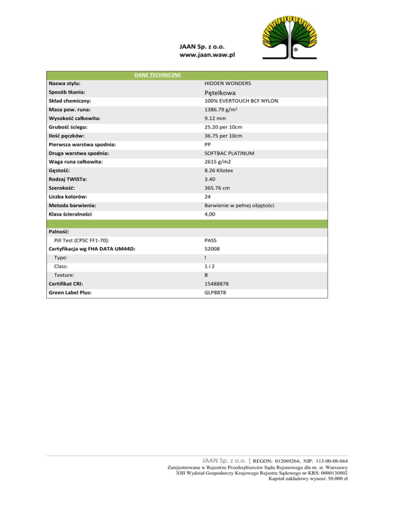 JAAN Sp. z o.o. www.jaan.waw.pl DANE TECHNICZNE Nazwa stylu: HIDDEN WONDERS Sposób tkania: Pętelkowa Skład chemiczny: 100% EVERTOUCH BCF NYLON Masa pow. runa: 1386.79 g/m2 Wysokość całkowita: 9.12 mm Grubość ściegu: 25.20 per 10cm Ilość pęczków: 36.75 per 10cm Pierwsza warstwa spodnia: PP Druga warstwa spodnia: SOFTBAC PLATINUM Waga runa całkowita: 2615 g/m2 Gęstość: 8.26 Kilotex Rodzaj TWISTa: 3.40 Szerokość: 365.76 cm Liczba kolorów: 24 Metoda barwienia: Barwienie w pełnej objętości Klasa ścieralności 4,00 Palność: Pill Test (CPSC FF1-70): Certyfikacja wg FHA DATA UM44D: PASS 52008 Type: I Class: 1i2 Texture: B Certifikat CRI: 15488878 Green Label Plus: GLP8878 JAAN Sp. z o.o. | REGON: 012069264; NIP: 113-00-08-064 Zarejestrowana w Rejestrze Przedsiębiorców Sądu Rejonowego dla m. st. Warszawy XIII Wydział Gospodarczy Krajowego Rejestru Sądowego nr KRS: 0000130802 Kapitał zakładowy wynosi: 50.000 zł