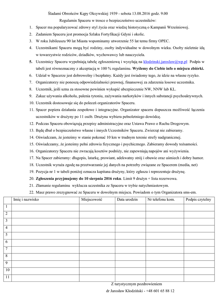 Śladami Obrońców Kępy Oksywskiej 1939 - sobota 13.08.2016 godz. 9.00 Regulamin Spaceru w trosce o bezpieczeństwo uczestników: 1. Spacer ma popularyzować zdrowy styl życia oraz wiedzę historyczną o Kampanii Wrześniowej. 2. Zadaniem Spaceru jest promocja Szlaku Fortyfikacji Gdyni i okolic. 3. W roku Jubileuszu 90 lat Miasta wspominamy utworzenie 55 lat temu firmy OPEC. 4. Uczestnikami Spaceru mogą być rodziny, osoby indywidualne w dowolnym wieku. Osoby nieletnie idą w towarzystwie rodziców, dziadków, wychowawcy lub nauczyciela. 5. Uczestnicy Spaceru wypełniają tabelę zgłoszeniową i wysyłają na [email protected] Podpis w tabeli jest równoznaczny z akceptacją w 100 % regulaminu. Wyślemy do Ciebie info o miejscu zbiórki. 6. Udział w Spacerze jest dobrowolny i bezpłatny. Każdy jest świadomy tego, że idzie na własne ryzyko. 7. Organizatorzy nie ponoszą odpowiedzialności prawnej, finansowej za zdarzenia losowe uczestnika. 8. Uczestnik, jeśli uzna za stosowne powinien wykupić ubezpieczenie NW, NNW lub KL. 9. Zakaz używania alkoholu, palenia tytoniu, zażywania narkotyków i innych substancji psychoaktywnych. 10. Uczestnik dostosowuje się do poleceń organizatorów Spaceru. 11. Spacer popiera działania zespołowe i integracyjne. Organizator spaceru dopuszcza możliwość łączenia uczestników w drużyny po 11 osób. Drużyna wybiera pełnoletniego dowódcę. 12. Podczas Spaceru obowiązują przepisy administracyjne oraz Ustawa Prawo o Ruchu Drogowym. 13. Będę dbał o bezpieczeństwo własne i innych Uczestników Spaceru. Zwierząt nie zabieramy. 14. Oświadczam, że jesteśmy w stanie pokonać 10 km w trudnym terenie strefy nadgranicznej. 15. Oświadczamy, że jesteśmy pełni zdrowia fizycznego i psychicznego. Zabieramy dowody tożsamości. 16. Organizatorzy Spaceru nie zwracają kosztów podróży, nie zapewniają napojów ani wyżywienia. 17. Na Spacer zabieramy: długopis, latarkę, prowiant, adekwatny strój i obuwie oraz uśmiech i dobry humor. 18. Uczestnik wyraża zgodę na przetwarzanie jej danych na potrzeby związane ze Spacerem (media, net) 19. Pozycja nr 1 w tabeli poniżej oznacza kapitana drużyny, który zgłasza i reprezentuje drużynę. 20. Zgłoszenia przyjmujemy do 10 sierpnia 2016 roku. Limit 9 drużyn + lista rezerwowa. 21. Złamanie regulaminu wyklucza uczestnika ze Spaceru w trybie natychmiastowym. 22. Masz prawo zrezygnować ze Spaceru w dowolnym miejscu. Powiadom o tym Organizatora sms-em. Imię i nazwisko Miejscowość Data urodzin Nr telefonu kom. 1 2 3 4 5 6 7 8 9 10 11 Z turystycznym pozdrowieniem dr Jarosław Kłodziński - +48 601 65 88 12 Podpis czytelny