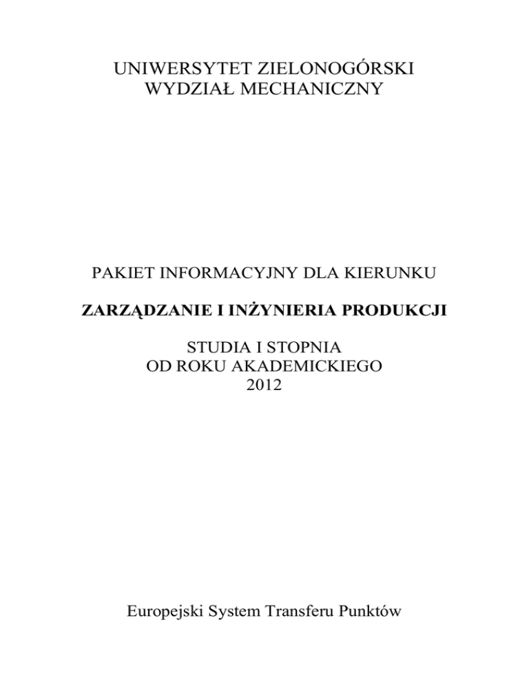 UNIWERSYTET ZIELONOGÓRSKI WYDZIAŁ MECHANICZNY PAKIET INFORMACYJNY DLA KIERUNKU ZARZĄDZANIE I INŻYNIERIA PRODUKCJI STUDIA I STOPNIA OD ROKU AKADEMICKIEGO 2012 Europejski System Transferu Punktów W Y D Z I A Ł M E C H A N I C Z N Y CZĘŚĆ II.A. INFORMACJE O STUDIACH INRORMACJE PODSTAWOWE KIERUNEK ZARZĄDZANIE I INŻYNIERIA PRODUKCJI Kierunek Zarządzanie i Inżynieria Produkcji na Wydziale Mechanicznym UZ łączy wiedzę i umiejętności inżynierskie kierunków: Mechanika i Budowa Maszyn oraz Informatyka z podstawami wiedzy ekonomicznej oraz umiejętnościami z zakresu zarządzania i marketingu. Studia na kierunku zapewniają więc absolwentowi wiedzę niezbędną do projektowania i nadzoru technicznego procesów produkcyjnych, jak i wdrażania nowoczesnych metod ich zarządzania. W procesie kształcenia szczególny nacisk kładziony jest na umiejętność wykorzystania narzędzi informatycznych w: projektowaniu (CAD), wytwarzaniu (CAM), zapewnianiu jakości (CAQ), planowaniu i sterowaniu procesami produkcyjnymi (systemy MRP, ERP, OPT). Kształcenie na kierunku Zarządzanie i Inżynieria Produkcji odbywa się na poziomie I i II stopnia w formie studiów stacjonarnych i niestacjonarnych. Uzyskujący tytuł zawodowy inżyniera absolwent studiów pierwszego stopnia posiada zarówno umiejętność podejmowania decyzji menadżerskich, jak i rozwiązywania problemów technicznych z zakresu inżynierii produkcji. Absolwent przygotowany jest więc do pełnienia funkcji kierowniczych i nadzoru nad procesami i systemami produkcyjnymi, sprawnie posługując się nowoczesnymi metodami ukierunkowanymi na wzrost produktywności, podnoszenie jakości produktów oraz podnoszenie wydajności pracy. Szczególną cechą absolwenta jest umiejętność pracy w interdyscyplinarnym zespole. Uzyskujący tytuł zawodowy magistra inżyniera absolwent studiów drugiego stopnia posiada zaawansowaną wiedzę inżynierską z zakresu inżynierii mechanicznej oraz z zakresu organizacji i zarządzania. Przygotowany jest więc do twórczego działania w tych obszarach, w tym do: projektowania nowych procesów i systemów produkcyjnych oraz systemów ich zarządzania, prowadzenia i organizowania prac badawczo-rozwojowych i transferu technologii. Zarówno na studiach pierwszego, jak i drugiego stopnia istnieje możliwość kształcenia w ramach specjalności: Inżynieria Jakości, Zarządzanie Logistyczne, Zarządzanie Produkcją i Usługami. Efekty kształcenia odnoszą się do dziedziny nauk technicznych w dyscyplinie Inżynieria Produkcji. Szczegółowe informacje na temat standardów kształcenia, planów studiów oraz programów przedmiotów realizowanych na kierunku znajdują się na stronie internetowej Instytutu Informatyki i Zarządzania Produkcją: www.iizp.uz.zgora.pl. http://www.iizp.uz.zgora.pl U N I W E R S Y T E T Z I E L O N O G Ó R S K I CHARAKTERYSTYKA SPECJALNOŚCI SPECJALNOŚĆ INŻYNIERIA JAKOŚCI Absolwent specjalności łączy inżynierską wiedzę z zakresu budowy i eksploatacji maszyn z elementami wiedzy z dziedziny ekonomii i informatyki stosowanej; zna również i potrafi wdrażać systemy zapewniania jakości oraz nowoczesne techniki realizacji prac badawczorozwojowych (po studiach drugiego stopnia). Rosnąca na rynku konkurencja wśród przedsiębiorstw produkcyjnych i usługowych wymusza na nich konieczność legitymowania się certyfikatami jakości, a to wiąże się z koniecznością zatrudniania specjalistów z zakresu Inżynierii Jakości, których kształcą od lat uczelnie i wydziały o profilu ekonomicznym, przekazując im jednak przede wszystkim wiedzę z zakresu systemowych aspektów jakości. W odróżnieniu od nich nasz absolwent wyposażony jest dodatkowo w odpowiednią wiedzę inżynierską, co daje mu wyraźną przewagę. Absolwent specjalności Inżynieria Jakości przygotowany jest do twórczej i kreatywnej pracy w dziedzinie: projektowania, wdrażania i prowadzenia systemowego zarządzania jakością w oparciu o normy ISO 9000:2000, z uwzględnieniem zapisów norm ISO 14000 i PN-N 18000, realizacji audytów wewnętrznych, nadzorowania procedur pozyskiwania i utrzymania certyfikatów jakości, stosowania statystycznych technik kontroli i sterowania procesów produkcyjnych, stosowania technicznych środków kontroli jakości materiałów i wyrobów oraz procesów technologicznych, identyfikacji wad wyrobów i analizy przyczyn ich powstawania, wdrażania komercyjnych-informatycznych systemów wspomagających zarządzanie jakością. Poszukiwani na rynku europejskim absolwenci specjalności Inżynieria Jakości znajdują zatrudnienie na stanowisku: menedżera ds. jakości, pełnomocnika dyrektora ds. systemu zarządzania jakością, audytora wewnętrznego, specjalisty w zakresie zapewniania jakości, specjalisty ds. zarządzania projektami i procesami. Wiedza inżynierska z zakresu budowy maszyn wsparta gruntownym przygotowaniem informatycznym, ekonomicznym i menedżerskim gwarantuje zatrudnienie absolwentów zarówno w dużych, jak i małych przedsiębiorstwach produkcyjnych i usługowych. 2 http://www.iizp.uz.zgora.pl W Y D Z I A Ł M E C H A N I C Z N Y SPECJALNOŚĆ ZARZĄDZANIE LOGISTYCZNE Absolwenci tej specjalności zdobywają wykształcenie z zakresu zarządzania logistycznego i inżynierii produkcji, przy czym szczególny nacisk położony jest na zdobycie umiejętności w korzystaniu z informatycznych narzędzi wspomagających zarządzanie łańcuchem dostaw, planowanie i sterowanie produkcją, projektowanie wyrobów oraz inżynierię kosztów. Do tych narzędzi można zaliczyć: zintegrowane systemy informatyczne klasy ERP wspomagające zarządzanie przedsiębiorstwem – SAP i Rekord.ERP, informatyczne systemy wspomagania zarządzania przedsięwzięciami – MS Projekt, komputerowe wspomaganie prac inżynierskich – techniki CAx, systemy do modelowania i symulacji oraz reinżynierii procesów produkcyjnych, systemy zarządzania zasobami ludzkimi i relacjami z
