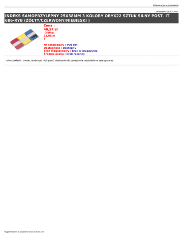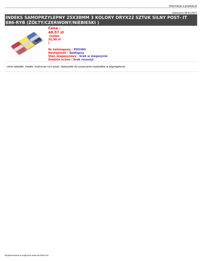 Informacje o produkcie Utworzono 08-03-2017 INDEKS SAMOPRZYLEPNY 25X38MM 3 KOLORY ORYX22 SZTUK SILNY POST- IT 686-RYB (ŻÓŁTY/CZERWONY/NIEBIESKI ) Cena : 40,57 zł (netto: 32,98 zł ) Nr katalogowy : PO5484 Dostępność : Dostępny Stan magazynowy : brak w magazynie Średnia ocena : brak recenzji - silne zakładki trwałe, można po nich pisać, doskonałe do oznaczania rozdziałów w segregatorze Wygenerowano w programie www.oscGold.com