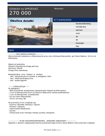 Wierzbin DZIAŁKA na SPRZEDAŻ 270 000 377/3445/OGS ResidentalBuilding 270 000 PLN 240 PLN 1121 28 40 Rectangle Flat Opis ------------OPIS NIERUCHOMOŚCI-----------Nieruchomość położona w Wojcieszynie przy ulicy Królowej Marysieńki, gm Stare Babice, 10 km od Warszawy. Wjazd od południa. Dojazd utwardzoną drogą gminną. Wymiary 28x40 Druga linia zabudowy. Bezpośrednio przy działce w drodze: - sieć kanalizacyjna w drodze w odległości 50m - sieć elektroenergetyczna, - sieć wodociągowa --------LOKALIZACJA------W odległości: - 900 przystanek autobusowy (bezpośredni dojazd do Warszawy), - 1 km (w Borzęcinie),8 km (w Starych Babicach) szkoła podstawowa, - 1 km (w Borzęcinie), przedszkole, - 6,5 km Park Ołtarzewski, - 10 km od trasy S8, W promieniu 6 km znajduje się: - Gminny Ośrodek rekreacji i Sportu - Fitness i siłownia, - hipermarket Biedronka, - poczta - restauracje oraz różnego rodzaju punkty usługowe. ------------------PLAN ZAGOSPODAROWANIA - WARUNKI ZABUDOWY---------------Zgodnie z planem zagospodarowania przestrzennego Gminy Stare Babice nieruchomość znajduje RE Capital spółka z o. o. się w terenie zabudowy mieszkaniowej jednorodzinnej oznaczonej jako MN2. Maksymalna wysokość zabudowy z zastrzeżeniem 11,5 m (2 kondygnacje nadziemne oraz kondygnacja poddasza użytkowego) przy zastosowaniu dachów o nachyleniu połaci 20o -60o, dla dachów płaskich - maksymalna wysokość zabudowy 7,5 m (2 kondygnacje nadziemne). Powierzchnia biologicznie czynna minimum 60%. --------------------------------------------------------------------------------------------------------- Zapraszamy do obejrzenia działki. RE Capital Nieruchomości mail: [email protected] Juliusz Kwiatkowski tel. +48530985656 tel. 225353628 email: [email protected] RE Capital spółka z o. o. Powered by TCPDF (www.tcpdf.org)
