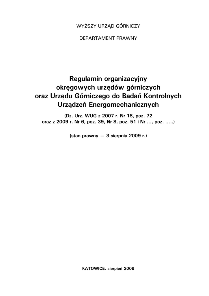 WYŻSZY URZĄD GÓRNICZY DEPARTAMENT PRAWNY Regulamin organizacyjny okręgowych urzędów górniczych oraz Urzędu Górniczego do Badań Kontrolnych Urządzeń Energomechanicznych (Dz. Urz. WUG z 2007 r. Nr 18, poz. 72 oraz z 2009 r. Nr 6, poz. 39, Nr 8, poz. 51 i Nr …, poz. …..) (stan prawny — 3 sierpnia 2009 r.) KATOWICE, sierpień 2009 Tekst ujednolicony uwzględnia zmiany wprowadzone przez: 1) § 1 zarządzenia nr 11 Prezesa Wyższego Urzędu Górniczego z dnia 29 kwietnia 2009 r. zmieniającego zarządzenie w sprawie regulaminu organizacyjnego okręgowych urzędów górniczych oraz Urzędu Górniczego do Badań Kontrolnych Urządzeń Energomechanicznych (Dz. Urz. WUG Nr 6, poz. 39), które weszły w życie z dniem 1 maja 2009 r. i zostały zaznaczone kursywą; 2) § 1 zarządzenia nr 18 Prezesa Wyższego Urzędu Górniczego z dnia 1 lipca 2009 r. zmieniającego zarządzenie w sprawie regulaminu organizacyjnego okręgowych urzędów górniczych oraz Urzędu Górniczego do Badań Kontrolnych Urządzeń Energomechanicznych (Dz. Urz. WUG Nr 8, poz. 51), które weszły w życie z dniem 1 lipca 2009 r. i zostały zaznaczone pogrubioną kursywą; 3) § 1 zarządzenia nr 22 Prezesa Wyższego Urzędu Górniczego z dnia 3 sierpnia 2009 r. zmieniającego zarządzenie w sprawie regulaminu organizacyjnego okręgowych urzędów górniczych oraz Urzędu Górniczego do Badań Kontrolnych Urządzeń Energomechanicznych (skierowanego do ogłoszenia), które weszły w życie z dniem 3 sierpnia 2009 r. i zostały zaznaczone kursywą w kolorze czerwonym. Regulamin organizacyjny OUG oraz UGBKUE ZARZĄDZENIE Nr 18 PREZESA WYŻSZEGO URZĘDU GÓRNICZEGO z dnia 9 listopada 2007 r. w sprawie regulaminu organizacyjnego okręgowych urzędów górniczych oraz Urzędu Górniczego do Badań Kontrolnych Urządzeń Energomechanicznych (Dz. Urz. WUG Nr 18, poz. 72 oraz z 2009 r. Nr 6, poz. 39, Nr 8, poz. 51 i Nr …., poz. ……) Na podstawie art. 108 ust. 6 ustawy z dnia 4 lutego 1994 r. — Prawo geologiczne i górnicze (Dz. U. z 2005 r. Nr 228, poz. 1947, z późn. zm.1)) zarządza się, co następuje: § 1. Okręgowym urzędom górniczym oraz Urzędowi Górniczemu do Badań Kontrolnych Urządzeń Energomechanicznych nadaje się regulamin organizacyjny, stanowiący załącznik do zarządzenia. § 2. Traci moc zarządzenie nr 2 Prezesa Wyższego Urzędu Górniczego z dnia 8 lipca 2002 r. w sprawie regulaminu organizacyjnego okręgowych urzędów górniczych oraz Urzędu Górniczego do Badań Kontrolnych Urządzeń Energomechanicznych (Dz. Urz. WUG Nr 1, poz. 3, z późn. zm.2)). § 3. Zarządzenie wchodzi w życie z dniem 15 listopada 2007 r. Załącznik do zarządzenia nr 18 Prezesa Wyższego Urzędu Górniczego z dnia 9 listopada 2007 r. REGULAMIN ORGANIZACYJNY OKRĘGOWYCH URZĘDÓW GÓRNICZYCH ORAZ URZĘDU GÓRNICZEGO DO BADAŃ KONTROLNYCH URZĄDZEŃ ENERGOMECHANICZNYCH Rozdział 1 Przepisy ogólne § 1. 1. Regulamin organizacyjny okręgowych urzędów górniczych oraz Urzędu Górniczego do Badań Kontrolnych Urządzeń Energomechanicznych, zwany dalej „Regulaminem”, określa organizację i zasady działania okręgowych urzędów górniczych, zwanych dalej „OUG”, oraz Urzędu Górniczego do Badań Kontrolnych Urządzeń Energomechanicznych, zwanego dalej „UGBKUE”. 2. OUG oraz UGBKUE, zwane dalej „urzędami górniczymi”, działają na podstawie przepisów: 1) ustawy z dnia 4 lutego 1994 r. — Prawo geologiczne i górnicze; 2) rozporządzenia Ministra Spraw Wewnętrznych i Administracji z dnia 25 czerwca 2002 r. w sprawie ustalenia siedzib i właściwości miejscowej okręgowych urzędów górniczych oraz zniesienia Okręgowego Urzędu Górniczego w Wałbrzychu (Dz. U. Nr 96, poz. 863, z późn. zm.3)); 3) rozporządzenia Ministra Środowiska z dnia 29 czerwca 2009 r. w sprawie właściwości rzeczowej specjalistycznego urzędu górniczego — Urzędu Górniczego do Badań Kontrolnych Urządzeń Energomechanicznych (Dz. U. Nr 102, poz. 857); 1) 2) 3) Zmiany tekstu jednolitego wymienionej ustawy zostały ogłoszone w Dz. U. z 2006 r. Nr 133, poz. 934, Nr 170, poz. 1217, Nr 190, poz. 1399 i Nr 249, poz. 1834, z 2007 r. Nr 21, poz. 125 i Nr 82, poz. 556, z 2008 r. Nr 138, poz. 865, Nr 154, poz. 958, Nr 199, poz. 1227 i Nr 227, poz. 1505 oraz z 2009 r. Nr 18, poz. 97. Zmiany wymienionego zarządzenia zostały ogłoszone w Dz. Urz. WUG z 2003 r. Nr 4, poz. 16, z 2004 r. Nr 5, poz. 25 oraz z 2005 r. Nr 7, poz. 26. Zmiany wymienionego rozporządzenia zostały ogłoszone w Dz. U. z 2002 r. Nr 172, poz. 1411, z 2005 r. Nr 69, poz. 620 oraz z 2006 r. Nr 90, poz. 630. Wyższy Urząd Górniczy — Departament Prawny 1 Regulamin organizacyjny OUG oraz UGBKUE 4) wewnętrznych aktów prawnych wydanych przez Prezesa Wyższego Urzędu Górniczego. 3. Dyrektor OUG we Wrocławiu wykonuje swoje zadania przy pomocy: 1) biura we Wrocławiu, 2) biura w Wałbrzychu — w zakresie właściwości miejscowej określonej w § 1 pkt 12 rozporządzenia Ministra Spraw Wewnętrznych i Administracji z dnia 25 czerwca 2002 r. w sprawie ustalenia siedzib i właściwości miejscowej okręgowych urzędów górniczych oraz zniesienia Okręgowego Urzędu Górniczego w Wałbrzychu. § 2. Ustala się następujące symbole literowe urzędów górniczych: 1) OUG w Gliwicach — GLI; 2) OUG w Katowicach — KAT; 3) OUG w Kielcach — KIE; 4) OUG w Krakowie — KRA; 5) OUG w Krośnie — KRO; 6) OUG w Lublinie — LUB; 7) OUG w Poznaniu — POZ; 8) OUG w Rybniku — RYB; 9) OUG w Warszawie — WAR; 10) OUG we Wrocławiu — WRO; 11) UGBKUE — UGB. § 3. 1. W strukturze organizacyjnej urzędów górniczych są zatrudnieni: 1) pracownicy inspekcyjno-techniczni, do których zalicza się pracowników posiadających wyższe wykształcenie niezbędne do wykonywania czynności inspekcyjno-technicznych w ramach zadań organów nadzoru górniczego, w szczególności w zakresie nadzoru i kontroli nad ruchem zakładu górniczego; 2) pracownicy