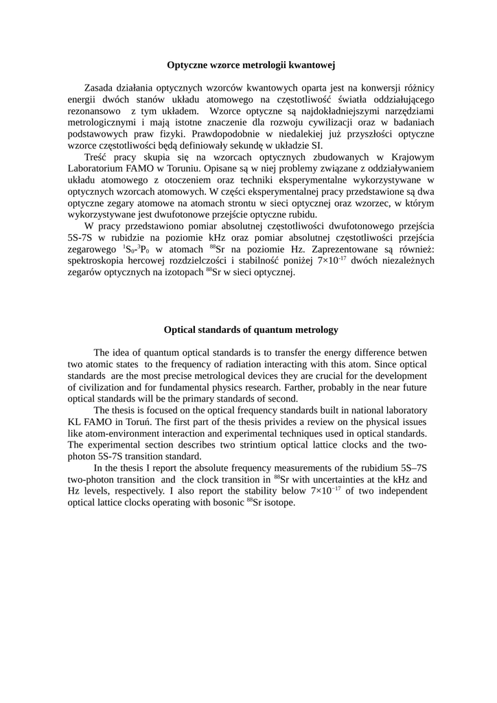 Optyczne wzorce metrologii kwantowej Zasada działania optycznych wzorców kwantowych oparta jest na konwersji różnicy energii dwóch stanów układu atomowego na częstotliwość światła oddziałującego rezonansowo z tym układem. Wzorce optyczne są najdokładniejszymi narzędziami metrologicznymi i mają istotne znaczenie dla rozwoju cywilizacji oraz w badaniach podstawowych praw fizyki. Prawdopodobnie w niedalekiej już przyszłości optyczne wzorce częstotliwości będą definiowały sekundę w układzie SI. Treść pracy skupia się na wzorcach optycznych zbudowanych w Krajowym Laboratorium FAMO w Toruniu. Opisane są w niej problemy związane z oddziaływaniem układu atomowego z otoczeniem oraz techniki eksperymentalne wykorzystywane w optycznych wzorcach atomowych. W części eksperymentalnej pracy przedstawione są dwa optyczne zegary atomowe na atomach strontu w sieci optycznej oraz wzorzec, w którym wykorzystywane jest dwufotonowe przejście optyczne rubidu. W pracy przedstawiono pomiar absolutnej częstotliwości dwufotonowego przejścia 5S-7S w rubidzie na poziomie kHz oraz pomiar absolutnej częstotliwości przejścia zegarowego 1S0-3P0 w atomach 88Sr na poziomie Hz. Zaprezentowane są również: spektroskopia hercowej rozdzielczości i stabilność poniżej 7×10-17 dwóch niezależnych zegarów optycznych na izotopach 88Sr w sieci optycznej. Optical standards of quantum metrology The idea of quantum optical standards is to transfer the energy difference betwen two atomic states to the frequency of radiation interacting with this atom. Since optical standards are the most precise metrological devices they are crucial for the development of civilization and for fundamental physics research. Farther, probably in the near future optical standards will be the primary standards of second. The thesis is focused on the optical frequency standards built in national laboratory KL FAMO in Toruń. The first part of the thesis privides a review on the physical issues like atom-environment interaction and experimental techniques used in optical standards. The experimental section describes two strintium optical lattice clocks and the twophoton 5S-7S transition standard. In the thesis I report the absolute frequency measurements of the rubidium 5S–7S two-photon transition and the clock transition in 88Sr with uncertainties at the kHz and Hz levels, respectively. I also report the stability below 7×10−17 of two independent optical lattice clocks operating with bosonic 88Sr isotope.