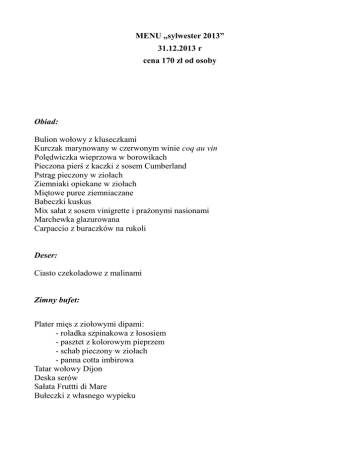 MENU „sylwester 2013” 31.12.2013 r cena 170 zł od osoby Obiad: Bulion wołowy z kluseczkami Kurczak marynowany w czerwonym winie coq au vin Polędwiczka wieprzowa w borowikach Pieczona pierś z kaczki z sosem Cumberland Pstrąg pieczony w ziołach Ziemniaki opiekane w ziołach Miętowe puree ziemniaczane Babeczki kuskus Mix sałat z sosem vinigrette i prażonymi nasionami Marchewka glazurowana Carpaccio z buraczków na rukoli Deser: Ciasto czekoladowe z malinami Zimny bufet: Plater mięs z ziołowymi dipami: - roladka szpinakowa z łososiem - pasztet z kolorowym pieprzem - schab pieczony w ziołach - panna cotta imbirowa Tatar wołowy Dijon Deska serów Sałata Fruttti di Mare Bułeczki z własnego wypieku Kolacja: Barszcz z krokietem Crostini z wątróbką duszoną w białym winie i szałwii Szaszłyki grillowane Pieczywo z własnego wypieku Kawa, herbata, woda mineralna – dostępne przez całe przyjęcie bez ograniczeń W cenie biletu szampan na toast
