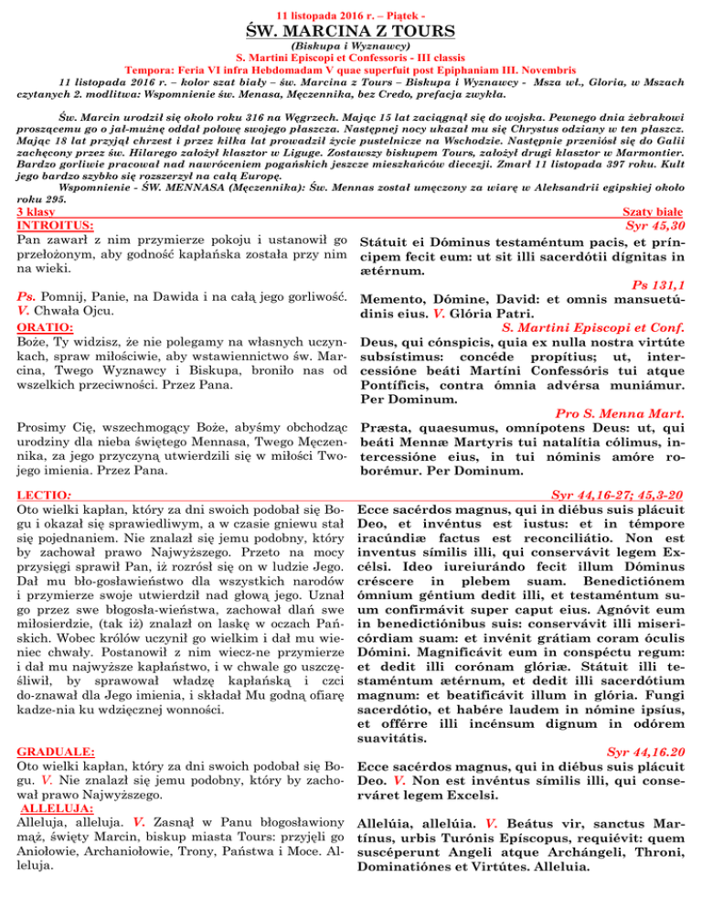11 listopada 2016 r. – Piątek - ŚW. MARCINA Z TOURS (Biskupa i Wyznawcy) S. Martini Episcopi et Confessoris - III classis Tempora: Feria VI infra Hebdomadam V quae superfuit post Epiphaniam III. Novembris 11 listopada 2016 r. – kolor szat biały – św. Marcina z Tours – Biskupa i Wyznawcy - Msza wł., Gloria, w Mszach czytanych 2. modlitwa: Wspomnienie św. Menasa, Męczennika, bez Credo, prefacja zwykła. Św. Marcin urodził się około roku 316 na Węgrzech. Mając 15 lat zaciągnął się do wojska. Pewnego dnia żebrakowi proszącemu go o jałmużnę oddał połowę swojego płaszcza. Następnej nocy ukazał mu się Chrystus odziany w ten płaszcz. Mając 18 lat przyjął chrzest i przez kilka lat prowadził życie pustelnicze na Wschodzie. Następnie przeniósł się do Galii zachęcony przez św. Hilarego założył klasztor w Liguge. Zostawszy biskupem Tours, założył drugi klasztor w Marmontier. Bardzo gorliwie pracował nad nawróceniem pogańskich jeszcze mieszkańców diecezji. Zmarł 11 listopada 397 roku. Kult jego bardzo szybko się rozszerzył na całą Europę. Wspomnienie - ŚW. MENNASA (Męczennika): Św. Mennas został umęczony za wiarę w Aleksandrii egipskiej około roku 295. 3 klasy Szaty białe INTROITUS: Syr 45,30 Pan zawarł z nim przymierze pokoju i ustanowił go Státuit ei Dóminus testaméntum pacis, et prínprzełożonym, aby godność kapłańska została przy nim cipem fecit eum: ut sit illi sacerdótii dígnitas in na wieki. ætérnum. Ps 131,1 Ps. Pomnij, Panie, na Dawida i na całą jego gorliwość. Memento, Dómine, David: et omnis mansuetúV. Chwała Ojcu. dinis eius. V. Glória Patri. ORATIO: S. Martini Episcopi et Conf. Boże, Ty widzisz, że nie polegamy na własnych uczyn- Deus, qui cónspicis, quia ex nulla nostra virtúte kach, spraw miłościwie, aby wstawiennictwo św. Mar- subsístimus: concéde propítius; ut, intercina, Twego Wyznawcy i Biskupa, broniło nas od cessióne beáti Martíni Confessóris tui atque wszelkich przeciwności. Przez Pana. Pontíficis, contra ómnia advérsa muniámur. Per Dominum. Pro S. Menna Mart. Prosimy Cię, wszechmogący Boże, abyśmy obchodząc Præsta, quaesumus, omnípotens Deus: ut, qui urodziny dla nieba świętego Mennasa, Twego Męczen- beáti Mennæ Martyris tui natalítia cólimus, innika, za jego przyczyną utwierdzili się w miłości Two- tercessióne eius, in tui nóminis amóre rojego imienia. Przez Pana. borémur. Per Dominum. Syr 44,16-27; 45,3-20 Ecce sacérdos magnus, qui in diébus suis plácuit Deo, et invéntus est iustus: et in témpore iracúndiæ factus est reconciliátio. Non est inventus símilis illi, qui conservávit legem Excélsi. Ideo iureiurándo fecit illum Dóminus créscere in plebem suam. Benedictiónem ómnium géntium dedit illi, et testaméntum suum confirmávit super caput eius. Agnóvit eum in benedictiónibus suis: conservávit illi misericórdiam suam: et invénit grátiam coram óculis Dómini. Magnificávit eum in conspéctu regum: et dedit illi corónam glóriæ. Státuit illi testaméntum ætérnum, et dedit illi sacerdótium magnum: et beatificávit illum in glória. Fungi sacerdótio, et habére laudem in nómine ipsíus, et offérre illi incénsum dignum in odórem suavitátis. GRADUALE: Syr 44,16.20 Oto wielki kapłan, który za dni swoich podobał się Bo- Ecce sacérdos magnus, qui in diébus suis plácuit gu. V. Nie znalazł się jemu podobny, który by zacho- Deo. V. Non est invéntus símilis illi, qui consewał prawo Najwyższego. rváret legem Excelsi. ALLELUJA: Alleluja, alleluja. V. Zasnął w Panu błogosławiony Allelúia, allelúia. V. Beátus vir, sanctus Marmąż, święty Marcin, biskup miasta Tours: przyjęli go tínus, urbis Turónis Epíscopus, requiévit: quem Aniołowie, Archaniołowie, Trony, Państwa i Moce. Al- suscéperunt Angeli atque Archángeli, Throni, leluja. Dominatiónes et Virtútes. Alleluia. LECTIO: Oto wielki kapłan, który za dni swoich podobał się Bogu i okazał się sprawiedliwym, a w czasie gniewu stał się pojednaniem. Nie znalazł się jemu podobny, który by zachował prawo Najwyższego. Przeto na mocy przysięgi sprawił Pan, iż rozrósł się on w ludzie Jego. Dał mu błogosławieństwo dla wszystkich narodów i przymierze swoje utwierdził nad głową jego. Uznał go przez swe błogosławieństwa, zachował dlań swe miłosierdzie, (tak iż) znalazł on laskę w oczach Pań skich. Wobec królów uczynił go wielkim i dał mu wieniec chwały. Postanowił z nim wieczne przymierze i dał mu najwyższe kapłaństwo, i w chwale go uszczę śliwił, by sprawował władzę kapłańską i czci doznawał dla Jego imienia, i składał Mu godną ofiarę kadzenia ku wdzięcznej wonności. Łk 11,33-36 In illo témpore: Dixit Iesus discípulis suis: Nemo lucérnam accéndit, et in abscóndito ponit, neque sub módio: sed supra candelábrum, ut, qui ingrediúntur, lumen vídeant. Lucérna córporis tui est óculus tuus. Si óculus tuus fúerit simplex, totum corpus tuum lúcidum erit: si autem nequam fúerit, étiam corpus tuum tenebrósum erit. Vide ergo, ne lumen, quod in te est, ténebræ sint. Si ergo corpus tuum totum lúcidum fúerit, non habens áliquam partem tenebrárum, erit lúcidum totum, et sicut lucérna fulgóris illuminábit te. OFFERTORIUM: Ps 88,25 Z nim moja wierność i moja łaska; w moim imieniu Véritas mea et misericórdia mea cum ipso: et in moc jego wzrośnie. nómine meo exaltábitur cornu eius. EVANGELIUM: Onego czasu: Rzekł Jezus uczniom swoim: Nikt nie zapala światła i nie stawia go w ukryciu ani pod korcem, lecz na świeczniku, aby jego blask widzieli ci, którzy wchodzą. Światłem ciała jest twoje oko. Jeśli twoje oko jest zdrowe, całe twoje ciało będzie w świetle. Lecz jeśli jest chore, ciało twoje będzie również w ciemności. Patrz więc, żeby światło, które jest w tobie, nie było ciemnością. Jeśli zatem całe twoje ciało będzie w świetle, nie mają