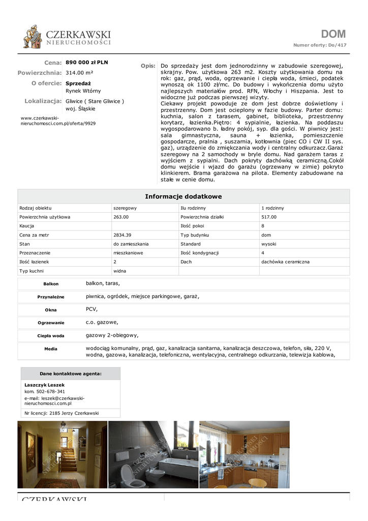 DOM Numer oferty: Do/417 Cena: 890 000 zł PLN Powierzchnia: 314.00 m² O ofercie: Sprzedaż Rynek Wtórny Lokalizacja: Gliwice ( Stare Gliwice ) woj. Śląskie www.czerkawskinieruchomosci.com.pl/oferta/9929 Opis: Do sprzedaży jest dom jednorodzinny w zabudowie szeregowej, skrajny. Pow. użytkowa 263 m2. Koszty użytkowania domu na rok: gaz, prąd, woda, ogrzewanie i ciepła woda, śmieci, podatek wynoszą ok 1100 zł/mc. Do budowy i wykończenia domu użyto najlepszych materiałów prod. RFN, Włochy i Hiszpania. Jest to widoczne już podczas pierwszej wizyty. Ciekawy projekt powoduje ze dom jest dobrze doświetlony i przestrzenny. Dom jest ocieplony w fazie budowy. Parter domu: kuchnia, salon z tarasem, gabinet, biblioteka, przestrzenny korytarz, łazienka.Piętro: 4 sypialnie, łazienka. Na poddaszu wygospodarowano b. ładny pokój, syp. dla gości. W piwnicy jest: sala gimnastyczna, sauna + łazienka, pomieszczenie gospodarcze, pralnia , suszarnia, kotłownia (piec CO i CW II sys. gaz), urządzenie do zmiękczania wody i centralny odkurzacz.Garaż szeregowy na 2 samochody w bryle domu. Nad garażem taras z wyjściem z sypialni. Dach pokryty dachówką ceramiczną.Cokół domu wejście i wjazd do garażu (ogrzewany w zimie) pokryto klinkierem. Brama garażowa na pilota. Elementy zabudowane na stałe w cenie domu. Informacje dodatkowe Rodzaj obiektu szeregowy Ilu rodzinny 1 rodzinny Powierzchnia użytkowa 263.00 Powierzchnia działki 517.00 Kaucja Ilość pokoi 8 Cena za metr 2834.39 Typ budynku dom Stan do zamieszkania Standard wysoki Przeznaczenie mieszkaniowe Ilość kondygnacji 4 Ilość łazienek 2 Dach dachówka ceramiczna Typ kuchni widna Balkon Przynależne Okna balkon, taras, piwnica, ogródek, miejsce parkingowe, garaż, PCV, Ogrzewanie c.o. gazowe, Ciepła woda gazowy 2-obiegowy, Media wodociąg komunalny, prąd, gaz, kanalizacja sanitarna, kanalizacja deszczowa, telefon, siła, 220 V, wodna, gazowa, kanalizacja, telefoniczna, wentylacyjna, centralnego odkurzania, telewizja kablowa, Dane kontaktowe agenta: Laszczyk Leszek kom. 502-678-341 e-mail: [email protected] Nr licencji: 2185 Jerzy Czerkawski www.czerkawski-nieruchomosci.com.pl