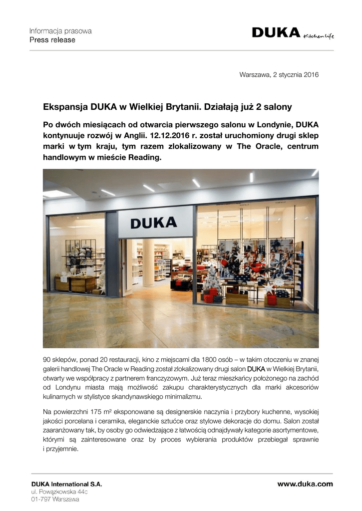 Warszawa, 2 stycznia 2016 Ekspansja DUKA w Wielkiej Brytanii. Działają już 2 salony Po dwóch miesiącach od otwarcia pierwszego salonu w Londynie, DUKA kontynuuje rozwój w Anglii. 12.12.2016 r. został uruchomiony drugi sklep marki w tym kraju, tym razem zlokalizowany w The Oracle, centrum handlowym w mieście Reading. 90 sklepów, ponad 20 restauracji, kino z miejscami dla 1800 osób – w takim otoczeniu w znanej galerii handlowej The Oracle w Reading został zlokalizowany drugi salon DUKA w Wielkiej Brytanii, otwarty we współpracy z partnerem franczyzowym. Już teraz mieszkańcy położonego na zachód od Londynu miasta mają możliwość zakupu charakterystycznych dla marki akcesoriów kulinarnych w stylistyce skandynawskiego minimalizmu. Na powierzchni 175 m² eksponowane są designerskie naczynia i przybory kuchenne, wysokiej jakości porcelana i ceramika, eleganckie sztućce oraz stylowe dekoracje do domu. Salon został zaaranżowany tak, by osoby go odwiedzające z łatwością odnajdywały kategorie asortymentowe, którymi są zainteresowane oraz by proces wybierania produktów przebiegał sprawnie i przyjemnie. Decyzja o uruchomieniu drugiego salonu wiązała się z sukcesami DUKA na arenie międzynarodowej. Sklep w Reading dołączył w ten sposób do salonu w Holandii, 4 salonów w Bułgarii oraz salonu w Anglii. – Konsekwentnie kontynuujemy ekspansję poza granicami Polski. Nasza strategia rozwoju na 2016 r. objęła również wejście na rynek w Wielkiej Brytanii, a do końca roku zostały uruchomione dwa sklepy w tym kraju – mówi Teresa Szynkiewicz, Dyrektor ds. Rozwoju Sieci DUKA International. – Jesteśmy dumni, że możemy przybliżyć obywatelom innych państw swoje produkty, które zdobywają uznanie na nowych rynkach i służą coraz większej liczbie osób: nie tylko w Polsce, ale też poza jej granicami. Naszą misją jest dostarczać akcesoria kuchenne, które pozwalają czerpać radość z gotowania i ze wspólnie spożywanych posiłków. Bardzo się cieszymy, że przewodnia idea marki, Kitchen Life, staje się bliska osobom z różnych krajów. Marka nie ustaje w rozwoju i już planuje kolejne otwarcia salonów w Polsce i zagranicą. Dodatkowych informacji z przyjemnością udzielą Państwu: Paulina Tomczyk Public Bridge Sp. z o.o. [email protected] +48 71 377 52 81 w. 22 +48 783 783 278 Magdalena Tokarska DUKA International S.A. [email protected] +48 22 276 02 55 Historia marki DUKA sięga 1920 roku, kiedy to Hjalmar Blomkvist otworzył swój pierwszy sklep ze szkłem, porcelaną i naczyniami kuchennymi w szwedzkim mieście Linköping. W 1962 połączył firmę z 16 innymi sklepami sprzedającymi szkło oraz porcelanę, tworząc wspólnie sieć DUKA. Niektóre z zaprojektowanych wówczas, klasycznych produktów są dostępne w sprzedaży do dziś. DUKA stała się siecią kojarzoną w całej Szwecji z dobrą obsługą oraz jakością – silna skandynawska marka zaczęła nabierać wyraźnych kształtów. DUKA w Polsce to obecnie sieć ponad 50 sklepów zlokalizowanych w największych centrach handlowych oraz sklep internetowy: www.duka.com. Kitchen life to miejsce wspaniałych doświadczeń, którymi z radością dzielimy się z innymi ludźmi. Umacniamy więzi tworząc wspólne chwile dawania i dzielenia się, autentycznego wyrażania siebie poprzez to, kim jesteśmy, czyli to, co w nas najlepsze. Dlatego w DUKA dokładamy wszelkich starań, aby nasze wysokiej jakości produkty były inspiracją dla coraz to nowych pomysłów na spędzanie czasu ze sobą. Słuchamy ludzi i ich potrzeb, aby nasze propozycje naturalnie odpowiadały ich oczekiwaniom w zakresie bezpieczeństwa, jakości i wyjątkowego wzornictwa. Wszystko to pod hasłem Kitchen life, które jest wizytówką i jednocześnie zobowiązaniem marki DUKA.