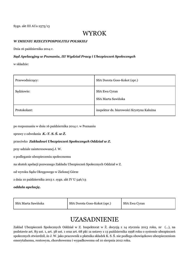 Sygn. akt III AUa 2575/13 WYROK W IMIENIU RZECZYPOSPOLITEJ POLSKIEJ Dnia 16 października 2014 r. Sąd Apelacyjny w Poznaniu, III Wydział Pracy i Ubezpieczeń Społecznych w składzie: Przewodniczący: SSA Dorota Goss-Kokot (spr.) Sędziowie: SSA Ewa Cyran SSA Marta Sawińska Protokolant: inspektor ds. biurowości Krystyna Kałużna po rozpoznaniu w dniu 16 października 2014 r. w Poznaniu sprawy z odwołania K.-T. S. Ś. w Ż. przeciwko Zakładowi Ubezpieczeń Społecznych Oddział w Z. przy udziale zainteresowanej J. W. o podleganie ubezpieczeniu społecznemu na skutek apelacji pozwanego Zakładu Ubezpieczeń Społecznych Oddział w Z. od wyroku Sądu Okręgowego w Zielonej Górze z dnia 10 października 2013 r. sygn. akt IV U 546/13 oddala apelację. SSA Marta Sawińska SSA Dorota Goss-Kokot (spr.) SSA Ewa Cyran UZASADNIENIE Zakład Ubezpieczeń Społecznych Oddział w Z. Inspektorat w Ż. decyzją z 14 stycznia 2013 roku, nr (...), na podstawie art. 83 ust. 1, art. 38 ust. 1 oraz art. 68 pkt 1a ustawy z 13 października 1998 roku o systemie ubezpieczeń społecznych stwierdził, że J. W. jako pracownik u płatnika składek K. S. Ś. nie podlega obowiązkowo ubezpieczeniom emerytalnemu, rentowym, chorobowemu i wypadkowemu od 10 sierpnia 2012 roku. W ocenie organu rentowego, zgłoszenie do ubezpieczenia społecznego J. W. było nieskuteczne bowiem stosunek pracy nie został faktycznie nawiązany. Płatnik składek S. Ś. prowadząca działalność pod firmą (...) złożyła odwołanie od decyzji, wnosząc o jej uchylenie i orzeczenie co do istoty sprawy. Odwołująca wskazała, że J. W. była faktycznie i nadal pozostaje z płatnikiem w stosunku pracy. Organ rentowy błędnie ocenił zebrane w postępowaniu administracyjnym dowody oraz bezpodstawnie przyjął, że chęć skorzystania przez ciężarną z ochrony gwarantowanej pracowniczym ubezpieczeniom społecznym jest niezgodna z prawem. Sąd Okręgowy Sąd Ubezpieczeń Społecznych w Poznaniu wyrokiem z 10 października 2013 roku, w sprawie IV U. 546/13 zmieni zaskarżoną decyzję, stwierdzając, że J. W. jako pracownik u płatnika składek K. T. S. Ś. w Ż. podlega obowiązkowo ubezpieczeniom emerytalnemu, rentowym, chorobowemu i wypadkowemu od 10 sierpnia 2012 roku. Sąd I instancji ustalił następujący stan faktyczny: Odwołująca S. Ś. prowadzi działalność gospodarczą pod nazwą K. T. S. Ś. z siedzibą w Ż.. Firma zajmuje się serwisem, montażem klimatyzacji oraz klimatyzacją samochodową. W 2012 roku firma zatrudniała 15 osób, a obecnie 12. Od samego początku księgową w firmie była odwołująca S. Ś.. W firmie zatrudniona jest również córka odwołującej, która zajmuje się zamówieniami i ofertami. Firma największe dochody osiąga przez 8 miesięcy w roku tj. do października, a przez pozostałe 4 miesiące dochody są 10-krotnie niższe. W 2012 roku firma (...) znacznie zwiększyła swoje obroty. W 2009 roku przychód firmy wyniósł 395.211,77 zł., w 2010 roku 704.962,83 zł., w 2011 roku 1.011.681,97 zł., a w 2012 roku 1.014.038,97 zł. W związku z tą sytuacją odwołująca postanowiła zatrudnić nowego pracownika do pomocy. Odwołująca wcześniej zgłosiła w Powiatowym Urzędzie Pracy zapotrzebowanie na pracowników (fachowców monterów) lecz skierowani pracownicy przychodzili na jeden dzień, a drugiego stawiali się w pracy pod wpływem alkoholu. Spowodowało to, że odwołująca nie zgłosiła do PUP zapotrzebowania na pracownika biurowego. W Urzędzie zaproponowano jej stażystkę, lecz odwołująca potrzebowała do pracy osobę z doświadczeniem. Przy okazji spotkania z mężem zainteresowanej, który pracuje w firmie mieszącej się obok K. T., odwołująca przypomniała sobie o swojej znajomości z zainteresowaną i spytała jej męża o możliwość podjęcia u niej pracy przez nią. Zainteresowana pracowała razem z odwołującą w firmie (...) tj. odwołująca jako księgowa, a zainteresowana jako pracownik biurowy. Jako, że zainteresowana wówczas nie pracowała i była zarejestrowana w PUP jako osoba bezrobotna bez prawa do zasiłku, zgłosiła się do odwołującej i umówiły się na podjęcie pracy przez zainteresowaną w zakresie księgowania dokumentów. Zainteresowana wcześniej zajmowała się księgowaniem w firmie zajmującej się sprzedażą okien. Odwołująca miała wątpliwości w związku z zatrudnieniem zainteresowanej, nie miała bowiem pewności czy ta opanuje pracę z komputerem. Odwołująca mimo to zdecydowała się zatrudnić zainteresowaną na okres jednego roku. Pominęła przy tym zatrudnienie na okres próbny, gdyż znała sposób pracy zainteresowanej. Uznała, że sytuacja rodzinna zainteresowanej jest stabilna, jako że ma ona dwoje dzieci. Zainteresowana przedstawiła zaświadczenie o stanie zdrowia, pozwalające jej na podjęcie pracy. 10 sierpnia 2012 roku odwołująca K. T. S. Ś. zawarła z zainteresowaną J. W. umowę o pracę na czas określony od 10 sierpnia 2012 roku do 31 lipca 2013 roku, w pełnym wymiarze czasu pracy na stanowisku księgowa z wynagrodzeniem 1500 zł. brutto. Zainteresowana pracę miała wykonywać w biurze firmy w Ż.. Zainteresowana od 10 sierpnia 2012 roku została zgłoszona do ubezpieczeń społecznych, a zgłoszenie wpłynęło w ustawowym terminie. Zainteresowana rozpoczęła pracę zgodnie z umową. S. Ś. zapoznawała zainteresowaną z zakresem jej obowiązków. Zainteresowana do pracy przychodziła na godzinę 7.00 i kończyła o godzinie 15.00. Jej praca polegała na księgowaniu dokumentów zakupu, które przywozili pracownicy. We wrześniu zainteresowana potrafiła już samodzielnie księgować i jej praca była dla odwołującej dużą pomocą. Od 21 września 2012 roku zainteresowana stała się niezdolna do pracy z powodu choroby. Płatnik składek wykazał niezdolność do pracy z powodu choroby od 21 września 23 października 2012 roku i za ten okres dokonał wypłaty wynagrodzenia. Za okres od 24 pa