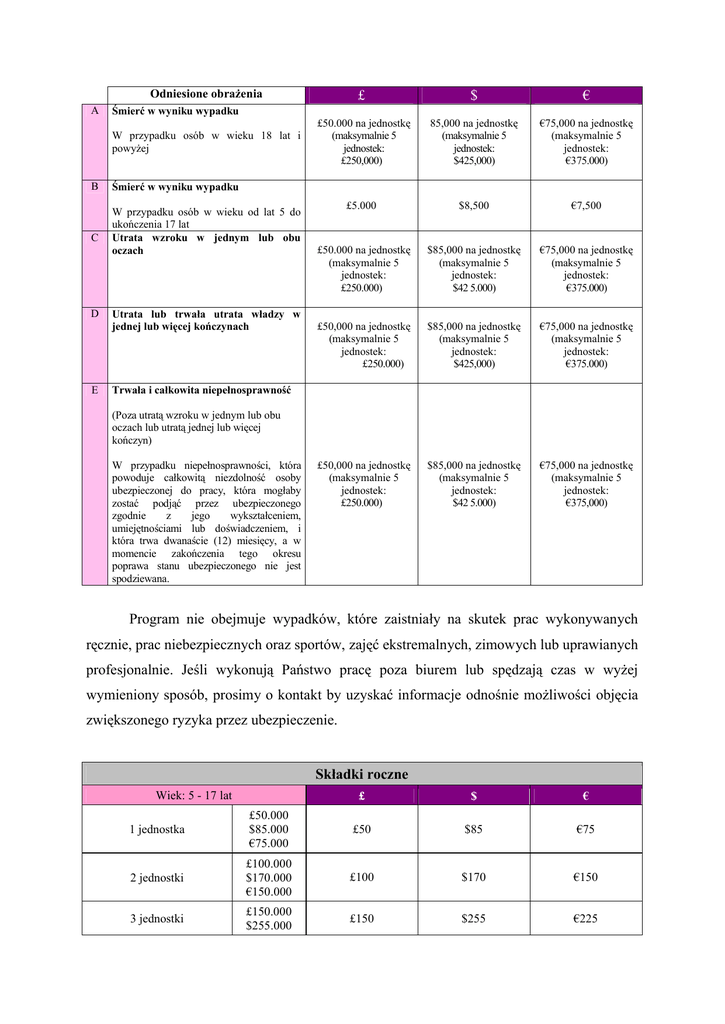 £ $ € £50.000 na jednostkę (maksymalnie 5 jednostek: £250,000) 85,000 na jednostkę (maksymalnie 5 jednostek: $425,000) €75,000 na jednostkę (maksymalnie 5 jednostek: €375.000) £5.000 $8,500 €7,500 £50.000 na jednostkę (maksymalnie 5 jednostek: £250.000) $85,000 na jednostkę (maksymalnie 5 jednostek: $42 5.000) €75,000 na jednostkę (maksymalnie 5 jednostek: €375.000) £50,000 na jednostkę (maksymalnie 5 jednostek: £250.000) $85,000 na jednostkę (maksymalnie 5 jednostek: $425,000) €75,000 na jednostkę (maksymalnie 5 jednostek: €375.000) £50,000 na jednostkę (maksymalnie 5 jednostek: £250.000) $85,000 na jednostkę (maksymalnie 5 jednostek: $42 5.000) €75,000 na jednostkę (maksymalnie 5 jednostek: €375,000) Odniesione obrażenia A Śmierć w wyniku wypadku W przypadku osób w wieku 18 lat i powyżej B C D E Śmierć w wyniku wypadku W przypadku osób w wieku od lat 5 do ukończenia 17 lat Utrata wzroku w jednym lub obu oczach Utrata lub trwała utrata władzy w jednej lub więcej kończynach Trwała i całkowita niepełnosprawność (Poza utratą wzroku w jednym lub obu oczach lub utratą jednej lub więcej kończyn) W przypadku niepełnosprawności, która powoduje całkowitą niezdolność osoby ubezpieczonej do pracy, która mogłaby zostać podjąć przez ubezpieczonego zgodnie z jego wykształceniem, umiejętnościami lub doświadczeniem, i która trwa dwanaście (12) miesięcy, a w momencie zakończenia tego okresu poprawa stanu ubezpieczonego nie jest spodziewana. Program nie obejmuje wypadków, które zaistniały na skutek prac wykonywanych ręcznie, prac niebezpiecznych oraz sportów, zajęć ekstremalnych, zimowych lub uprawianych profesjonalnie. Jeśli wykonują Państwo pracę poza biurem lub spędzają czas w wyżej wymieniony sposób, prosimy o kontakt by uzyskać informacje odnośnie możliwości objęcia zwiększonego ryzyka przez ubezpieczenie. Składki roczne Wiek: 5 - 17 lat £ $ € 1 jednostka £50.000 $85.000 €75.000 £50 $85 €75 2 jednostki £100.000 $170.000 €150.000 £100 $170 €150 3 jednostki £150.000 $255.000 £150 $255 €225 €225.000 4 jednostki £200.000 $340.000 €300.000 £200 $340 €300 5 jednostek £250.000 $340.000 €375.000 £250 $425 €375 Wiek: 18 - 74 lat 1 jednostka £ 50.000 $85.000 €75.000 £83 $142 €125 2 jednostki £100.000 $170.000 €150.000 £166 $284 €250 3 jednostki £150.000 $255.000 €225.000 £249 $426 €375 4 jednostki £200.000 $340.000 €300.000 £332 $568 €500 5 jednostek £250.000 $340.000 €375.000 £415 $710 €625