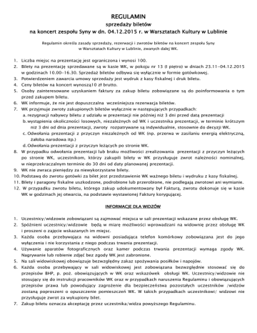 REGULAMIN sprzedaży biletów na koncert zespołu Syny w dn. 04.12.2015 r. w Warsztatach Kultury w Lublinie Regulamin określa zasady sprzedaży, rezerwacji i zwrotów biletów na koncert zespołu Syny w Warsztatach Kultury w Lublinie, zwanych dalej WK. 1. Liczba miejsc na prezentację jest ograniczona i wynosi 100. 2. Bilety na prezentację sprzedawane są w kasie WK, w pokoju nr 13 (I piętro) w dniach 23.11-04.12.2015 w godzinach 10.00-16.30. Sprzedaż biletów odbywa się wyłącznie w formie gotówkowej. 3. Potwierdzeniem zawarcia umowy sprzedaży jest wydruk z kasy fiskalnej i druk biletu. 4. Ceny biletów na koncert wynoszą10 zł brutto. 5. Osoby zainteresowane uzyskaniem faktury za zakup biletu zobowiązane są do poinformowania o tym przed zakupem biletu. 6. WK informuje, że nie jest dopuszczalna wcześniejsza rezerwacja biletów. 7. WK przyjmuje zwroty zakupionych biletów wyłącznie w następujących przypadkach: a. rezygnacji nabywcy biletu z udziału w prezentacji nie później niż 3 dni przed datą prezentacji b. wystąpienia okoliczności losowych, niezależnych od WK i uczestnika prezentacji, w terminie krótszym niż 3 dni od dnia prezentacji, zwroty rozpatrywane są indywidualnie, stosownie do decyzji WK. c. Odwołania prezentacji z przyczyn niezależnych od WK (np. przerwa w zasilaniu energią elektryczną, żałoba narodowa itp.) d. Odwołania prezentacji z przyczyn leżących po stronie WK. 8. W przypadku odwołania prezentacji lub braku możliwości zrealizowania prezentacji z przyczyn leżących po stronie WK, uczestnikom, którzy zakupili bilety w WK przysługuje zwrot należności nominalnej, w nieprzekraczalnym terminie do 30 dni od daty planowanej prezentacji. 9. WK nie zwraca pieniędzy za niewykorzystane bilety. 10. Podstawą do zwrotu gotówki za bilet jest przedstawienie WK ważnego biletu i wydruku z kasy fiskalnej. 11. Bilety i paragony fiskalne uszkodzone, podrobione lub przerobione, nie podlegają zwrotowi ani wymianie. 12. W przypadku zwrotu biletu, którego zakup udokumentowany był Fakturą, zwrotu dokonuje się w kasie WK w godzinach jej otwarcia, na podstawie wystawionej Faktury korygującej. INFORMACJE DLA WIDZÓW 1. Uczestnicy/widzowie zobowiązani są zajmować miejsca w sali prezentacji wskazane przez obsługę WK. 2. Spóźnieni uczestnicy/widzowie będą w miarę możliwości wprowadzani na widownię przez obsługę WK i proszeni o zajęcie wskazanych im miejsc. 3. Każda osoba przebywająca na widowni posiadająca telefon komórkowy zobowiązana jest do jego wyłączenia i nie korzystania z niego podczas trwania prezentacji. 4. Używanie aparatów fotograficznych oraz kamer podczas trwania prezentacji wymaga zgody WK. Nagrywanie lub robienie zdjęć bez zgody WK jest zabronione. 5. Na sali widowiskowej obowiązuje bezwzględny zakaz spożywania posiłków i napojów. 6. Każda osoba przebywający w sali widowiskowej jest zobowiązana bezwzględnie stosować się do przepisów BHP, p. poż. obowiązujących w WK oraz wskazówek obsługi WK. Uczestnicy/widzowie nie stosujący się do instrukcji pracowników WK oraz w przypadkach naruszenia Regulaminu i obowiązujących przepisów prawa lub powodujący zagrożenie dla bezpieczeństwa pozostałych uczestników /widzów zostaną poproszeni o opuszczenie pomieszczeń WK. W takich przypadkach uczestnikowi/ widzowi nie przysługuje zwrot za wykupiony bilet. 7. Zakup biletu oznacza akceptację przez uczestnika/widza powyższego Regulaminu.