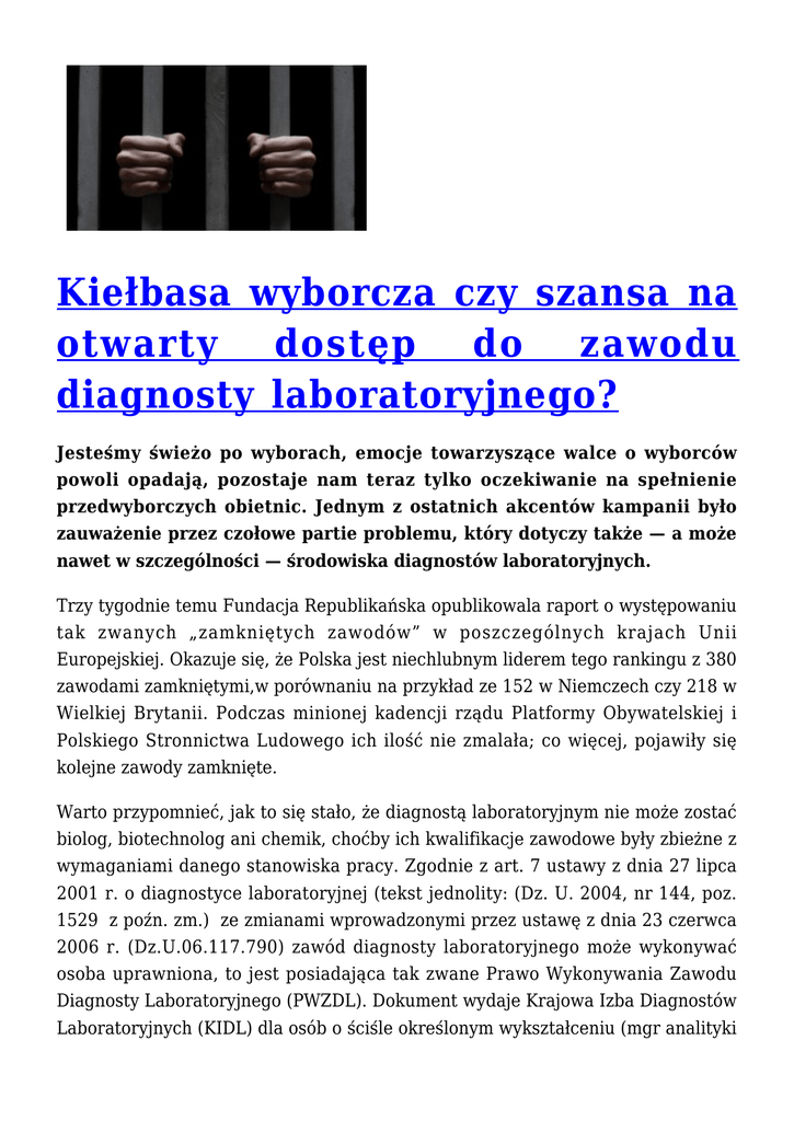 Kiełbasa wyborcza czy szansa na otwarty dostęp do zawodu diagnosty laboratoryjnego? Jesteśmy świeżo po wyborach, emocje towarzyszące walce o wyborców powoli opadają, pozostaje nam teraz tylko oczekiwanie na spełnienie przedwyborczych obietnic. Jednym z ostatnich akcentów kampanii było zauważenie przez czołowe partie problemu, który dotyczy także — a może nawet w szczególności — środowiska diagnostów laboratoryjnych. Trzy tygodnie temu Fundacja Republikańska opublikowala raport o występowaniu tak zwanych „zamkniętych zawodów” w poszczególnych krajach Unii Europejskiej. Okazuje się, że Polska jest niechlubnym liderem tego rankingu z 380 zawodami zamkniętymi,w porównaniu na przykład ze 152 w Niemczech czy 218 w Wielkiej Brytanii. Podczas minionej kadencji rządu Platformy Obywatelskiej i Polskiego Stronnictwa Ludowego ich ilość nie zmalała; co więcej, pojawiły się kolejne zawody zamknięte. Warto przypomnieć, jak to się stało, że diagnostą laboratoryjnym nie może zostać biolog, biotechnolog ani chemik, choćby ich kwalifikacje zawodowe były zbieżne z wymaganiami danego stanowiska pracy. Zgodnie z art. 7 ustawy z dnia 27 lipca 2001 r. o diagnostyce laboratoryjnej (tekst jednolity: (Dz. U. 2004, nr 144, poz. 1529 z poźn. zm.) ze zmianami wprowadzonymi przez ustawę z dnia 23 czerwca 2006 r. (Dz.U.06.117.790) zawód diagnosty laboratoryjnego może wykonywać osoba uprawniona, to jest posiadająca tak zwane Prawo Wykonywania Zawodu Diagnosty Laboratoryjnego (PWZDL). Dokument wydaje Krajowa Izba Diagnostów Laboratoryjnych (KIDL) dla osób o ściśle określonym wykształceniu (mgr analityki medycznej) lub dla tych, którzy kształcili się podyplomowo na tym kierunku i zdali egzamin państwowy. Tak więc żadna inna osoba po kierunku biomedycznym nie może samodzielnie wykonywać czynności diagnostyki laboratoryjnej. Uderza to nie tylko w absolwentów, ale także w jakość badań laboratoryjnych i ich innowacyjność. Według KIDL wszystko jest jednak w porządku i tak ma pozostać. Czy warto mieć nadzieję na zmiany w najbliższych latach? Politycy Ruchu Poparcia Palikota i Prawa i Sprawiedliwości przekonują, że jak najbardziej. Czy opozycji uda się dopilnować, aby rząd nie poddawał się lobby poszczególnych grup interesów, a wręcz wykonał krok w przeciwnym kierunku? Niestety w przypadku zawodu diagnosty laboratoryjnego bez woli samych zainteresowanych może to być problematyczne — jako „zawód zaufania publicznego”, podobnie jak profesja lekarza, diagnostyka nie doczeka się rychłych zmian, chyba że atmosfera w samym KIDL się zmieni niedawno mianowana prezes Elżbieta Puacz, jako mikrobiolog, wydaje się dostrzegać problem, a podnoszenie przez polityków kwestii zamkniętych zawodów może być doskonałym katalizatorem zmian. Polska jest jednym z niewielu państw europejskich, w których zawód diagnosty laboratoryjnego należy do listy tak zwanych zawodów zamkniętych Data publikacji: 13.10.2011r.