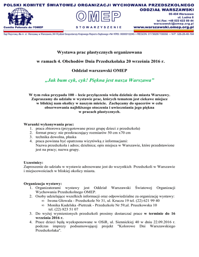 Wystawa prac plastycznych organizowana w ramach 4. Obchodów Dnia Przedszkolaka 20 września 2016 r. Oddział warszawski OMEP „Jak bum cyk, cyk! Piękna jest nasza Warszawa” W tym roku przypada 100 – lecie przyłączenia wielu dzielnic do miasta Warszawy. Zapraszamy do udziału w wystawie prac, których tematem jest ciekawe miejsce w bliskiej nam okolicy w naszym mieście. Zachęcamy do spacerów w celu obserwowania najbliższego otoczenia i uwieczniania jego piękna w pracach plastycznych. Warunki wykonywania prac: 1. praca zbiorowa (przygotowane przez grupę dzieci z przedszkola) 2. format pracy: nie przekraczający rozmiarów 50 cm x70 cm 3. technika dowolna, płaska 4. praca powinna być opatrzona wizytówką z informacjami: Nazwa przedszkola i adres; dzielnica; opis miejsca w Warszawie, które przedstawione jest na pracy; nazwa grupy. Uczestnicy: Zaproszenie do udziału w wystawie adresowane jest do wszystkich Przedszkoli w Warszawie i miejscowościach w bliskiej okolicy miasta. Organizacja wystawy: 1. Organizatorami wystawy jest Oddział Warszawski Światowej Organizacji Wychowania Przedszkolnego OMEP. 2. Osoby udzielające wszelkich informacji oraz odpowiedzialne za organizację wystawy: • Iwona Głowala - Przedszkole Nr 31, ul. Krucza 19 tel. (22) 621 99 40 • Monika Kudelska -Pietrzak - Przedszkole Nr 59,ul. Pruszkowska 10 tel. (22) 823 51 07 3. Do wyżej wymienionych przedszkoli prosimy dostarczać prace w terminie do 16 września 2016 r. 4. Prace dzieci będą wyeksponowane w OSiR, ul. Siennickiej 40 w dniu 22.09.2016 r. podczas imprezy podsumowującej projekt "Kolorowe Dni Warszawskiego Przedszkolaka". 5. Prace będą sfotografowane i zaprezentowane przez Organizatora między innymi na stronach internetowych Komitetu OMEP i oddziału warszawskiego oraz na ich profilach na Facebooku. Prosimy w związku z tym o dołączenie pisemnej zgody na upublicznienie pracy. Potwierdzenie udziału: Prosimy o przesyłanie potwierdzeń udziału w wystawie prac do dnia 12 września 2016 r. na adres mail [email protected] Wyróżnienia za udział w wystawie: Każde Przedszkole, które nadeśle pracę na konkurs otrzyma pamiątkowe dyplomy i niespodzianki książkowe. Zapraszamy do prezentacji piękna Warszawy!