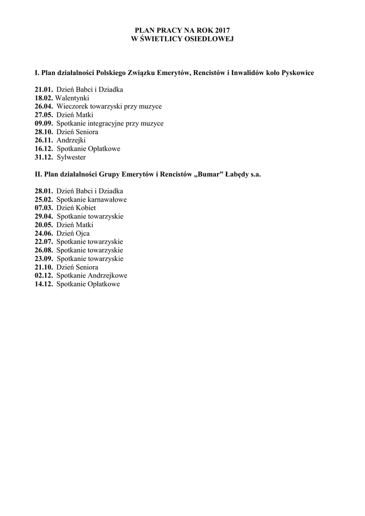 PLAN PRACY NA ROK 2017 W ŚWIETLICY OSIEDLOWEJ I. Plan działalności Polskiego Związku Emerytów, Rencistów i Inwalidów koło Pyskowice 21.01. Dzień Babci i Dziadka 18.02. Walentynki 26.04. Wieczorek towarzyski przy muzyce 27.05. Dzień Matki 09.09. Spotkanie integracyjne przy muzyce 28.10. Dzień Seniora 26.11. Andrzejki 16.12. Spotkanie Opłatkowe 31.12. Sylwester II. Plan działalności Grupy Emerytów i Rencistów „Bumar” Łabędy s.a. 28.01. 25.02. 07.03. 29.04. 20.05. 24.06. 22.07. 26.08. 23.09. 21.10. 02.12. 14.12. Dzień Babci i Dziadka Spotkanie karnawałowe Dzień Kobiet Spotkanie towarzyskie Dzień Matki Dzień Ojca Spotkanie towarzyskie Spotkanie towarzyskie Spotkanie towarzyskie Dzień Seniora Spotkanie Andrzejkowe Spotkanie Opłatkowe