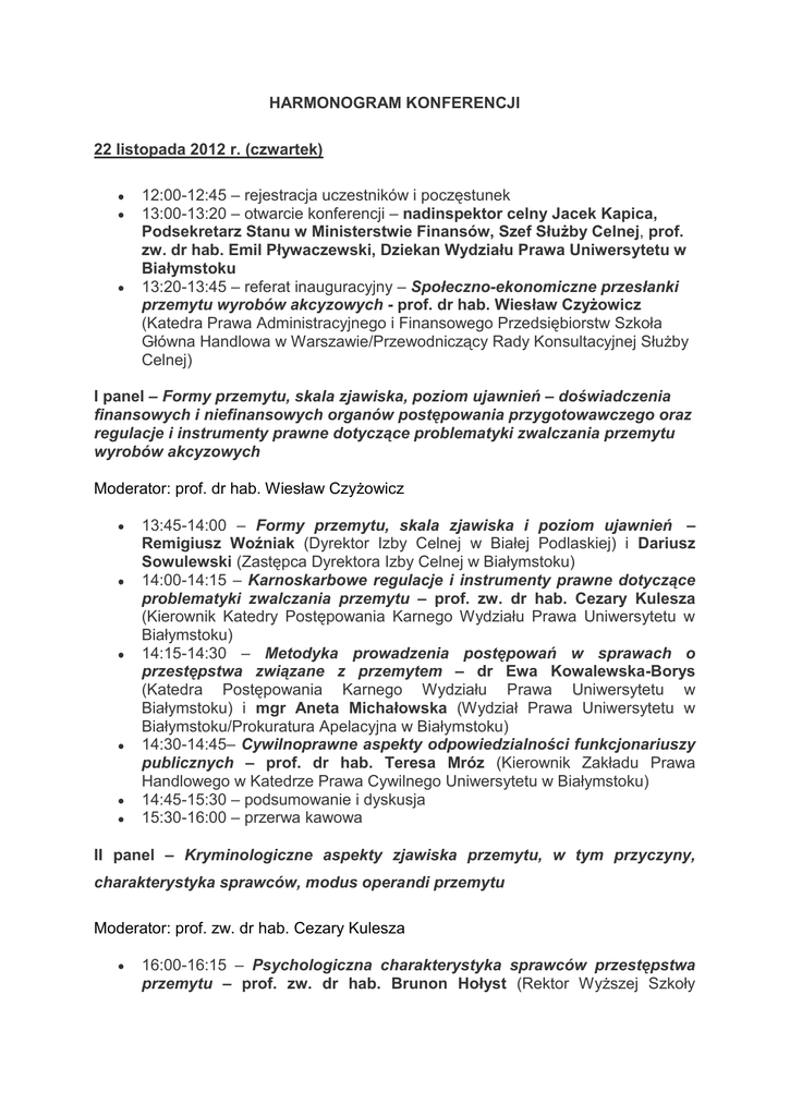 HARMONOGRAM KONFERENCJI 22 listopada 2012 r. (czwartek) 12:00-12:45 – rejestracja uczestników i poczęstunek 13:00-13:20 – otwarcie konferencji – nadinspektor celny Jacek Kapica, Podsekretarz Stanu w Ministerstwie Finansów, Szef Służby Celnej, prof. zw. dr hab. Emil Pływaczewski, Dziekan Wydziału Prawa Uniwersytetu w Białymstoku 13:20-13:45 – referat inauguracyjny – Społeczno-ekonomiczne przesłanki przemytu wyrobów akcyzowych - prof. dr hab. Wiesław Czyżowicz (Katedra Prawa Administracyjnego i Finansowego Przedsiębiorstw Szkoła Główna Handlowa w Warszawie/Przewodniczący Rady Konsultacyjnej Służby Celnej) I panel – Formy przemytu, skala zjawiska, poziom ujawnień – doświadczenia finansowych i niefinansowych organów postępowania przygotowawczego oraz regulacje i instrumenty prawne dotyczące problematyki zwalczania przemytu wyrobów akcyzowych Moderator: prof. dr hab. Wiesław Czyżowicz 13:45-14:00 – Formy przemytu, skala zjawiska i poziom ujawnień – Remigiusz Woźniak (Dyrektor Izby Celnej w Białej Podlaskiej) i Dariusz Sowulewski (Zastępca Dyrektora Izby Celnej w Białymstoku) 14:00-14:15 – Karnoskarbowe regulacje i instrumenty prawne dotyczące problematyki zwalczania przemytu – prof. zw. dr hab. Cezary Kulesza (Kierownik Katedry Postępowania Karnego Wydziału Prawa Uniwersytetu w Białymstoku) 14:15-14:30 – Metodyka prowadzenia postępowań w sprawach o przestępstwa związane z przemytem – dr Ewa Kowalewska-Borys (Katedra Postępowania Karnego Wydziału Prawa Uniwersytetu w Białymstoku) i mgr Aneta Michałowska (Wydział Prawa Uniwersytetu w Białymstoku/Prokuratura Apelacyjna w Białymstoku) 14:30-14:45– Cywilnoprawne aspekty odpowiedzialności funkcjonariuszy publicznych – prof. dr hab. Teresa Mróz (Kierownik Zakładu Prawa Handlowego w Katedrze Prawa Cywilnego Uniwersytetu w Białymstoku) 14:45-15:30 – podsumowanie i dyskusja 15:30-16:00 – przerwa kawowa II panel – Kryminologiczne aspekty zjawiska przemytu, w tym przyczyny, charakterystyka sprawców, modus operandi przemytu Moderator: prof. zw. dr hab. Cezary Kulesza 16:00-16:15 – Psychologiczna charakterystyka sprawców przestępstwa przemytu – prof. zw. dr hab. Brunon Hołyst (Rektor Wyższej Szkoły Menedżerskiej w Warszawie, Zakład Kryminalistyki Wydziału Prawa i Administracji Uniwersytetu Łódzkiego) 16:15-16:30 – Charakterystyka sprawców przestępstw przemytniczych – wyniki badań własnych – dr Magdalena Perkowska (Wydział Prawa Uniwersytetu w Białymstoku) 16:30-16:45 – Charakterystyka sprawców z punktu widzenia prowadzonych spraw karnych skarbowych w Urzędzie Celnym w Białymstoku – Robert Kruszewski (Kierownik Referatu DochodzeniowoŚledczego Urzędu Celnego w Białymstoku) 16:45-17:00 – Zjawisko przemytu na tle nielegalnych rynków – ujęcie lokalne, regionalne i globalne problemu – prof. dr hab. Wiesław Pływaczewski (Kierownik Katedry Kryminologii i Polityki Kryminalnej Wydziału Prawa i Administracji Uniwersytetu Warmińsko-Mazurskiego w Olsztynie) 17:00-17:30 – podsumowanie i dyskusja 18:30 – uroczysta kolacja 23 listopada 2012 r. (piątek) III Panel – Zasady, interpretacja oraz postępowanie w przedmiocie zwolnień towarów przywożonych w bagażu osobistym podróżnych z VAT i akcyzy, stosownie do postanowień Dyrektywy Rady 2007/74/WE z dnia 20 grudnia 2007 r. Moderator: prof. dr hab. Teresa Mróz 9:00-9:15 – Regulacje prawne w zakresie zwolnień celnych dla podróżnych – Tomasz Michalak (Dyrektor Departamentu Polityki Celnej w Ministerstwie Finansów) 9:15-9:30 – Problematyka zwolnień towarów przywożonych w bagażu osobistym podróżnych z VAT i akcyzy w świetle Dyrektywy Rady 2007/74/WE z dn. 20 grudnia 2007r. – dr Mirosława Laszuk (Katedra Ekonomii i Nauk Społecznych Wydziału Zarządzania Politechniki Białostockiej) 9:30-9:45 – Implementacja Dyrektywy Rady 2007/74/WE z 20 grudnia 2007 r. w polskim systemie prawnym – wybrane zagadnienia – dr Piotr Stanisławiszyn (Kierownik Zakładu Prawa Finansowego Wydziału Prawa i Administracji Uniwersytetu Opolskiego/Sędzia Sądu Rejonowego w Strzelcach Opolskich) i Tomasz Nowak (Starszy Ekspert Służby Celnej w Izbie Celnej w Opolu) 9:45-10:15 – podsumowanie i dyskusja 10:15-10:45 – przerwa kawowa IV Panel – Praktyka postępowania w zakresie konsekwencji prawnych osób nielegalnie wprowadzających towary (wyroby akcyzowe) na obszar UE (zasady wymiaru kary i środków karnych) Moderator: Z-ca Dyrektora Izby Celnej w Białymstoku Maciej Fiłończuk 10:45-11:00 – Stosowanie kar i środków karnych w sprawach o przestępstwa skarbowe i wykroczenia skarbowe na tle katalogu przewidzianego w k.k.s. oraz ustawowych zasad wymiaru – Beata Szyryńska (Kierownik Referatu Dochodzeniowo-Śledczego Izby Celnej w Białymstoku) 11:00-11:15 – Sankcyjność wymierzanych kar i środków karnych oraz sądowy wymiar kary w świetle praktyki organów prokuratury – Krzysztof Wojdakowski (Naczelnik Wydziału V ds. Przestępczości Zorganizowanej i Korupcji Prokuratury Apelacyjnej w Białymstoku) 11:15-11:30 – Sankcyjność wymierzanych kar i środków karnych oraz sądowy wymiar kary w świetle orzecznictwa sądów powszechnych – Przemysław Wasilewski (Sędzia Sądu Okręgowego w Białymstoku/Rzecznik Prasowy) 11:30-11:45 – Sankcja karna za przestępstwo przemytu – prof. dr hab. Grażyna Szczygieł (Katedra Prawa Karnego Uniwersytetu w Białymstoku) 11:45-12:00 – Kary i środki karne za przemyt stosowane w Polsce i w innych Państwach Członkowskich Unii Europejskiej - Mirosław Świderek (Naczelnik Wydziału Dochodzeń Departamentu Kontroli Celno-Akcyzowej i Kontroli Gier w Ministerstwie Finansów) 12:00-12:15 – Głos przeciwko aktualnemu zakazowi orzekania przez sąd karny przepadku przedmiotów tytułem środka zabezpieczającego po uprzednim nałożeniu na sprawcę wykroczenia celnego (zwłaszcza akcyzowego) kary grzywny w drodze prawomocnego m